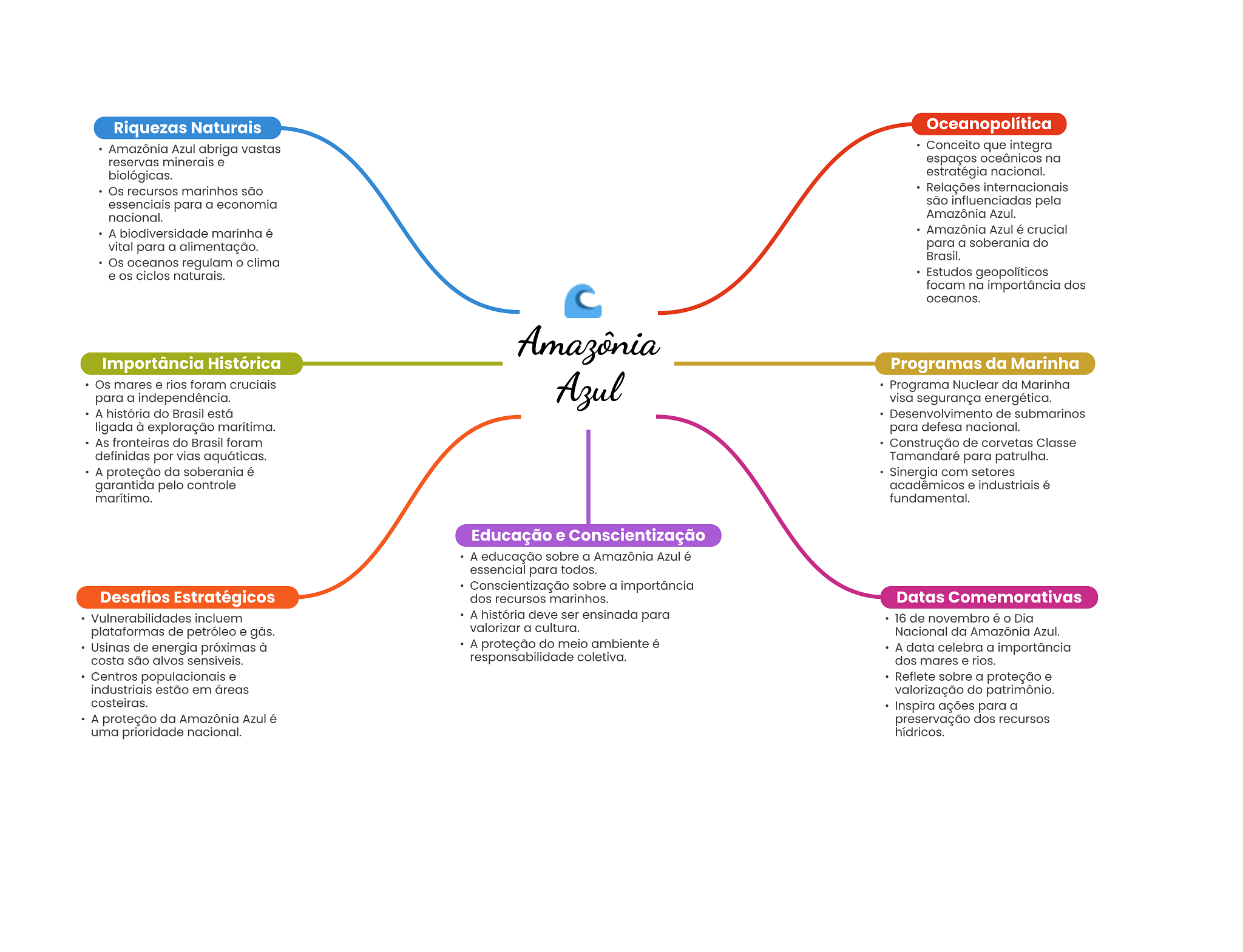 Riquezas Naturais Oceanopolítica Amazônia Azul abriga vastas Conceito que integra reservas minerais e espaços oceânicos na biológicas. estratégia nacional. Os recursos marinhos são Relações internacionais essenciais para a economia são influenciadas pela nacional. Amazônia Azul. A biodiversidade marinha é Amazônia Azul é crucial vital para a alimentação. para a soberania do Brasil. Os oceanos regulam clima e OS ciclos naturais. Estudos geopolíticos focam na importância dos oceanos. Amazônia Importância Histórica Programas da Marinha Os mares e rios foram cruciais Azul Programa Nuclear da Marinha para a independência. visa segurança energética. A história do Brasil está Desenvolvimento de submarinos ligada à exploração marítima. para defesa nacional. As fronteiras do Brasil foram Construção de corvetas Classe definidas por vias aquáticas. Tamandaré para patrulha. A proteção da soberania é Sinergia com setores garantida pelo controle acadêmicos e industriais é marítimo. fundamental. Educação e Conscientização A educação sobre a Amazônia Azul é essencial para todos. Conscientização sobre a importância Desafios Estratégicos dos recursos marinhos. Datas Comemorativas Vulnerabilidades incluem A história deve ser ensinada para 16 de novembro é O Dia plataformas de petróleo e gás. valorizar a cultura. Nacional da Amazônia Azul. Usinas de energia próximas à A proteção do meio ambiente é A data celebra a importância costa são alvos sensíveis. responsabilidade coletiva. dos mares e rios. Centros populacionais e Reflete sobre a proteção e industriais estão em áreas valorização do patrimônio. costeiras. Inspira ações para a A proteção da Amazônia Azul é preservação dos recursos uma prioridade nacional. hídricos.