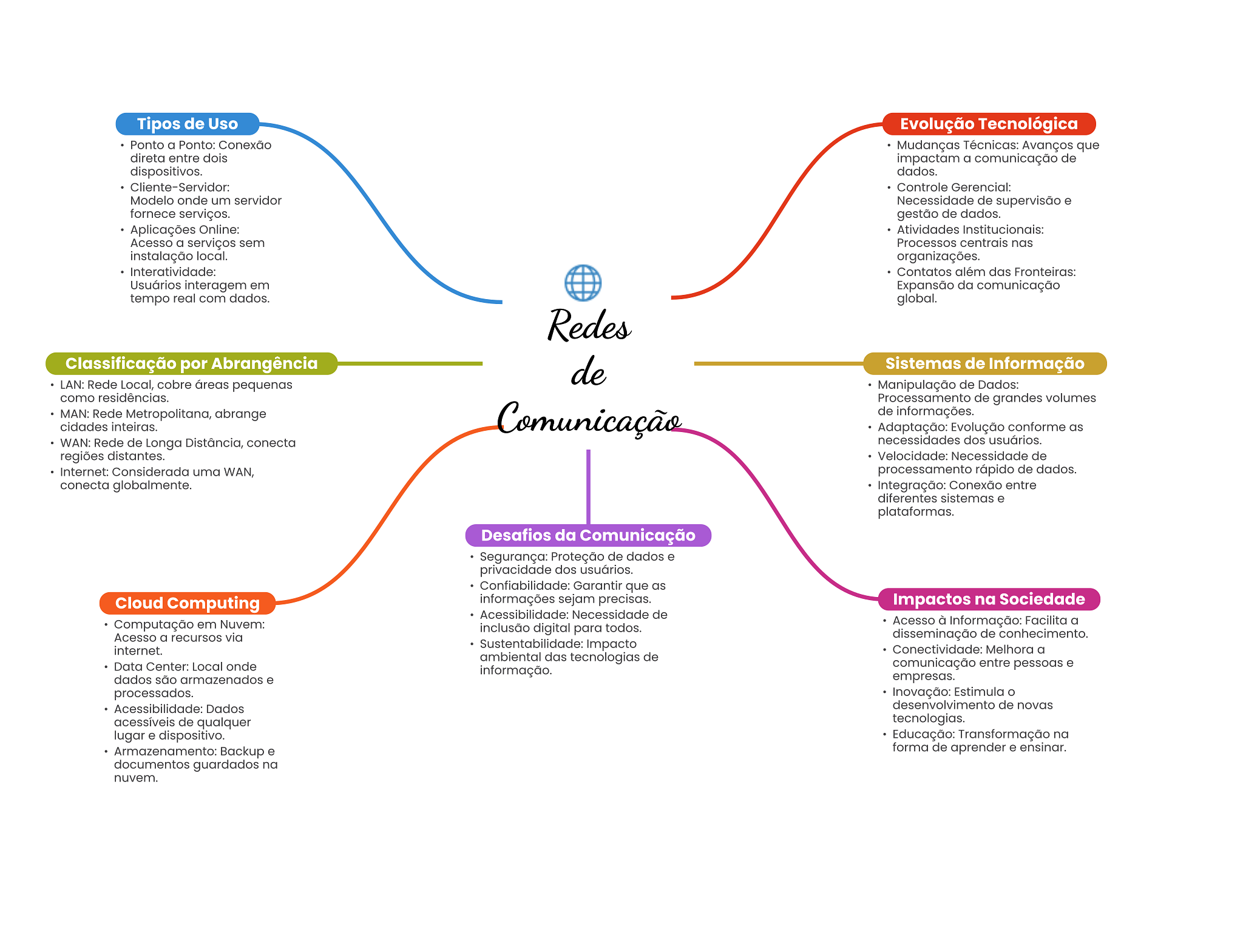 Tipos de Uso Evolução Tecnológica Ponto a Ponto: Conexão Mudanças Técnicas: Avanços que direta entre dois impactam a comunicação de dispositivos. dados. Cliente-Servidor: Controle Gerencial: Modelo onde um servidor Necessidade de supervisão e fornece serviços. gestão de dados. Aplicações Online: Atividades Institucionais: Acesso a serviços sem Processos centrais nas instalação local. organizações. Interatividade: Contatos além das Fronteiras: Usuários interagem em Expansão da comunicação tempo real com dados. global. Redes Classificação por Abrangência de Sistemas de Informação LAN: Rede Local, cobre áreas pequenas Manipulação de Dados: como residências. Processamento de grandes volumes MAN: Rede Metropolitana, abrange Comunicação de informações. cidades inteiras. Adaptação: Evolução conforme as WAN: Rede de Longa Distância, conecta necessidades dos usuários. regiões distantes. Velocidade: Necessidade de Internet: Considerada uma WAN, processamento rápido de dados. conecta globalmente. Integração: Conexão entre diferentes sistemas e plataformas. Desafios da Comunicação Segurança: Proteção de dados e privacidade dos usuários. Confiabilidade: Garantir que as Cloud Computing informações sejam precisas. Impactos na Sociedade Acessibilidade: Necessidade de Computação em Nuvem: Acesso à Informação: Facilita a inclusão digital para todos. Acesso a recursos via disseminação de conhecimento. internet. Sustentabilidade: Impacto Conectividade: Melhora a ambiental das tecnologias de Data Center: Local onde comunicação entre pessoas e informação. dados são armazenados e empresas. processados. Inovação: Estimula O Acessibilidade: Dados desenvolvimento de novas acessíveis de qualquer tecnologias. lugar e dispositivo. Educação: Transformação na Armazenamento: Backup e forma de aprender e ensinar. documentos guardados na nuvem.
