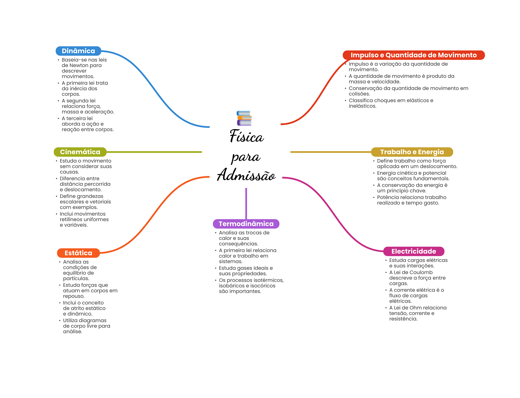 Dinâmica Impulso e Quantidade de Movimento Baseia-se nas leis de Newton para Impulso é a variação da quantidade de descrever movimento. movimentos. A quantidade de movimento é produto da A primeira lei trata massa e velocidade. da inércia dos Conservação da quantidade de movimento em corpos. colisões. A segunda lei Classifica choques em elásticos e relaciona força, inelásticos. massa e aceleração. A terceira lei aborda a ação e reação entre corpos. Física Cinemática Trabalho e Energia Estuda movimento para Define trabalho como força sem considerar suas aplicada em um deslocamento. causas. Admissão Energia cinética e potencial Diferencia entre são conceitos fundamentais. distância percorrida A conservação da energia é e deslocamento. um princípio chave. Define grandezas Potência relaciona trabalho escalares e vetoriais realizado e tempo gasto. com exemplos. Inclui movimentos retilíneos uniformes e variáveis. Termodinâmica Analisa as trocas de calor e suas consequências. Estática A primeira lei relaciona Electricidade calor e trabalho em Analisa as sistemas. Estuda cargas elétricas condições de Estuda gases ideais e e suas interações. equilíbrio de suas propriedades. A Lei de Coulomb partículas. Os processos isotérmicos, descreve a força entre Estuda forças que isobáricos e isocóricos cargas. atuam em corpos em são importantes. repouso. fluxo de cargas Inclui conceito elétricas. de atrito estático A Lei de Ohm relaciona e dinâmico. tensão, corrente e Utiliza diagramas resistência. de corpo livre para análise.