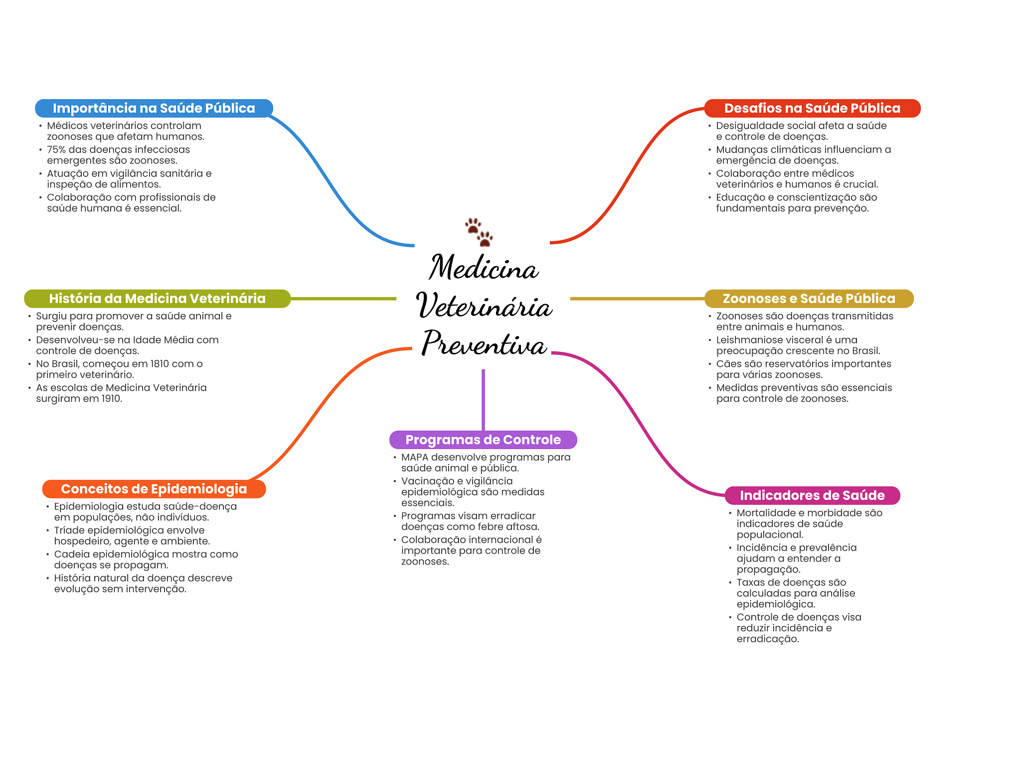 Importância na Saúde Pública Desafios na Saúde Pública Médicos veterinários controlam Desigualdade social afeta a saúde zoonoses que afetam humanos. e controle de doenças. 75% das doenças infecciosas Mudanças climáticas influenciam a emergentes são zoonoses. emergência de doenças. Atuação em vigilância sanitária e Colaboração entre médicos inspeção de alimentos. veterinários e humanos é crucial. Colaboração com profissionais de Educação e conscientização são saúde humana é essencial. fundamentais para prevenção. Medicina História da Medicina Veterinária Veterinária Zoonoses e Saúde Pública Surgiu para promover a saúde animal e Zoonoses são doenças transmitidas prevenir doenças. entre animais e humanos. Desenvolveu-se na Idade Média com controle de doenças. Preventiva Leishmaniose visceral é uma preocupação crescente no Brasil. No Brasil, começou em 1810 com Cães são reservatórios importantes primeiro veterinário. para várias zoonoses. As escolas de Medicina Veterinária Medidas preventivas são essenciais surgiram em 1910. para controle de zoonoses. Programas de Controle MAPA desenvolve programas para saúde animal e pública. Vacinação e vigilância Conceitos de Epidemiologia epidemiológica são medidas Indicadores de Saúde Epidemiologia estuda saúde-doença essenciais. em populações, não indivíduos. Programas visam erradicar Mortalidade e morbidade são Tríade epidemiológica envolve doenças como febre aftosa. indicadores de saúde hospedeiro, agente e ambiente. Colaboração internacional é populacional. importante para controle de Incidência e prevalência Cadeia epidemiológica mostra como zoonoses. ajudam a entender a doenças se propagam. propagação. História natural da doença descreve Taxas de doenças são evolução sem intervenção. calculadas para análise epidemiológica. Controle de doenças visa reduzir incidência e erradicação.