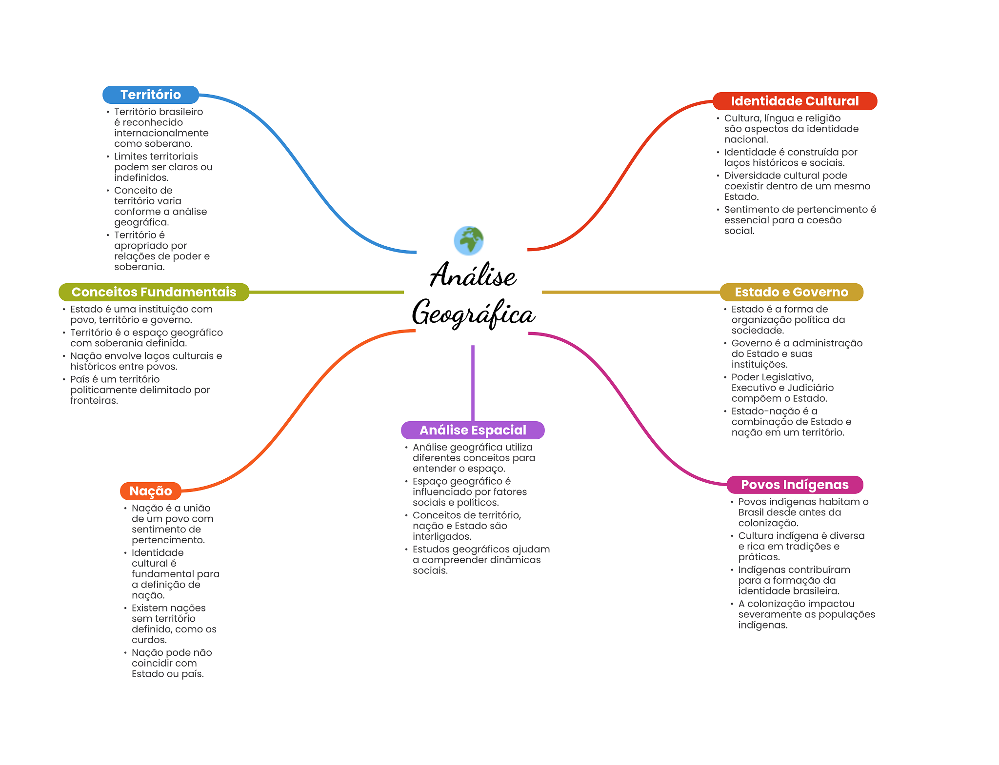 Território Identidade Cultural Território brasileiro é reconhecido Cultura, língua e religião internacionalmente são aspectos da identidade como soberano. nacional. Limites territoriais Identidade é construída por podem ser claros ou laços históricos e sociais. indefinidos. Diversidade cultural pode Conceito de coexistir dentro de um mesmo território varia Estado. conforme a análise Sentimento de pertencimento é geográfica. essencial para a coesão Território é social. apropriado por relações de poder e soberania. Análise Conceitos Fundamentais Estado e Governo Estado é uma instituição com Geográfica Estado é a forma de povo, território e governo. organização política da Território é espaço geográfico sociedade. com soberania definida. Governo é a administração Nação envolve laços culturais e do Estado e suas históricos entre povos. instituições. País é um território Poder Legislativo, politicamente delimitado por Executivo e Judiciário fronteiras. compõem Estado. Estado-nação é a combinação de Estado e Análise Espacial nação em um território. Análise geográfica utiliza diferentes conceitos para entender O espaço. Espaço geográfico é Nação Povos Indígenas influenciado por fatores Nação é a união sociais e políticos. Povos indígenas habitam O de um povo com Conceitos de território, Brasil desde antes da sentimento de nação e Estado são colonização. pertencimento. interligados. Cultura indígena é diversa Estudos geográficos ajudam e rica em tradições e Identidade a compreender dinâmicas práticas. cultural é fundamental para sociais. Indígenas contribuíram a definição de para a formação da identidade brasileira. nação. Existem nações A colonização impactou sem território severamente as populações definido, como indigenas. curdos. Nação pode não coincidir com Estado ou país.