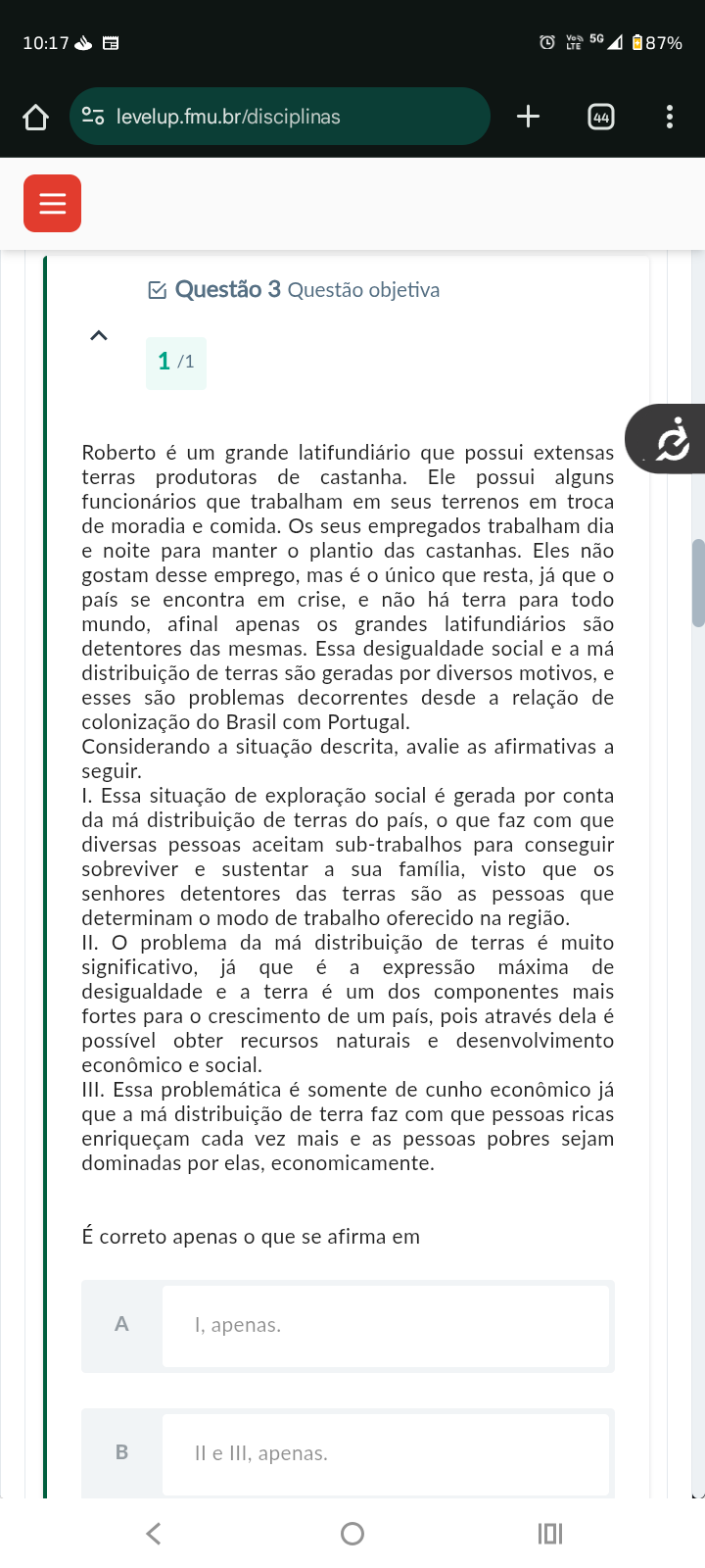 10:17 5G LTE 87% + 44 Questão 3 Questão objetiva 1 /1 Roberto é um grande latifundiário que possui extensas terras produtoras de castanha. Ele possui alguns funcionários que trabalham em seus terrenos em troca de moradia e comida. Os seus empregados trabalham dia e noite para manter plantio das castanhas. Eles não gostam desse emprego, mas é único que resta, já que país se encontra em crise, e não há terra para todo mundo, afinal apenas os grandes latifundiários são detentores das mesmas. Essa desigualdade social e a má distribuição de terras são geradas por diversos motivos, e esses são problemas decorrentes desde a relação de colonização do Brasil com Portugal. Considerando a situação descrita, avalie as afirmativas a seguir. I. Essa situação de exploração social é gerada por conta da má distribuição de terras do país, que faz com que diversas pessoas aceitam sub-trabalhos para conseguir sobreviver e sustentar a sua família, visto que os senhores detentores das terras são as pessoas que determinam O modo de trabalho oferecido na região. II. problema da má distribuição de terras é muito significativo, já que é a expressão máxima de desigualdade e a terra é um dos componentes mais fortes para O crescimento de um país, pois através dela é possível obter recursos naturais e desenvolvimento econômico e social. III. Essa problemática é somente de cunho econômico já que a má distribuição de terra faz com que pessoas ricas enriqueçam cada vez mais e as pessoas pobres sejam dominadas por elas, É correto apenas O que se afirma em A I, apenas. e III, apenas.
