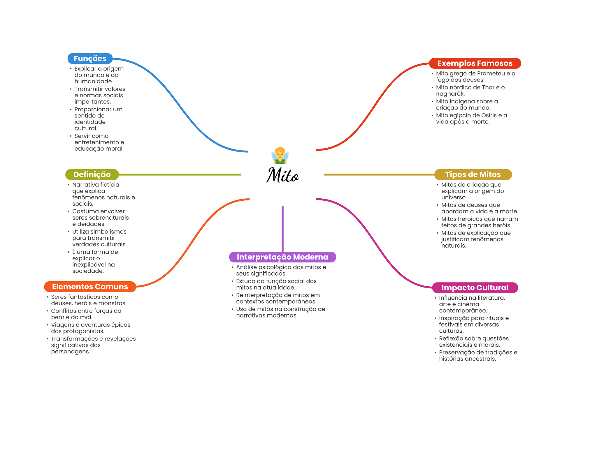 Funções Exemplos Famosos Explicar a origem do mundo e da Mito grego de Prometeu e humanidade. fogo dos deuses. Transmitir valores Mito nórdico de Thor e e normas sociais Ragnarök. importantes. Mito indígena sobre a Proporcionar um criação do mundo. sentido de Mito egípcio de Osíris e a identidade vida após a morte. cultural. Servir como entretenimento e educação moral. Definição Mito Tipos de Mitos Narrativa fictícia Mitos de criação que que explica explicam a origem do fenômenos naturais e universo. sociais. Mitos de deuses que Costuma envolver abordam a vida e a morte. seres sobrenaturais Mitos heroicos que narram e deidades. feitos de grandes heróis. Utiliza simbolismos Mitos de explicação que para transmitir justificam fenômenos verdades culturais. naturais. É uma forma de explicar o Interpretação Moderna inexplicável na Análise psicológica dos mitos e sociedade. seus significados. Estudo da função social dos Elementos Comuns mitos na atualidade. Impacto Cultural Seres fantásticos como Reinterpretação de mitos em Influência na literatura, deuses, heróis e monstros. contextos contemporâneos. arte e cinema Conflitos entre forças do Uso de mitos na construção de contemporâneo. bem e do mal. narrativas modernas. Inspiração para rituais e Viagens e aventuras épicas festivais em diversas dos protagonistas. culturas. Transformações e revelações Reflexão sobre questões significativas dos existenciais e morais. personagens. Preservação de tradições e histórias ancestrais.