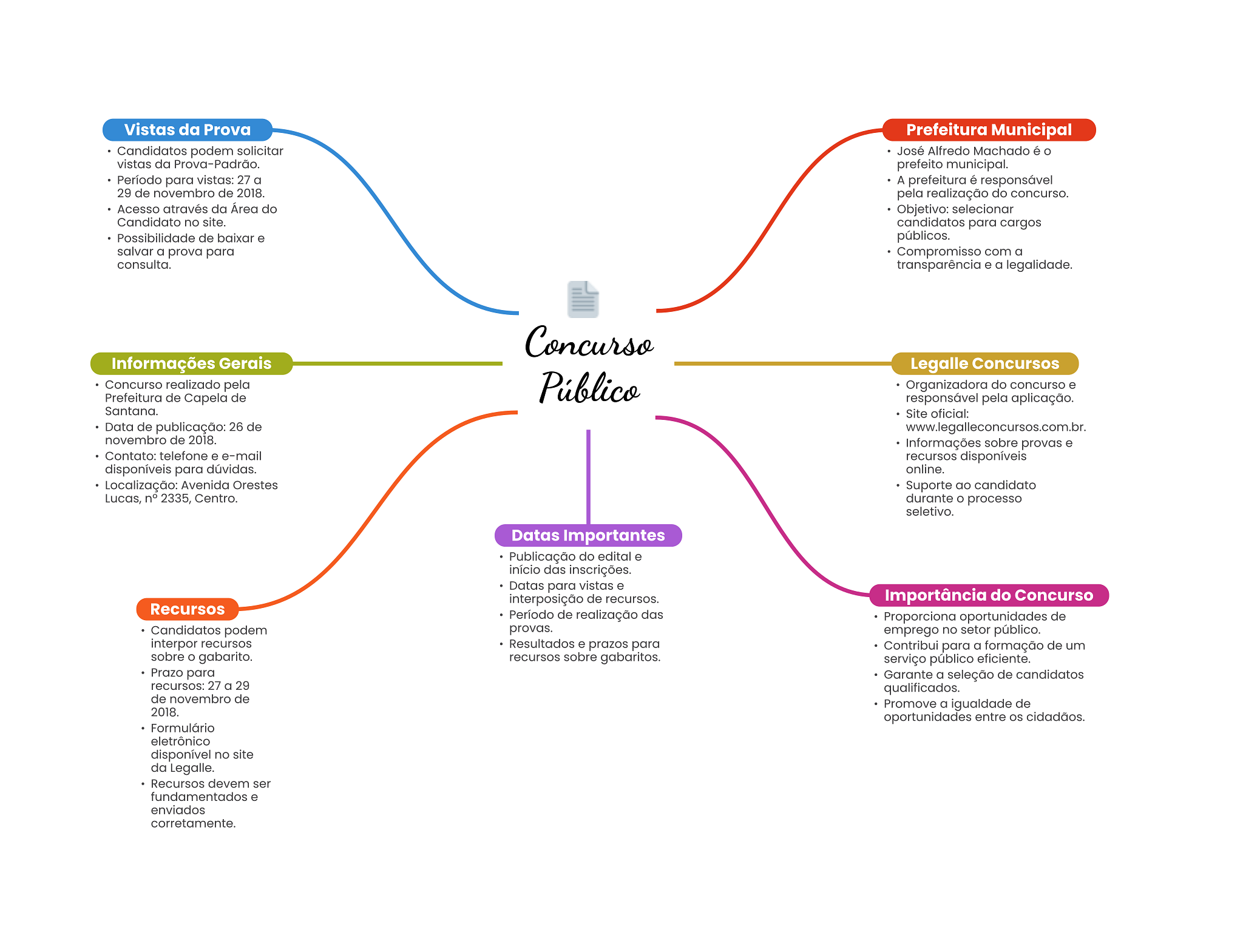 Vistas da Prova Prefeitura Municipal Candidatos podem solicitar José Alfredo Machado é o vistas da Prova-Padrão. prefeito municipal. Período para vistas: 27 a A prefeitura é responsável 29 de novembro de 2018. pela realização do concurso. Acesso através da Área do Objetivo: selecionar Candidato no site. candidatos para cargos Possibilidade de baixar e públicos. salvar a prova para Compromisso com a consulta. transparência e a legalidade. Concurso Informações Gerais Legalle Concursos Concurso realizado pela Público Organizadora do concurso e Prefeitura de Capela de responsável pela aplicação. Santana. Site oficial: Data de publicação: 26 de www.legalleconcursos.com.br. novembro de 2018. Informações sobre provas e Contato: telefone e e-mail recursos disponíveis disponíveis para dúvidas. online. Localização: Avenida Orestes Suporte ao candidato Lucas, n° 2335, Centro. durante O processo seletivo. Datas Importantes Publicação do edital e início das inscrições. Datas para vistas e interposição de recursos. Importância do Concurso Recursos Período de realização das Proporciona oportunidades de Candidatos podem provas. emprego no setor público. interpor recursos Resultados e prazos para Contribui para a formação de um sobre gabarito. recursos sobre gabaritos. serviço público eficiente. Prazo para Garante a seleção de candidatos recursos: 27 a 29 qualificados. de novembro de Promove a igualdade de 2018. oportunidades entre cidadãos. Formulário eletrônico disponível no site da Legalle. Recursos devem ser fundamentados e enviados corretamente.