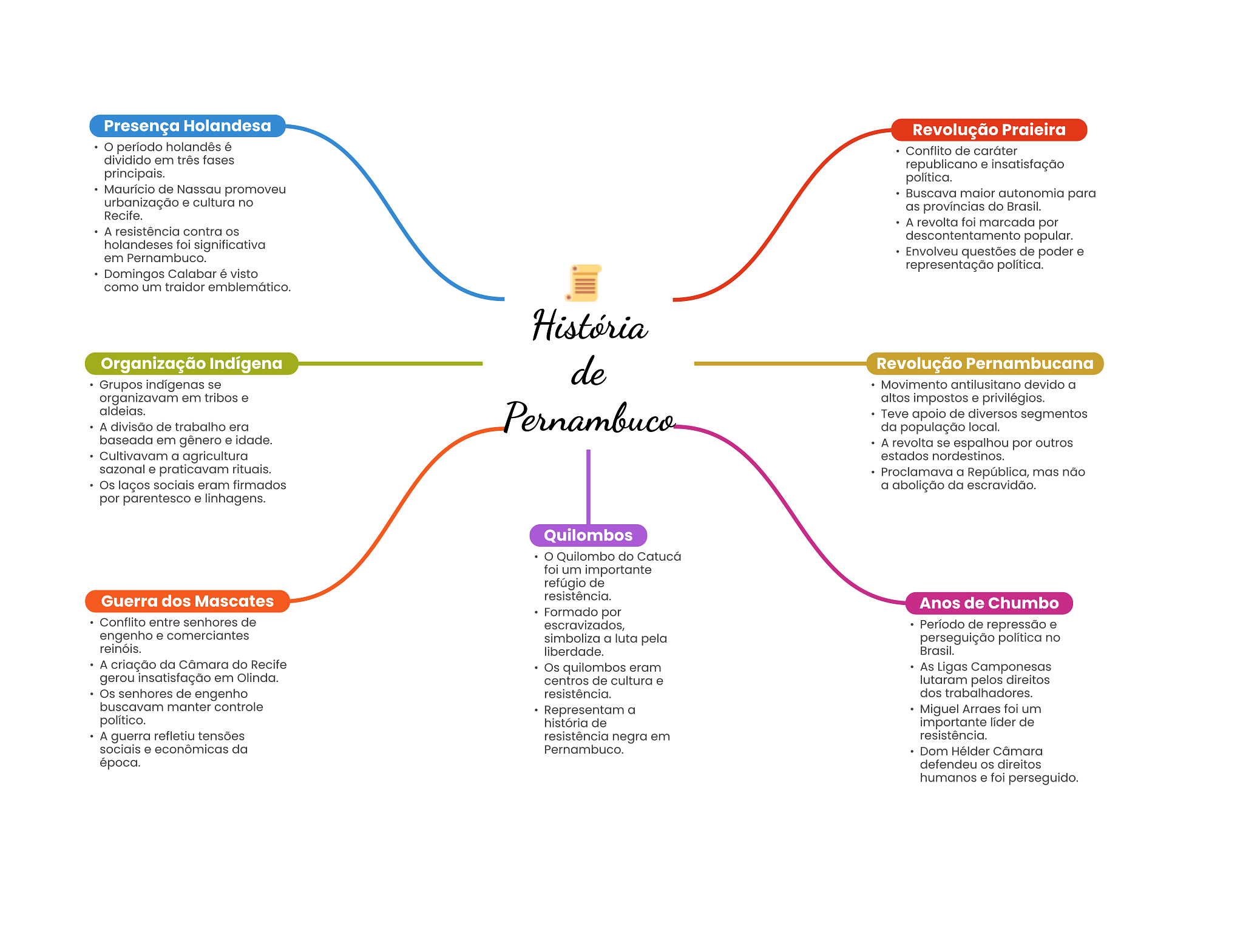 Presença Holandesa Revolução Praieira período holandês é Conflito de caráter dividido em três fases republicano e insatisfação principais. política. Maurício de Nassau promoveu Buscava maior autonomia para urbanização e cultura no as províncias do Brasil. Recife. A revolta foi marcada por A resistência contra popular. holandeses foi significativa em Pernambuco. Envolveu questões de poder e representação política. Domingos Calabar é visto como um traidor emblemático. História Organização Indígena de Revolução Pernambucana Grupos indígenas se Movimento antilusitano devido a organizavam em tribos e altos impostos e privilégios. aldeias. A divisão de trabalho era Pernambuco Teve apoio de diversos segmentos da população local. baseada em gênero e idade. A revolta se espalhou por outros Cultivavam a agricultura estados nordestinos. sazonal e praticavam rituais. Proclamava a República, mas não Os laços sociais eram firmados a abolição da escravidão. por parentesco e linhagens. Quilombos Quilombo do Catucá foi um importante refúgio de Guerra dos Mascates resistência. Anos de Chumbo Formado por Conflito entre senhores de escravizados, Período de repressão e engenho e comerciantes simboliza a luta pela perseguição política no reinóis. liberdade. Brasil. A criação da Câmara do Recife Os quilombos eram As Ligas Camponesas gerou insatisfação em Olinda. centros de cultura e lutaram pelos direitos Os senhores de engenho resistência. dos trabalhadores. buscavam manter controle Representam a Miguel Arraes foi um político. história de importante líder de A guerra refletiu tensões resistência negra em resistência. sociais e econômicas da Pernambuco. Dom Hélder Câmara época. defendeu direitos humanos e foi perseguido.