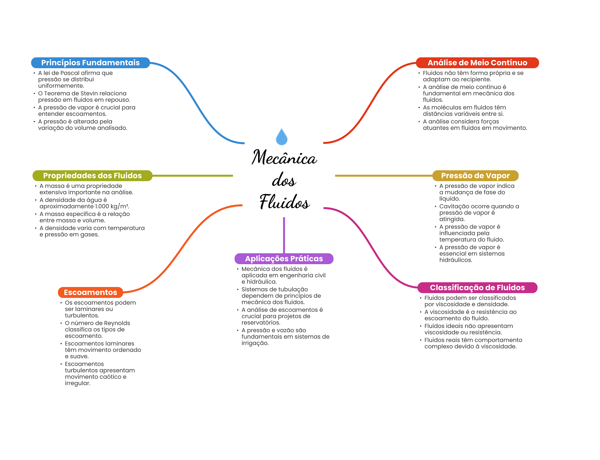 Princípios Fundamentais Análise de Meio Contínuo A lei de Pascal afirma que Fluidos não têm forma própria e se pressão se distribui adaptam ao recipiente. uniformemente. A análise de meio é Teorema de Stevin relaciona fundamental em mecânica dos pressão em fluidos em repouso. fluidos. A pressão de vapor é crucial para As moléculas em fluidos têm entender escoamentos. distâncias variáveis entre si. A pressão é alterada pela A análise considera forças variação do volume analisado. atuantes em fluidos em movimento. Mecânica Propriedades dos Fluidos dos Pressão de Vapor A massa é uma propriedade A pressão de vapor indica extensiva importante na análise. a mudança de fase do A densidade da água é aproximadamente 1.000 kg/m³. Fluidos líquido. Cavitação ocorre quando a A massa específica é a relação pressão de vapor é entre massa e volume. atingida. A densidade varia com temperatura A pressão de vapor é e pressão em gases. influenciada pela temperatura do fluido. A pressão de vapor é essencial em sistemas Aplicações Práticas hidráulicos. Mecânica dos fluidos é aplicada em engenharia civil e hidráulica. Escoamentos Sistemas de tubulação Classificação de Fluidos dependem de princípios de Fluidos podem ser classificados Os escoamentos podem mecânica dos fluidos. por viscosidade e densidade. ser laminares ou A análise de escoamentos é A viscosidade é a resistência ao turbulentos. crucial para projetos de escoamento do fluido. número de Reynolds reservatórios. Fluidos ideais não apresentam classifica tipos de A pressão e vazão são viscosidade ou resistência. escoamento. fundamentais em sistemas de Escoamentos laminares irrigação. Fluidos reais têm comportamento têm movimento ordenado complexo devido à viscosidade. e suave. Escoamentos turbulentos apresentam movimento caótico e irregular.