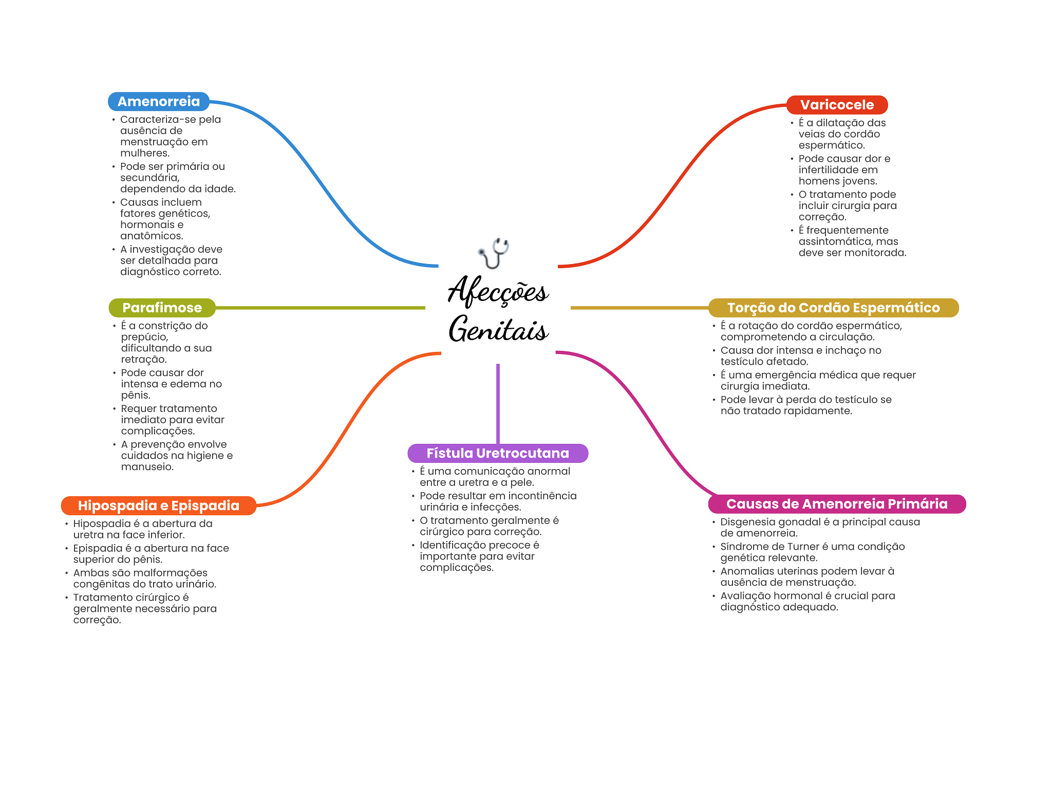 Amenorreia Varicocele Caracteriza-se pela É a dilatação das ausência de veias do cordão menstruação em espermático. mulheres. Pode causar dor e Pode ser primária ou infertilidade em secundária, homens jovens. dependendo da idade. tratamento pode Causas incluem incluir cirurgia para fatores genéticos, correção. hormonais e anatômicos. É frequentemente assintomática, mas A investigação deve deve ser monitorada. ser detalhada para diagnóstico correto. Afecções Parafimose Torção do Cordão Espermático É a constrição do Genitais É a rotação do cordão espermático, prepúcio, comprometendo a circulação. dificultando a sua Causa dor intensa e inchaço no retração. testículo afetado. Pode causar dor É uma emergência médica que requer intensa e edema no cirurgia imediata. pênis. Pode levar à perda do testículo se Requer tratamento não tratado rapidamente. imediato para evitar complicações. A prevenção envolve cuidados na higiene e Fístula Uretrocutana manuseio. É uma comunicação anormal entre a uretra e a pele. Pode resultar em incontinência Hipospadia e Epispadia urinária e infecções. Causas de Amenorreia Primária Hipospadia é a abertura da tratamento geralmente é Disgenesia gonadal é a principal causa uretra na face inferior. cirúrgico para correção. de amenorreia. Epispadia é a abertura na face Identificação precoce é Síndrome de Turner é uma condição superior do pênis. importante para evitar genética relevante. Ambas são malformações complicações. Anomalias uterinas podem levar à congênitas do trato urinário. ausência de menstruação. Tratamento cirúrgico é Avaliação hormonal é crucial para geralmente necessário para diagnóstico adequado. correção.