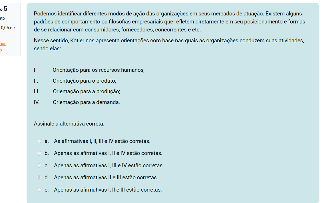 5 Podemos identificar diferentes modos de ação das organizações em seus mercados de atuação. Existem alguns padrões de comportamento ou filosofias empresariais que refletem diretamente em seu posicionamento e formas 0,05 de de se relacionar com consumidores, fornecedores, concorrentes e etc. Nesse sentido, Kotler nos apresenta orientações com base nas quais as organizações conduzem suas atividades, sendo elas: I. Orientação para OS recursos humanos; II. Orientação para O produto; III. Orientação para a produção; IV. Orientação para a demanda. Assinale a alternativa correta: a. As afirmativas I, II, III e IV estão corretas. b. Apenas as afirmativas I, e IV estão corretas. C. Apenas as afirmativas I, III e IV estão corretas. d. Apenas as afirmativas II e III estão corretas. e. Apenas as afirmativas I, e III estão corretas.