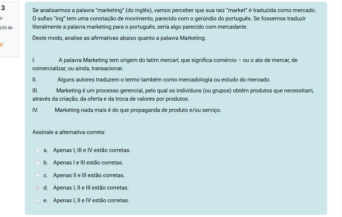 3 Se analisarmos a palavra "marketing" (do inglês), vamos perceber que sua raiz "market" é traduzida como mercado. 0 sufixo "ing" tem uma conotação de movimento, parecido com gerúndio do português. Se fossemos traduzir de literalmente a palavra marketing para O português, seria algo parecido com mercadante. Deste modo, analise as afirmativas abaixo quanto a palavra Marketing: I. A palavra Marketing tem origem do latim mercari, que significa comércio ou O ato de mercar, de comercializar, ou ainda, transacionar. II. Alguns autores traduzem O termo também como mercadologia ou estudo do mercado. III. Marketing é um processo gerencial, pelo qual indivíduos (ou grupos) obtêm produtos que necessitam, através da criação, da oferta e da troca de valores por produtos. IV. Marketing nada mais é do que propaganda de produto e/ou serviço. Assinale a alternativa correta: a. Apenas I, III e IV estão corretas. b. Apenas I e III estão corretas. C. Apenas II e III estão corretas. d. Apenas I, e III estão corretas. e. Apenas I, II e IV estão corretas.