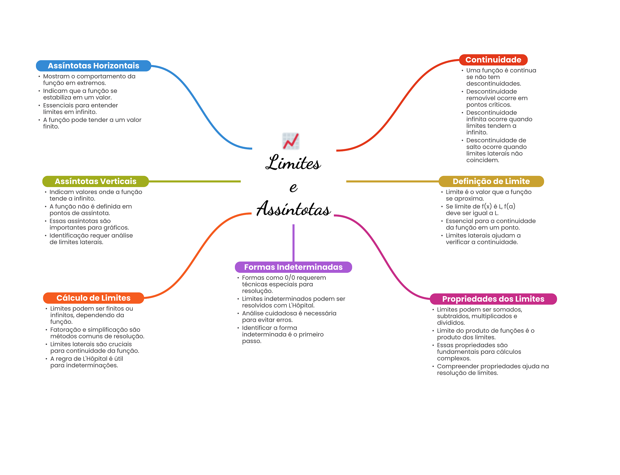 Continuidade Assíntotas Horizontais Uma função é contínua Mostram comportamento da se não tem função em extremos. descontinuidades. Indicam que a função se Descontinuidade estabiliza em um valor. removível ocorre em Essenciais para entender pontos críticos. limites em infinito. Descontinuidade A função pode tender a um valor infinita ocorre quando finito. limites tendem a infinito. Descontinuidade de salto ocorre quando limites laterais não Limites coincidem. Assíntotas Verticais Definição de Limite e Indicam valores onde a função Limite é valor que a função tende a infinito. se aproxima. A função não é definida em Assintotas Se limite de f(x) é L, f(a) pontos de assíntota. deve ser igual a L. Essas assíntotas são Essencial para a continuidade importantes para gráficos. da função em um ponto. Identificação requer análise Limites laterais ajudam a de limites laterais. verificar a continuidade. Formas Indeterminadas Formas como 0/0 requerem técnicas especiais para resolução. Cálculo de Limites Limites indeterminados podem ser Propriedades dos Limites Limites podem ser finitos ou resolvidos com L'Hôpital. infinitos, dependendo da Análise cuidadosa é necessária Limites podem ser somados, subtraídos, multiplicados e função. para evitar erros. divididos. Fatoração e simplificação são Identificar a forma Limite do produto de funções é métodos comuns de resolução. indeterminada é O primeiro produto dos limites. Limites laterais são cruciais passo. Essas propriedades são para continuidade da função. fundamentais para cálculos A regra de L'Hôpital é útil complexos. para indeterminações. Compreender propriedades ajuda na resolução de limites.