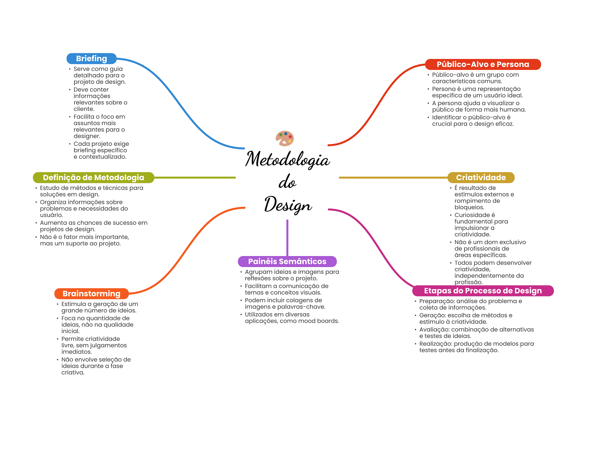 Briefing Público-Alvo e Persona Serve como guia detalhado para Público-alvo é um grupo com projeto de design. características comuns. Deve conter Persona é uma representação informações específica de um usuário ideal. relevantes sobre A persona ajuda a visualizar cliente. público de forma mais humana. Facilita foco em Identificar público-alvo é assuntos mais crucial para O design eficaz. relevantes para designer. Cada projeto exige briefing específico e contextualizado. Metodologia Definição de Metodologia do Criatividade Estudo de métodos e técnicas para É resultado de soluções em design. estímulos externos e Organiza informações sobre Design rompimento de problemas e necessidades do bloqueios. usuário. Curiosidade é Aumenta as chances de sucesso em fundamental para projetos de design. impulsionar a Não é fator mais importante, criatividade. mas um suporte ao projeto. Não é um dom exclusivo de profissionais de áreas específicas. Painéis Semânticos Todos podem desenvolver Agrupam ideias e imagens para criatividade, reflexões sobre projeto. da profissão. Facilitam a comunicação de Brainstorming temas e conceitos visuais. Etapas do Processo de Design Podem incluir colagens de Estimula a geração de um Preparação: análise do problema e imagens e palavras-chave. grande número de ideias. coleta de informações. Utilizados em diversas Foca na quantidade de Geração: escolha de métodos e aplicações, como mood boards. estímulo à criatividade. ideias, não na qualidade inicial. Avaliação: combinação de alternativas Permite criatividade e testes de ideias. livre, sem julgamentos Realização: produção de modelos para imediatos. testes antes da finalização. Não envolve seleção de ideias durante a fase criativa.