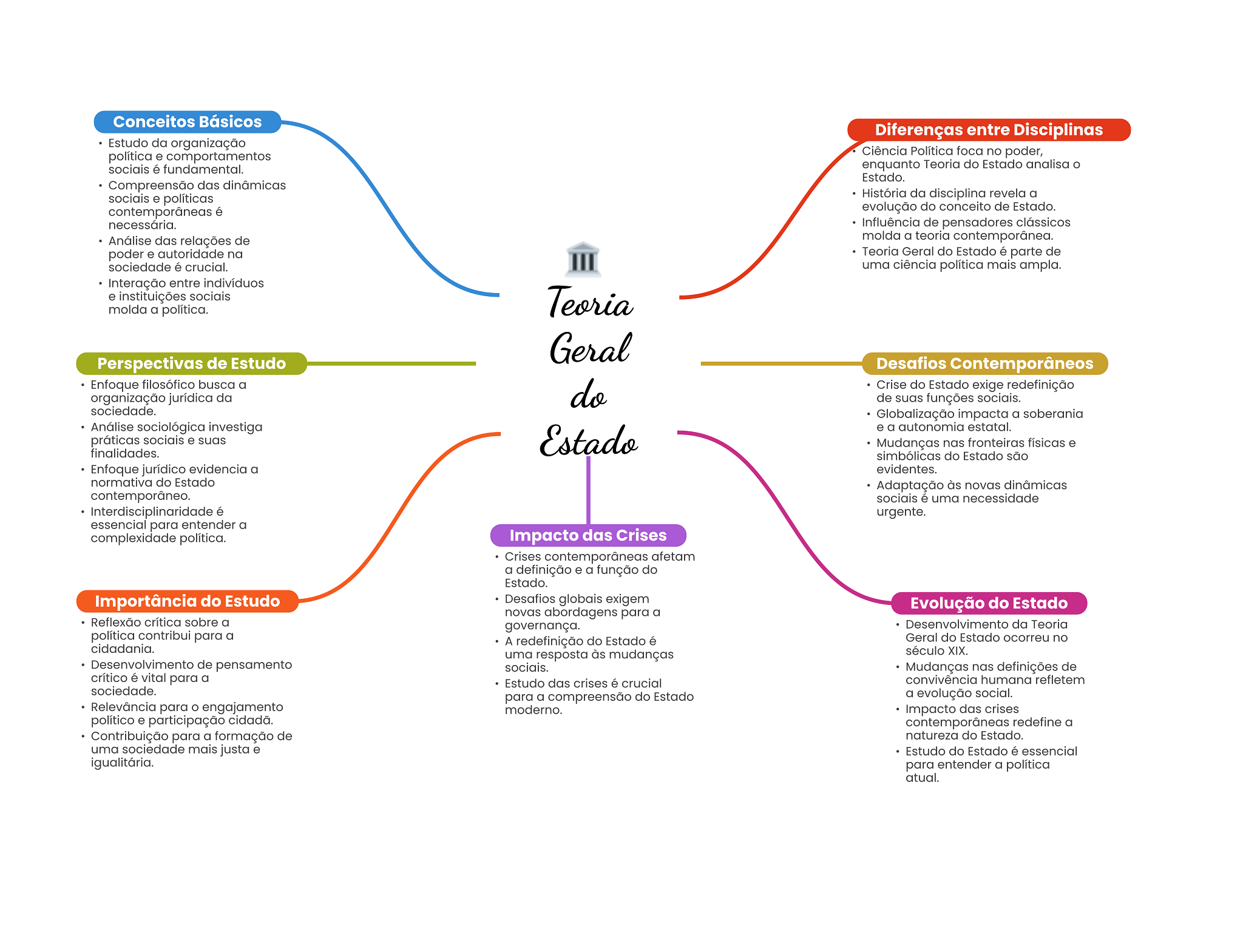 Conceitos Básicos Diferenças entre Disciplinas Estudo da organização política e comportamentos Ciência Política foca no poder, sociais é fundamental. enquanto Teoria do Estado analisa Estado. Compreensão das dinâmicas sociais e políticas História da disciplina revela a contemporâneas é evolução do conceito de Estado. necessária. Influência de pensadores clássicos Análise das relações de molda a teoria contemporânea. poder e autoridade na Teoria Geral do Estado é parte de sociedade é crucial. uma ciência política mais ampla. Interação entre indivíduos e instituições sociais molda a política. Teoria Geral Perspectivas de Estudo Desafios Contemporâneos Enfoque filosófico busca a organização jurídica da do Crise do Estado exige redefinição de suas funções sociais. sociedade. Globalização impacta a soberania Análise sociológica investiga e a autonomia estatal. práticas sociais e suas Estado Mudanças nas fronteiras físicas e finalidades. simbólicas do Estado são Enfoque jurídico evidencia a evidentes. normativa do Estado Adaptação às novas dinâmicas contemporâneo. sociais é uma necessidade Interdisciplinaridade é urgente. essencial para entender a complexidade política. Impacto das Crises Crises afetam a definição e a função do Estado. Importância do Estudo Desafios globais exigem Evolução do Estado novas abordagens para a Reflexão crítica sobre a governança. Desenvolvimento da Teoria política contribui para a cidadania. A redefinição do Estado é Geral do Estado ocorreu no uma resposta às mudanças século XIX. Desenvolvimento de pensamento sociais. Mudanças nas definições de crítico é vital para a Estudo das crises é crucial convivência humana refletem sociedade. para a compreensão do Estado a evolução social. Relevância para engajamento moderno. Impacto das crises político e participação cidadã. contemporâneas redefine a Contribuição para a formação de natureza do Estado. uma sociedade mais justa e Estudo do Estado é essencial igualitária. para entender a política atual.