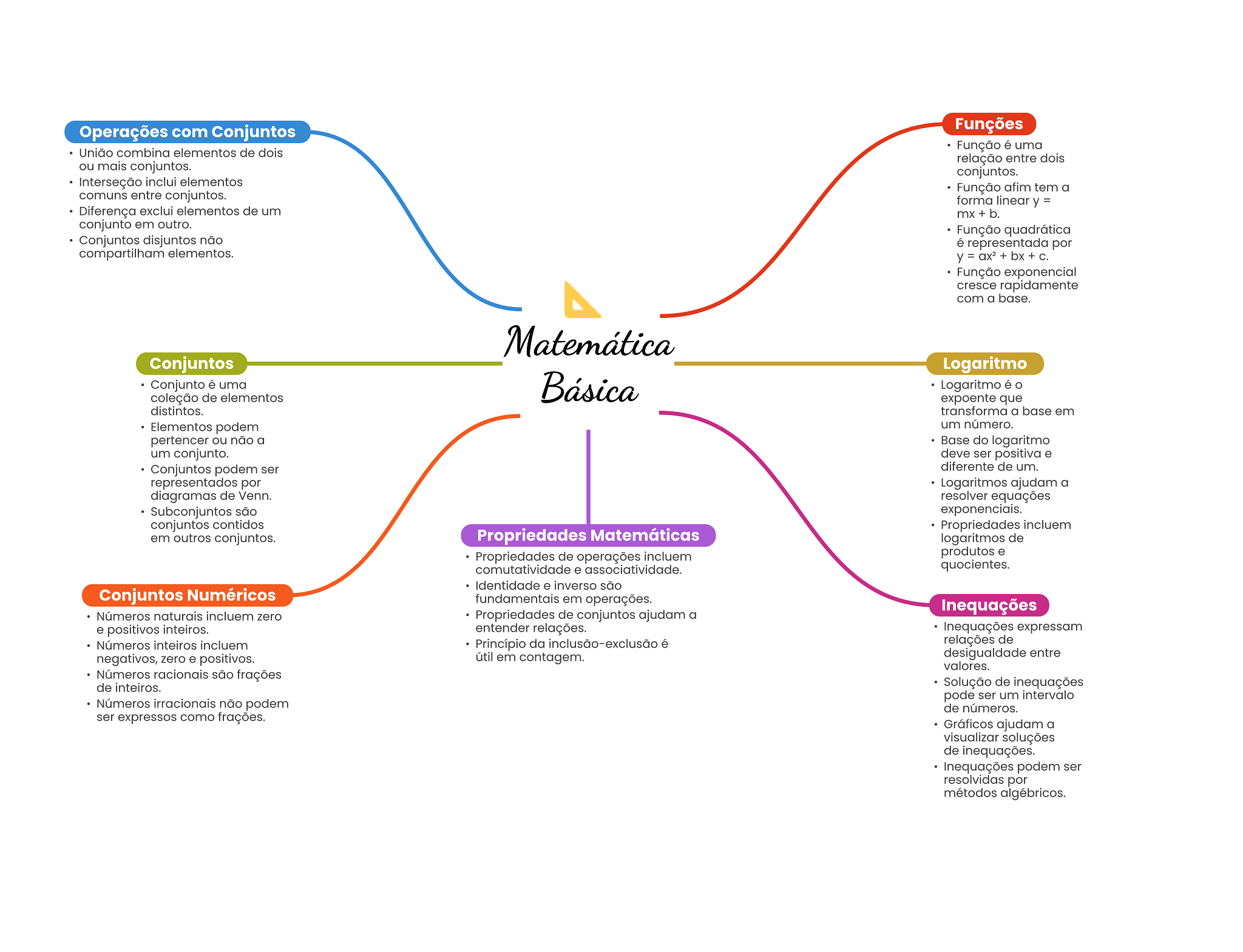Operações com Conjuntos Funções Função é uma União combina elementos de dois relação entre dois ou mais conjuntos. conjuntos. Interseção inclui elementos Função afim tem a comuns entre conjuntos. forma linear y = Diferença exclui elementos de um mx + b. conjunto em outro. Função quadrática Conjuntos disjuntos não é representada por compartilham elementos. y = + bx + C. Função exponencial cresce rapidamente com a base. Matemática Conjuntos Logaritmo Conjunto é uma Básica Logaritmo é coleção de elementos expoente que distintos. transforma a base em Elementos podem um número. pertencer ou não a Base do logaritmo um conjunto. deve ser positiva e Conjuntos podem ser diferente de um. representados por Logaritmos ajudam a diagramas de Venn. resolver equações Subconjuntos são exponenciais. conjuntos contidos Propriedades incluem em outros conjuntos. Propriedades Matemáticas logaritmos de Propriedades de operações incluem produtos e comutatividade e associatividade. quocientes. Identidade e inverso são Conjuntos Numéricos fundamentais em operações. Inequações Números naturais incluem zero Propriedades de conjuntos ajudam a e positivos inteiros. entender relações. Inequações expressam Números inteiros incluem Princípio da é relações de negativos, zero e positivos. útil em contagem. desigualdade entre valores. Números racionais são frações de inteiros. Solução de inequações pode ser um intervalo Números irracionais não podem de números. ser expressos como frações. Gráficos ajudam a visualizar soluções de inequações. Inequações podem ser resolvidas por métodos algébricos.