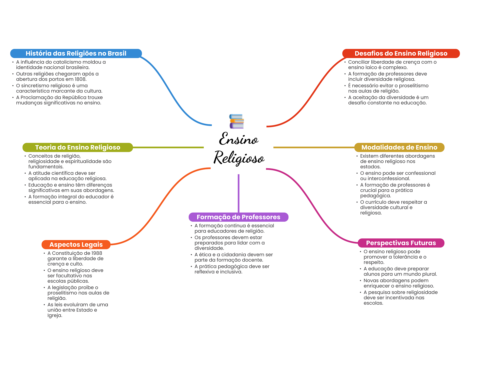 História das Religiões no Brasil Desafios do Ensino Religioso A influência do catolicismo moldou a Conciliar liberdade de crença com identidade nacional brasileira. ensino laico é complexo. Outras religiões chegaram após a A formação de professores deve abertura dos portos em 1808. incluir diversidade religiosa. sincretismo religioso é uma É necessário evitar proselitismo característica marcante da cultura. nas aulas de religião. A Proclamação da República trouxe A aceitação da diversidade é um mudanças significativas no ensino. desafio constante na educação. Ensino Teoria do Ensino Religioso Modalidades de Ensino Conceitos de religião, Religioso Existem diferentes abordagens religiosidade e espiritualidade são de ensino religioso nos fundamentais. estados. A atitude científica deve ser ensino pode ser confessional aplicada na educação religiosa. ou interconfessional. Educação e ensino têm diferenças A formação de professores é significativas em suas abordagens. crucial para a prática A formação integral do educador é pedagógica. essencial para ensino. O currículo deve respeitar a diversidade cultural e religiosa. Formação de Professores A formação contínua é essencial para educadores de religião. Os professores devem estar Aspectos Legais preparados para lidar com a Perspectivas Futuras diversidade. A Constituição de 1988 A ética e a cidadania devem ser ensino religioso pode garante a liberdade de promover a tolerância e parte da formação docente. crença e culto. respeito. A prática pedagógica deve ser ensino religioso deve reflexiva e inclusiva. A educação deve preparar ser facultativo nas alunos para um mundo plural. escolas públicas. Novas abordagens podem A legislação proíbe enriquecer O ensino religioso. proselitismo nas aulas de A pesquisa sobre religiosidade religião. deve ser incentivada nas As leis evoluíram de uma escolas. união entre Estado e Igreja.
