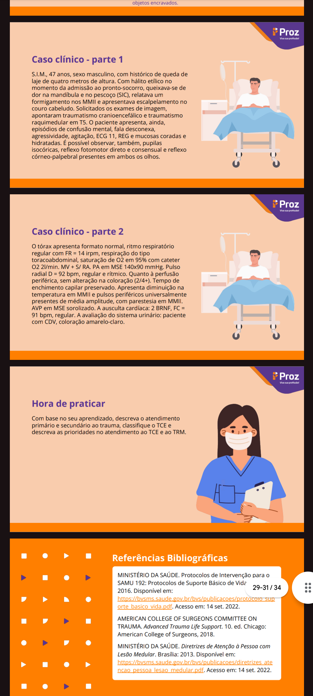 objetos encravados. Proz Caso clínico parte 1 S.I.M., 47 anos, sexo masculino, com histórico de queda de laje de quatro metros de altura. Com hálito etílico no momento da admissão ao pronto-socorro, queixava-se de dor na mandíbula e no pescoço (SIC), relatava um formigamento nos MMII e apresentava escalpelamento no couro cabeludo. Solicitados os exames de imagem, apontaram traumatismo cranioencefálico e traumatismo raquimedular em T5. paciente apresenta, ainda, episódios de confusão mental, fala desconexa, agressividade, agitação, ECG 11, REG e mucosas coradas e hidratadas. É possível observar, também, pupilas isocóricas, reflexo fotomotor direto e consensual e reflexo córneo-palpebral presentes em ambos os olhos. Proz Caso clínico parte 2 tórax apresenta formato normal, ritmo respiratório regular com FR = 14 irpm, respiração do tipo toracoabdominal, saturação de em 95% com cateter 02 MV + S/ RA. PA em MSE 140x90 mmHg. Pulso radial D = 92 bpm, regular e rítmico. Quanto à perfusão periférica, sem alteração na coloração (2/4+). Tempo de enchimento capilar preservado. Apresenta diminuição na temperatura em MMII e pulsos periféricos universalmente presentes de média amplitude, com parestesia em MMII. AVP em MSE sorolizado. A ausculta cardíaca: 2 BRNF, FC = 91 bpm, regular. A avaliação do sistema urinário: paciente com CDV, coloração amarelo-claro. Proz Hora de praticar Com base no seu aprendizado, descreva atendimento primário e secundário ao trauma, classifique TCE e descreva as prioridades no atendimento ao TCE e ao TRM. Referências Bibliográficas MINISTÉRIO DA SAÚDE. Protocolos de Intervenção para SAMU 192: Protocolos de Suporte Básico de Vida 29-31/34 2016. Disponível em: https://bvsms.saude.gov.br/bvs/publicacoes/protocolo sup orte basico Acesso em: 14 set. 2022. AMERICAN COLLEGE OF SURGEONS COMMITTEE ON TRAUMA. Advanced Trauma Life Support. 10. ed. Chicago: American College of Surgeons, 2018. MINISTÉRIO DA SAÚDE. Diretrizes de Atenção à Pessoa com Lesão Medular. Brasília: 2013. Disponível em: https://bvsms.saude.gov.br/bvs/publicacoes/diretrizes_ate ncao pessoa lesao medular.pdf. Acesso em: 14 set. 2022.