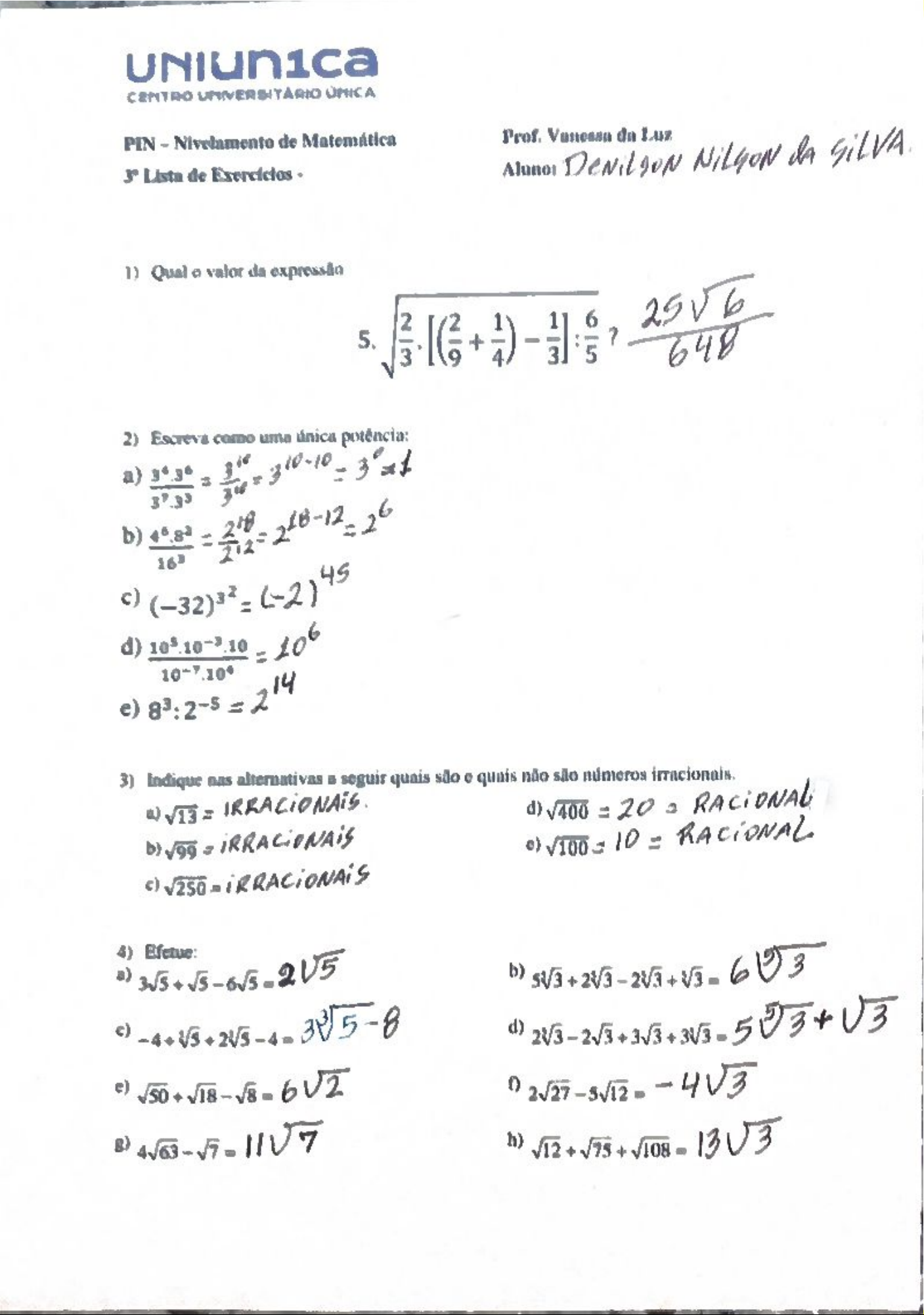 CENTRO ÚMICA PIN - Nivelamento de Matemática Prof. da Luz NiLGON Lista de Exercícios Qual valor da expressão 5. 648 2) Escreva como uma única potência: a) b) c) d) e) 3) Indique nas alternativas seguir quais são e quais não são números d) 20 e) 10 =CENTRO UNIVERSITÁRIO ÚNICA 5) o perímetro das figuras, cujas medidas de seus lados são dadas numa mesma unidade de medida de comprimento. a) R: 9V3 BIR: b) 32 6) Racionalize denominador das seguintes expressões fracionárias: a) b) 2 c) 6 d) e) 6 h) ab j) R 7) Racionalize o denominador das seguintes expressões fracionárias: 1 3 a) 2a 2 ab 2 3 N A soma de dois números consecutivos é 64. Determine esses dois números. 33 9) Férnanda e Maria têm, respectivamente, 18 e 14 anos. Daqui a quantos anos a soma das idades das duas atingirá 80 anos? R: 10) Se um terreno deve ter perímetro de 120 m e um dos lados deve medir ao menos dobro do outro, quanto deve medir 0 lado menor? 0 LAdo é 11) Resolva as equações. b) + 3 2 4 3 5 Bons Estudos!