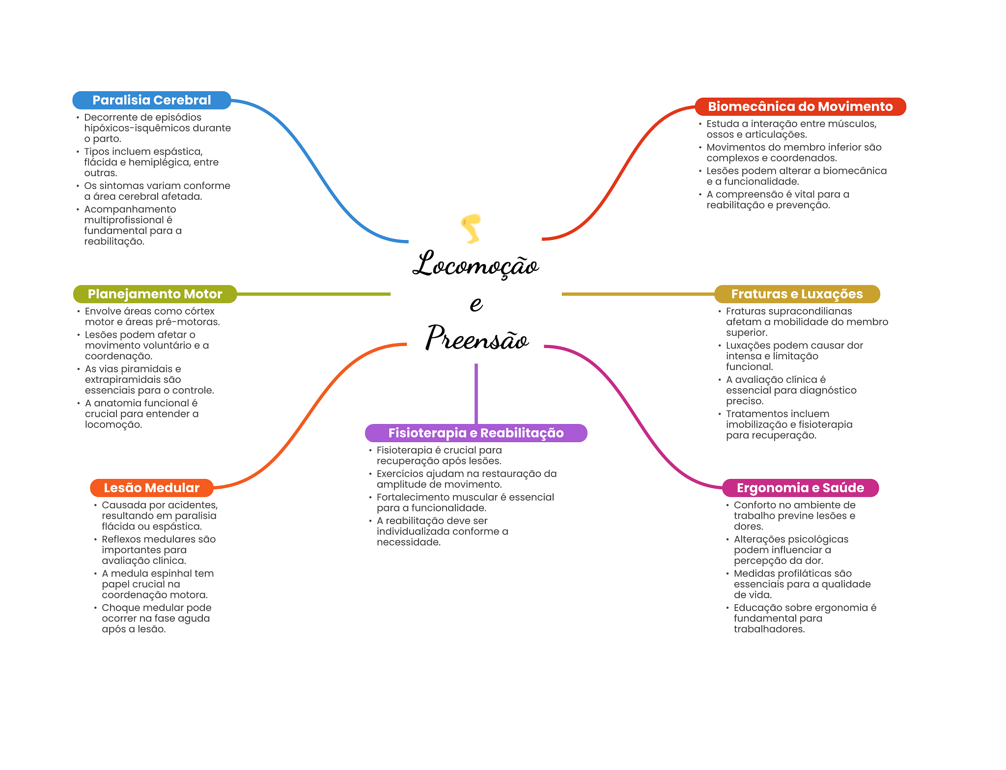 Paralisia Cerebral Biomecânica do Movimento Decorrente de episódios hipóxicos-isquêmicos durante Estuda a interação entre músculos, parto. OSSOS e articulações. Tipos incluem espástica, Movimentos do membro inferior são flácida e hemiplégica, entre complexos e coordenados. outras. Lesões podem alterar a biomecânica Os sintomas variam conforme e a funcionalidade. a área cerebral afetada. A compreensão é vital para a Acompanhamento reabilitação e prevenção. multiprofissional é fundamental para a reabilitação. Locomoção Planejamento Motor Fraturas e Luxações Envolve áreas como córtex e Fraturas supracondilianas motor e áreas pré-motoras. afetam a mobilidade do membro Lesões podem afetar movimento voluntário e a Preensão superior. Luxações podem causar dor coordenação. intensa e limitação As vias piramidais e funcional. extrapiramidais são A avaliação clínica é essenciais para controle. essencial para diagnóstico A anatomia funcional é preciso. crucial para entender a Tratamentos incluem locomoção. imobilização e fisioterapia Fisioterapia e Reabilitação para recuperação. Fisioterapia é crucial para recuperação após lesões. Exercícios ajudam na restauração da Lesão Medular amplitude de movimento. Ergonomia e Saúde Fortalecimento muscular é essencial Causada por acidentes, para a funcionalidade. Conforto no ambiente de resultando em paralisia flácida ou espástica. A reabilitação deve ser trabalho previne lesões e dores. individualizada conforme a Reflexos medulares são necessidade. Alterações psicológicas importantes para podem influenciar a avaliação clínica. percepção da dor. A medula espinhal tem Medidas profiláticas são papel crucial na essenciais para a qualidade coordenação motora. de vida. Choque medular pode Educação sobre ergonomia é ocorrer na fase aguda fundamental para após a lesão. trabalhadores.