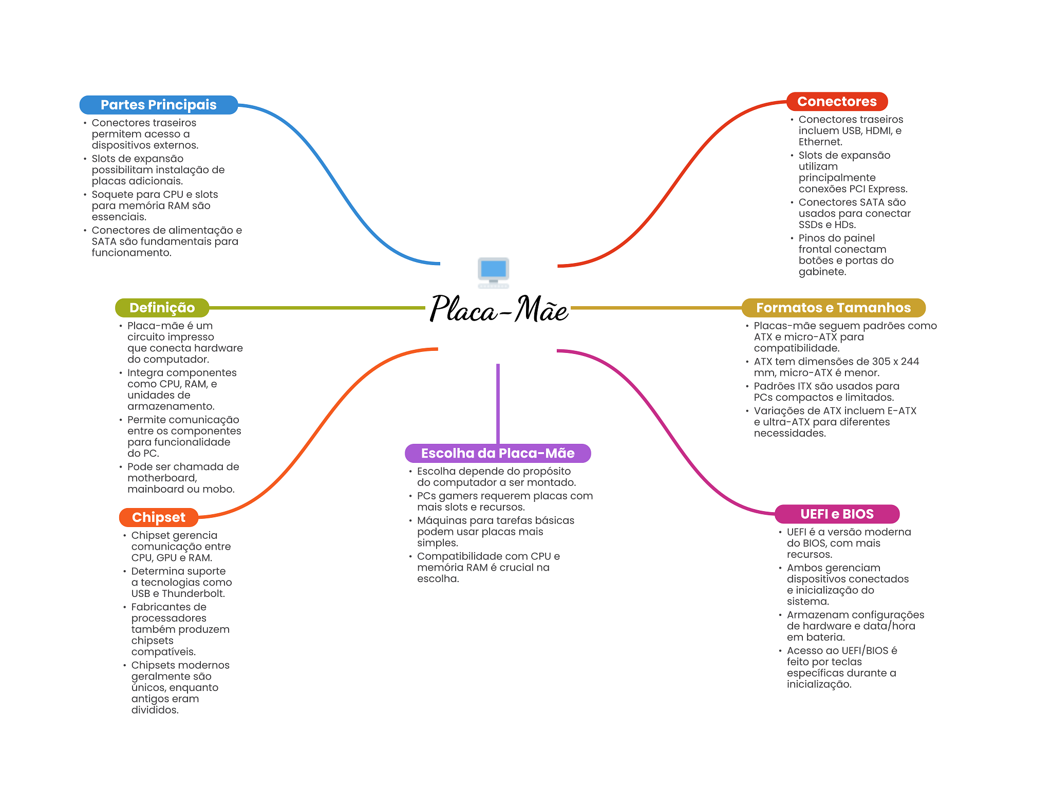 Partes Principais Conectores Conectores traseiros Conectores traseiros permitem acesso a incluem USB, HDMI, e dispositivos externos. Ethernet. Slots de expansão Slots de expansão possibilitam instalação de utilizam placas adicionais. principalmente conexões PCI Express. Soquete para CPU e slots para memória RAM são Conectores SATA são essenciais. usados para conectar SSDs e HDs. Conectores de alimentação e SATA são fundamentais para Pinos do painel funcionamento. frontal conectam botões e portas do gabinete. Definição Placa-Mãe Formatos e Tamanhos Placa-mãe é um Placas-mãe seguem padrões como circuito impresso ATX e micro-ATX para que conecta hardware compatibilidade. do computador. ATX tem dimensões de 305 X 244 Integra componentes mm, micro-ATX é menor. como CPU, RAM, e Padrões ITX são usados para unidades de PCs compactos e limitados. Variações de ATX incluem E-ATX Permite comunicação e ultra-ATX para diferentes entre OS componentes necessidades. para funcionalidade do PC. Escolha da Placa-Mãe Pode ser chamada de Escolha depende do propósito motherboard, do computador a ser montado. mainboard ou mobo. PCs gamers requerem placas com mais slots e recursos. Chipset UEFI e BIOS Máquinas para tarefas básicas Chipset gerencia podem usar placas mais UEFI é a versão moderna comunicação entre simples. do BIOS, com mais CPU, GPU e RAM. Compatibilidade com CPU e recursos. Determina suporte memória RAM é crucial na Ambos gerenciam a tecnologias como escolha. dispositivos conectados USB e Thunderbolt. e do sistema. Fabricantes de processadores Armazenam configurações também produzem de hardware e data/hora chipsets em bateria. compatíveis. Acesso ao UEFI/BIOS é Chipsets modernos feito por teclas geralmente são específicas durante a únicos, enquanto inicialização. antigos eram divididos.