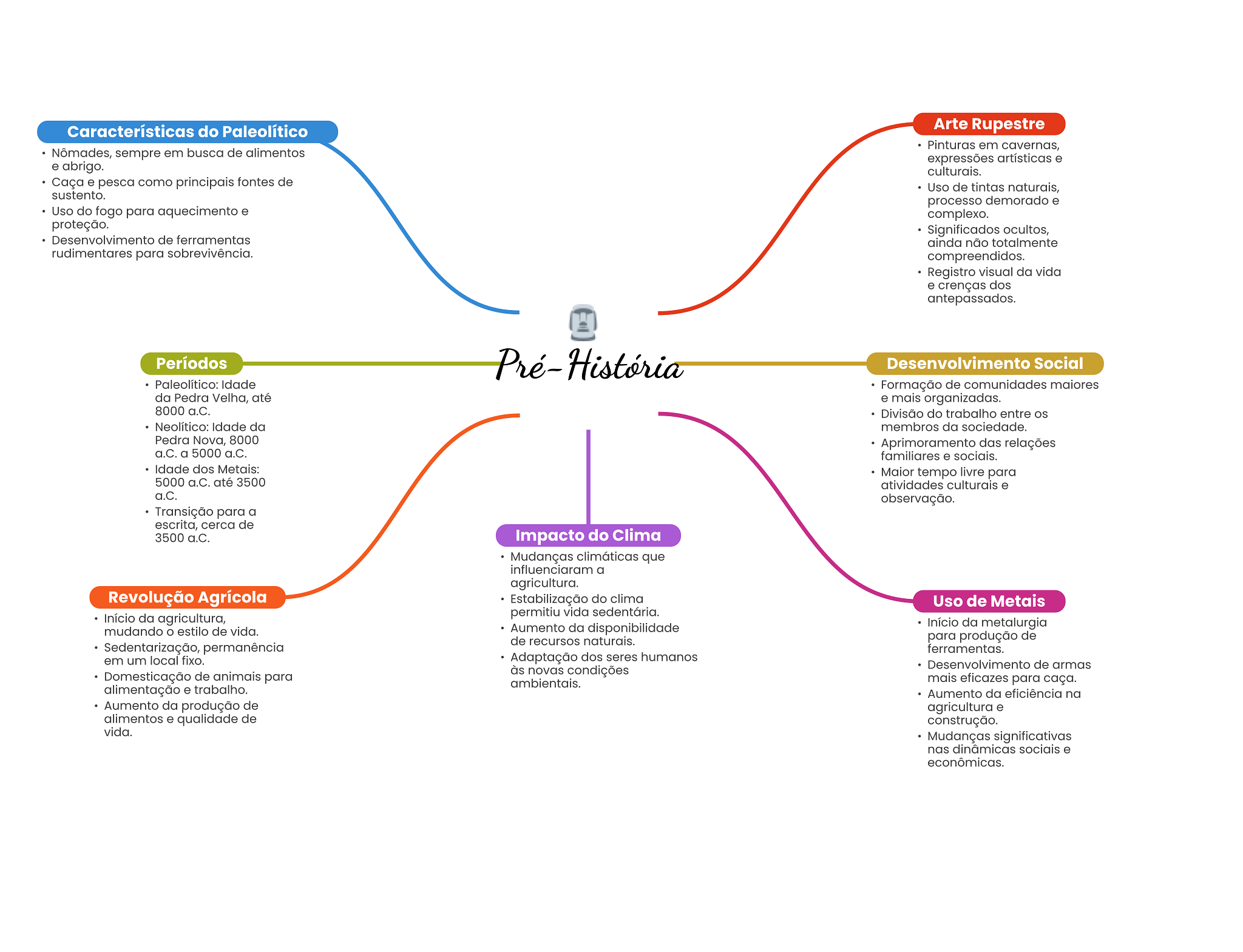 Características do Paleolítico Arte Rupestre Pinturas em cavernas, Nômades, sempre em busca de alimentos expressões artísticas e e abrigo. culturais. Caça e pesca como principais fontes de Uso de tintas naturais, sustento. processo demorado e Uso do fogo para aquecimento e complexo. proteção. Significados ocultos, Desenvolvimento de ferramentas ainda não totalmente rudimentares para sobrevivência. compreendidos. Registro visual da vida e crenças dos antepassados. Períodos Pré- História Desenvolvimento Social Paleolítico: Idade Formação de comunidades maiores da Pedra Velha, até e mais organizadas. 8000 a.C. Divisão do trabalho entre Neolítico: Idade da membros da sociedade. Pedra Nova, 8000 Aprimoramento das relações a.C. a 5000 a.C. familiares e sociais. Idade dos Metais: Maior tempo livre para 5000 a.C. até 3500 atividades culturais e a.C. observação. Transição para a escrita, cerca de 3500 a.C. Impacto do Clima Mudanças climáticas que influenciaram a agricultura. Revolução Agrícola Estabilização do clima Uso de Metais Início da agricultura, permitiu vida sedentária. mudando estilo de vida. Aumento da disponibilidade Início da metalurgia de recursos naturais. para produção de Sedentarização, permanência ferramentas. em um local fixo. Adaptação dos seres humanos Desenvolvimento de armas Domesticação de animais para às novas condições ambientais. mais eficazes para caça. alimentação e trabalho. Aumento da eficiência na Aumento da produção de agricultura e alimentos e qualidade de construção. vida. Mudanças significativas nas dinâmicas sociais e econômicas.