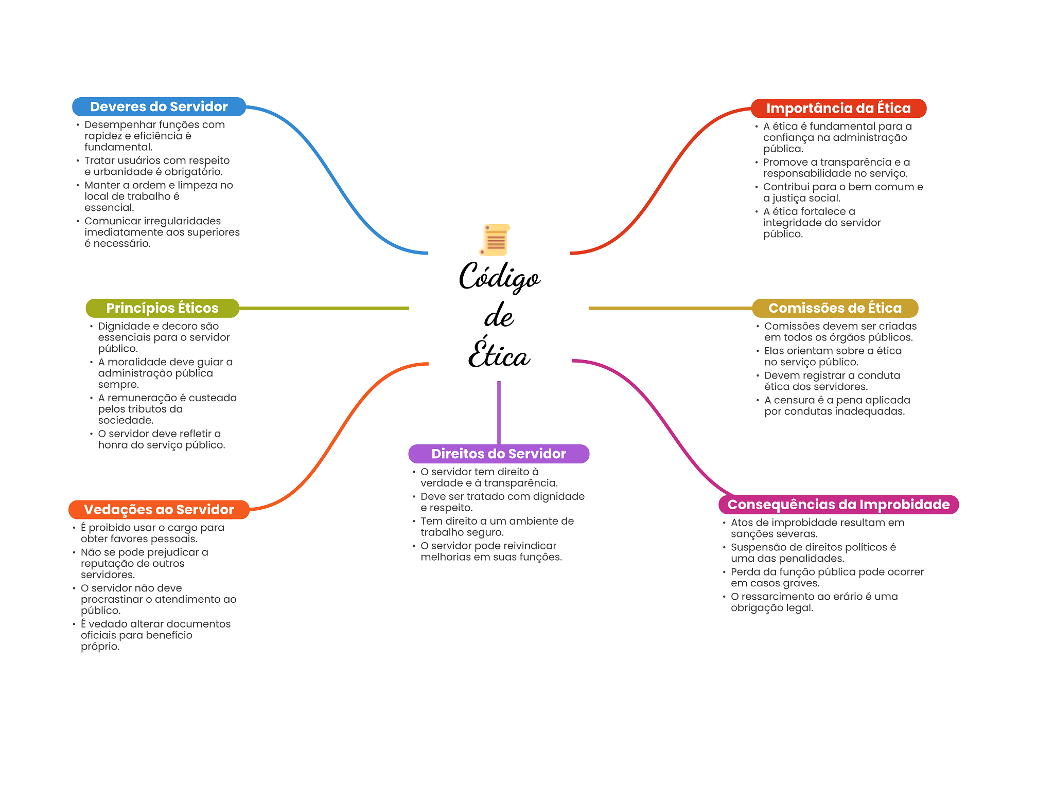 Deveres do Servidor Importância da Ética Desempenhar funções com A ética é fundamental para a rapidez e eficiência é confiança na administração fundamental. pública. Tratar usuários com respeito Promove a transparência e a e urbanidade é obrigatório. responsabilidade no serviço. Manter a ordem e limpeza no Contribui para bem comum e local de trabalho é a justiça social. essencial. A ética fortalece a Comunicar irregularidades integridade do servidor imediatamente aos superiores público. é necessário. Código Princípios Éticos de Comissões de Ética Dignidade e decoro são Comissões devem ser criadas essenciais para servidor público. Ética em todos OS órgãos públicos. Elas orientam sobre a ética A moralidade deve guiar a no serviço público. administração pública Devem registrar a conduta sempre. dos servidores. A remuneração é custeada A censura é a pena aplicada pelos tributos da por condutas inadequadas. sociedade. servidor deve refletir a honra do serviço público. Direitos do Servidor servidor tem direito à verdade e à transparência. Deve ser tratado com dignidade Vedações ao Servidor e respeito. Consequências da Improbidade Tem direito a um ambiente de É proibido usar cargo para Atos de improbidade resultam em trabalho seguro. obter favores pessoais. sanções severas. servidor pode reivindicar Não se pode prejudicar a Suspensão de direitos políticos é melhorias em suas funções. reputação de outros uma das penalidades. servidores. Perda da função pública pode ocorrer servidor não deve em casos graves. procrastinar atendimento ao ressarcimento ao erário é uma público. obrigação legal. É vedado alterar documentos oficiais para benefício próprio.