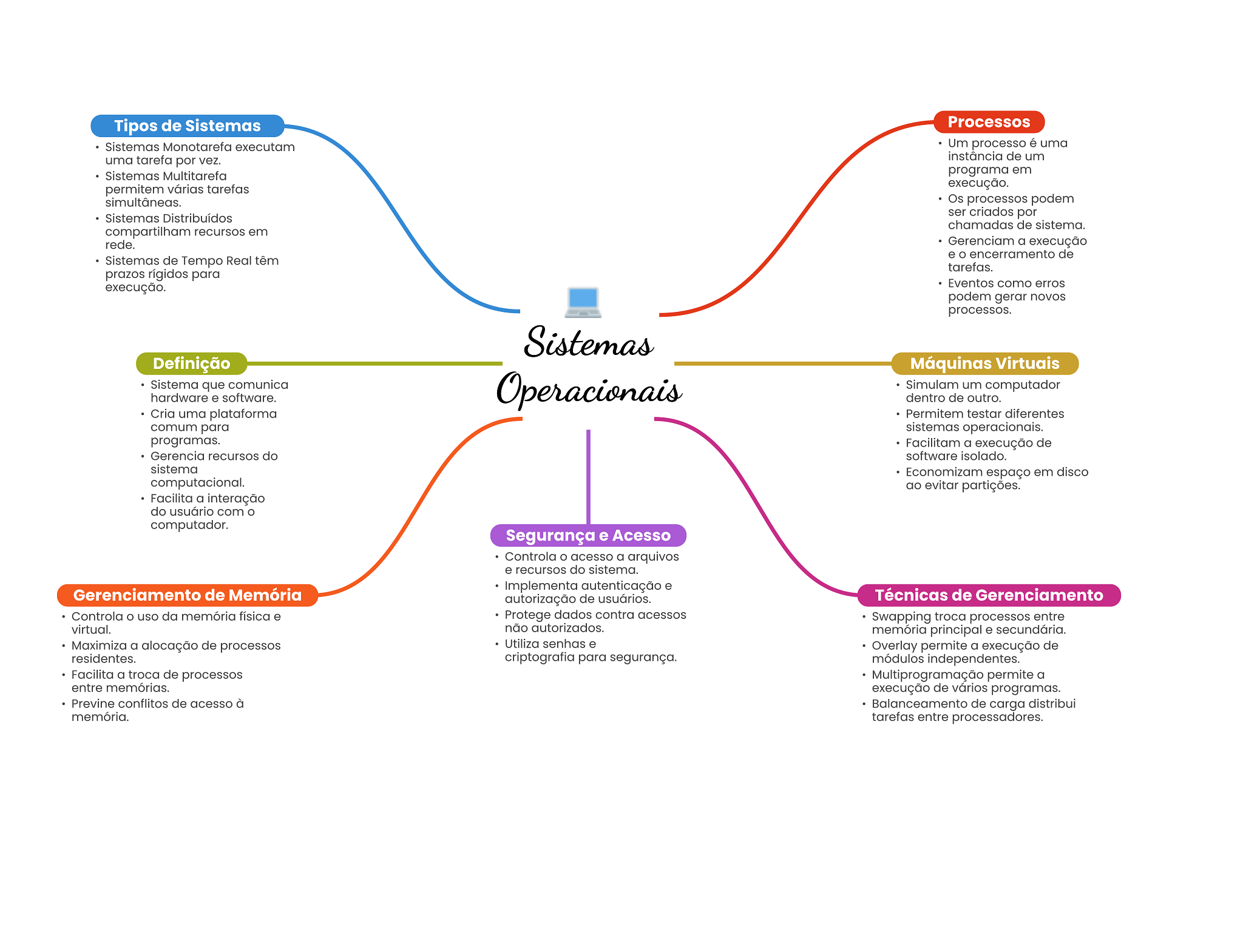 Tipos de Sistemas Processos Sistemas Monotarefa executam Um processo é uma uma tarefa por vez. instância de um Sistemas Multitarefa programa em permitem várias tarefas execução. simultâneas. Os processos podem Sistemas Distribuídos ser criados por chamadas de sistema. compartilham recursos em rede. Gerenciam a execução e encerramento de Sistemas de Tempo Real têm tarefas. prazos rígidos para execução. Eventos como erros podem gerar novos processos. Sistemas Definição Máquinas Virtuais Sistema que comunica Operacionais Simulam um computador hardware e software. dentro de outro. Cria uma plataforma Permitem testar diferentes comum para sistemas operacionais. programas. Facilitam a execução de Gerencia recursos do software isolado. sistema Economizam espaço em disco computacional. ao evitar partições. Facilita a interação do usuário com computador. Segurança e Acesso Controla acesso a arquivos e recursos do sistema. Implementa autenticação e Gerenciamento de Memória autorização de usuários. Técnicas de Gerenciamento Controla uso da memória física e Protege dados contra acessos Swapping troca processos entre virtual. não autorizados. memória principal e secundária. Maximiza a alocação de processos Utiliza senhas e Overlay permite a execução de residentes. criptografia para segurança. módulos independentes. Facilita a troca de processos Multiprogramação permite a entre memórias. execução de vários programas. Previne conflitos de acesso à Balanceamento de carga distribui memória. tarefas entre processadores.