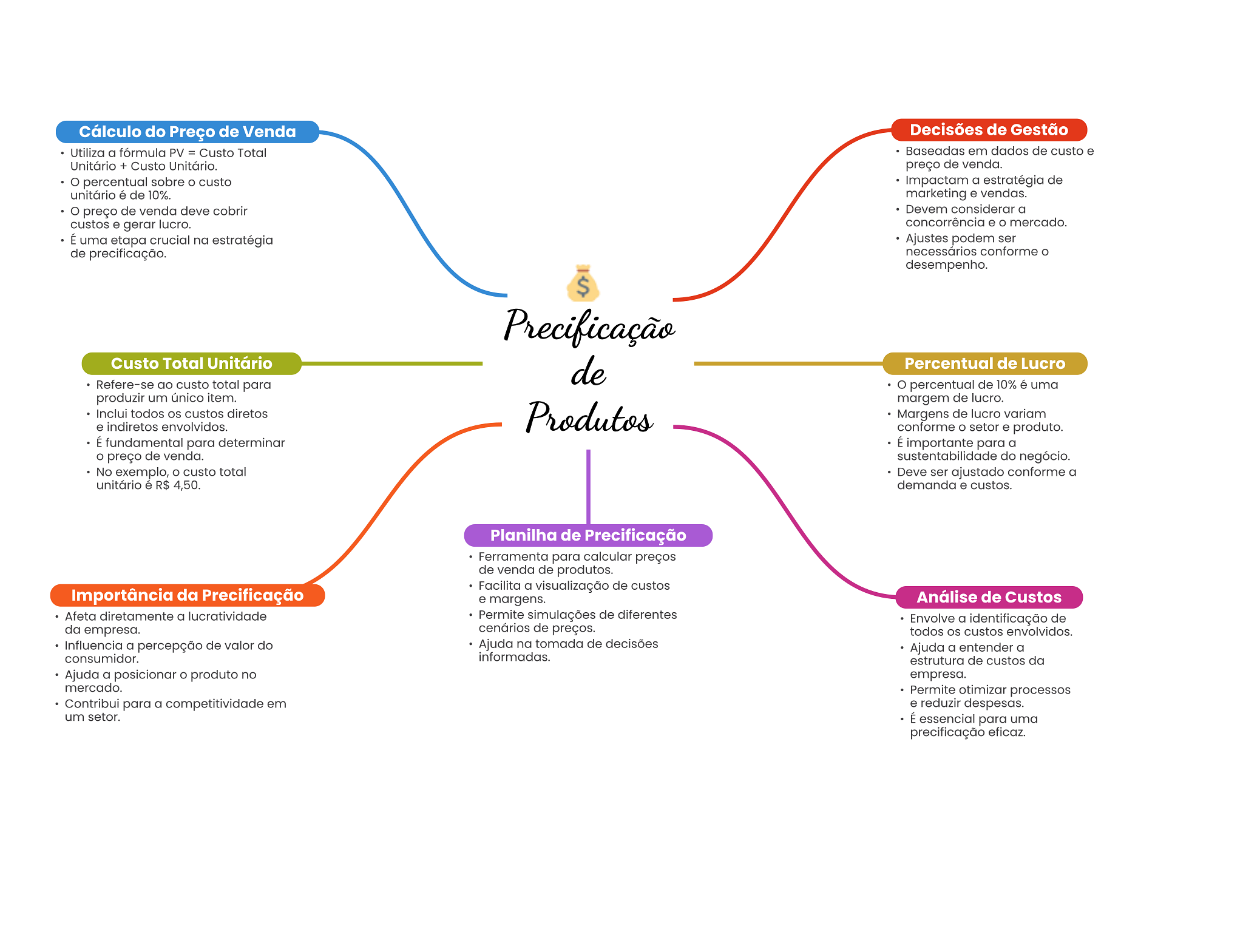 Cálculo do Preço de Venda Decisões de Gestão Utiliza a fórmula PV = Custo Total Baseadas em dados de custo e Unitário + Custo Unitário. preço de venda. percentual sobre custo Impactam a estratégia de unitário é de 10%. marketing e vendas. preço de venda deve cobrir Devem considerar a custos e gerar lucro. concorrência e mercado. É uma etapa crucial na estratégia Ajustes podem ser de precificação. necessários conforme o desempenho. $ Precificação Custo Total Unitário de Percentual de Lucro Refere-se ao custo total para percentual de 10% é uma produzir um único item. margem de lucro. Inclui todos OS custos diretos e indiretos envolvidos. Produtos Margens de lucro variam conforme setor e produto. É fundamental para determinar É importante para a preço de venda. sustentabilidade do negócio. No exemplo, custo total Deve ser ajustado conforme a unitário é R$ 4,50. demanda e custos. Planilha de Precificação Ferramenta para calcular preços de venda de produtos. Facilita a visualização de custos Importância da Precificação e margens. Análise de Custos Afeta diretamente a lucratividade Permite simulações de diferentes Envolve a identificação de da empresa. cenários de preços. todos os custos envolvidos. Influencia a percepção de valor do Ajuda na tomada de decisões Ajuda a entender a consumidor. informadas. estrutura de custos da Ajuda a posicionar produto no empresa. mercado. Permite otimizar processos Contribui para a competitividade em e reduzir despesas. um setor. É essencial para uma precificação eficaz.