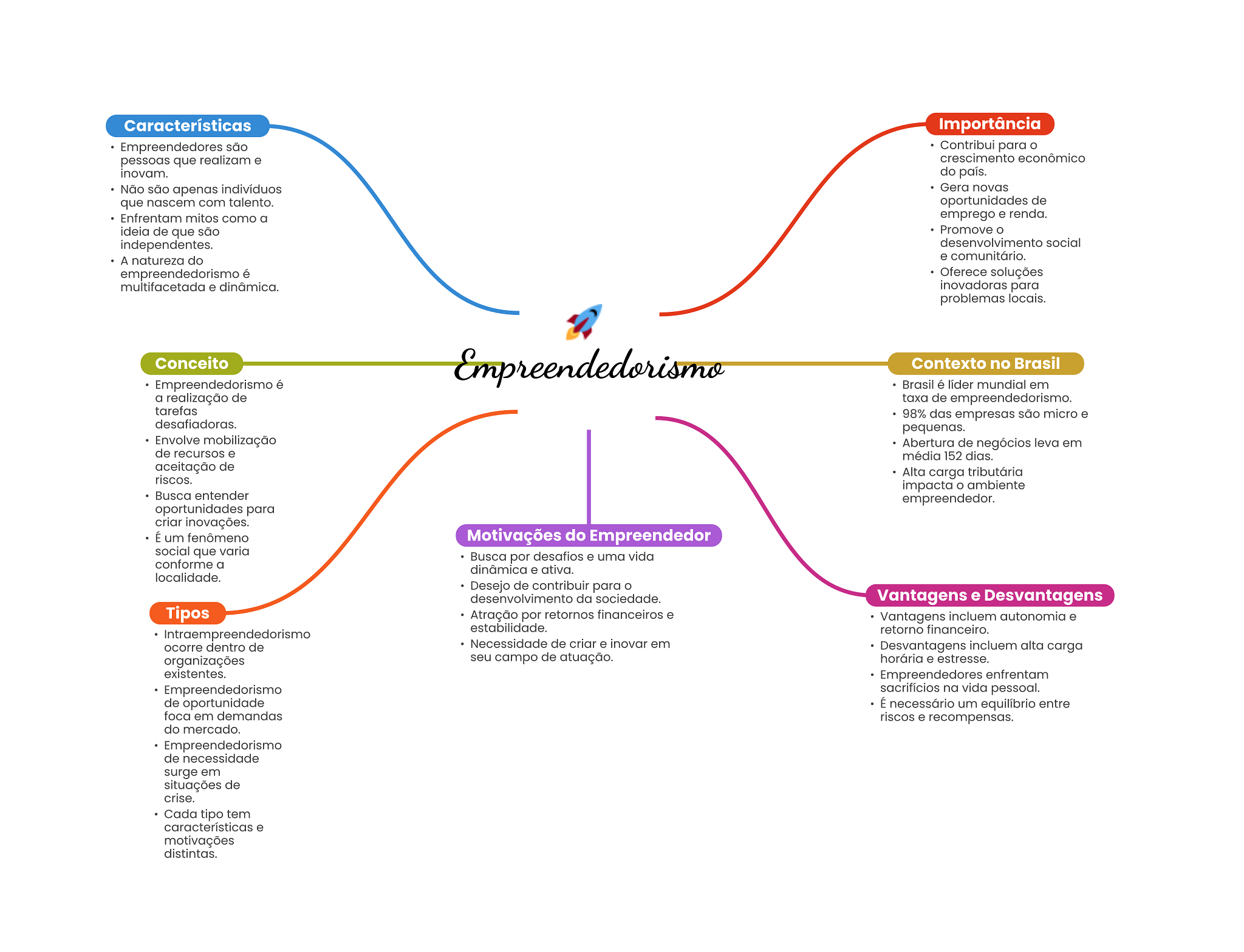 Características Importância Empreendedores são Contribui para pessoas que realizam e crescimento econômico inovam. do país. Não são apenas indivíduos Gera novas que nascem com talento. oportunidades de Enfrentam mitos como a emprego e renda. ideia de que são Promove independentes. desenvolvimento social A natureza do e comunitário. empreendedorismo é Oferece soluções multifacetada e dinâmica. inovadoras para problemas locais. Conceito Empreendedorismo Contexto no Brasil Empreendedorismo é Brasil é líder mundial em a realização de taxa de empreendedorismo. tarefas 98% das empresas são micro e desafiadoras. pequenas. Envolve mobilização Abertura de negócios leva em de recursos e média 152 dias. aceitação de Alta carga tributária riscos. impacta ambiente Busca entender empreendedor. oportunidades para criar inovações. É um fenômeno Motivações do Empreendedor social que varia Busca por desafios e uma vida conforme a dinâmica e ativa. localidade. Desejo de contribuir para da sociedade. Vantagens e Desvantagens Tipos Atração por retornos financeiros e Vantagens incluem autonomia e estabilidade. Intraempreendedorismo retorno financeiro. ocorre dentro de Necessidade de criar e inovar em Desvantagens incluem alta carga organizações seu campo de atuação. horária e estresse. existentes. Empreendedores enfrentam Empreendedorismo sacrifícios na vida pessoal. de oportunidade É necessário um equilíbrio entre foca em demandas riscos e recompensas. do mercado. Empreendedorismo de necessidade surge em situações de crise. Cada tipo tem características e motivações distintas.
