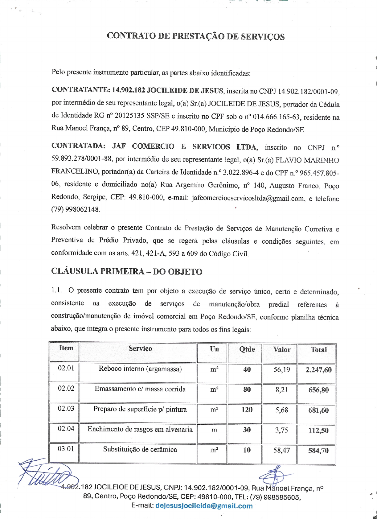 Nota: 2/2026 POÇO REDONDO-SE CNPJ: 13114004000142 AV. ALCINO ALVES COSTA, 363 - CENTRO - CEP 49.810-000 PREFEITURA MUN. DE POCO REDONDO T4O6ZKPA4 Código de verificação 1/2026 Município de Prestação do Serviço 30/01/2026 POÇO REDONDO-SE Data de Emissão NOTA FISCAL ELETRÔNICA DE SERVIÇOS - NFS-e Período de DETALHE DOS SERVIÇOS Descrição Valor Total (R$) RUA MANOEL FRANCA, 089 - CENTRO - CEP 49810000 - POÇO REDONDO - SE CPF/CNPJ Fone/Fax Fone/Fax 14.902.182 JOCILEIDE DE JESUS 14902182000109 (79)9858-5605 Razão Social (00)0000-0000 DEJESUSJOCILEIDE@GMAIL.COM CPF/CNPJ Inscrição E-mail 59893278000188 Endereço 0004783 Razão Social Inscrição Municipal R, RUA AGEMIRO GERONIMO, 140 - CENTRO - CEP 49810000 - POÇO REDONDO - SE Endereço PRESTADOR DE SERVIÇOS 50009635 JAF COMERCIO E SERVICOS LTDA TOMADOR DE SERVIÇOS SIMPLES NACIONAL Regime Tributário 4399101 - Administração de obras CNAE ATIVIDADE ECONÔMICA SERVICOS 070201 - Execução, por administração, de obras de construção civil, hidráulica ou elétrica e de outras obras semelhantes, inclusive sondagem, perfuração de poços, escavação, drenagem e irrigação, terraplanagem, pavimentação, concretagem e a instalação e montagem de produtos, peças e equipamentos (exceto o fornecimento de SERVIÇO Exigibilidade EXIGÍVEL MANUTENÇÃO CIVIL PREDIAL, MANUTENÇÃO HIDROSSANITÁRIA,MANUTENÇÃO ELÉTRICA PREDIAL, FORROS, DIVISÓRIAS E ACABAMENTOS E PINTURA E CONSERVAÇÃO 13.000,00 RETENÇÕES FEDERAIS VALORES Valor dos Serviços ISS (R$)Base de Cálculo do ISS 13.000,00 13.000,00 Valor Liquido (R$) Alíquota (%) 2,01 Valor Total da Nota 261,30 12.738,70 13.000,00 OUTRAS INFORMAÇÕES 0,000,000,00 0,000,00 0,00 PIS (R$) CSLL (R$)IR (R$) OUTRAS RETENÇÕES(R$)COFINS (R$)INSS (R$) ISS Retido (R$) 0,00 Página 1 de 1 Link para validação da Nota Fiscal: https://agnfseprd.agapesistemas.com.br/?alias=pmpoco