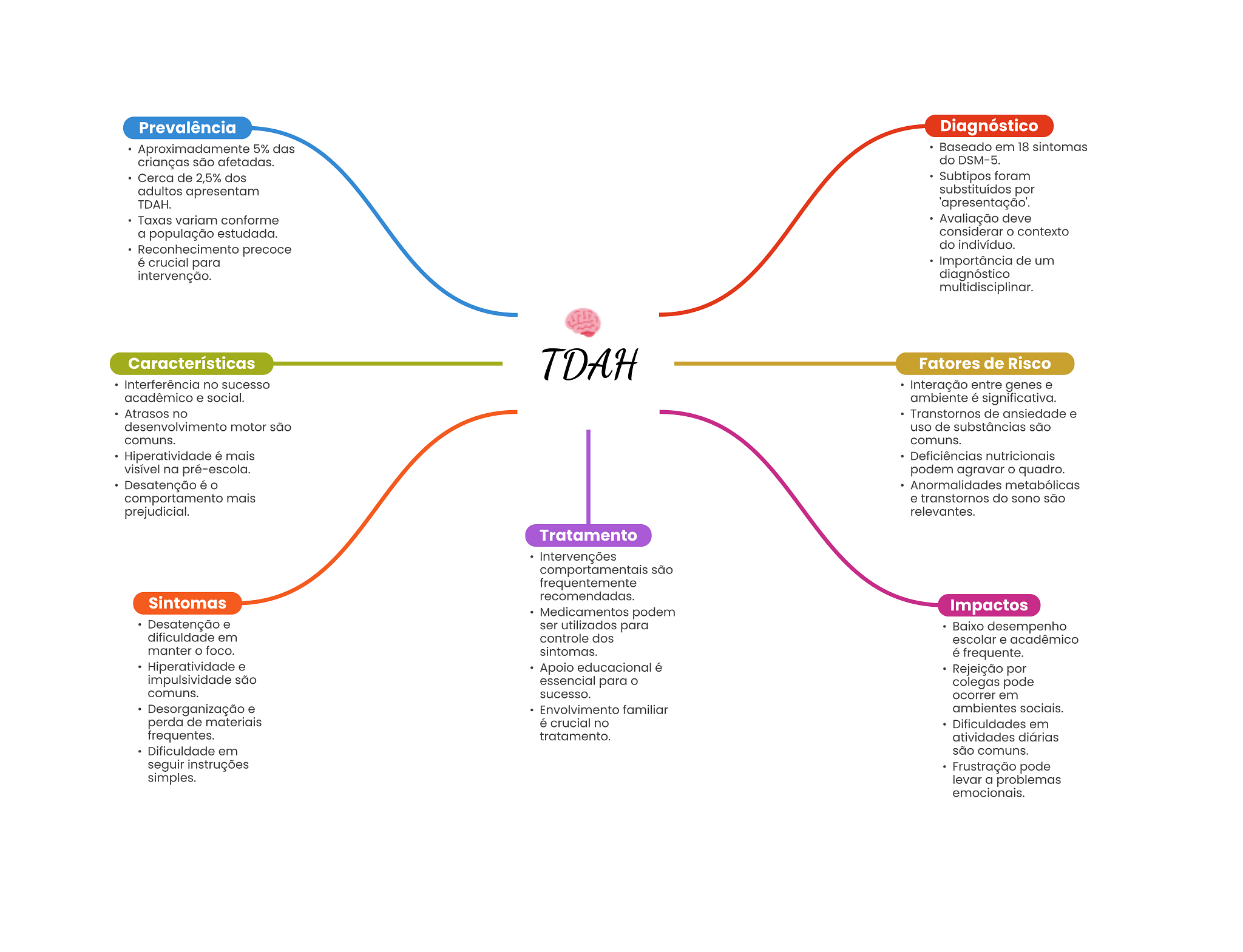 Prevalência Diagnóstico Aproximadamente 5% das Baseado em 18 sintomas crianças são afetadas. do DSM-5. Cerca de 2,5% dos Subtipos foram adultos apresentam substituídos por TDAH. Taxas variam conforme Avaliação deve a população estudada. considerar contexto Reconhecimento precoce do indivíduo. é crucial para Importância de um intervenção. diagnóstico multidisciplinar. Características TDAH Fatores de Risco Interferência no sucesso Interação entre genes e acadêmico e social. ambiente é significativa. Atrasos no Transtornos de ansiedade e desenvolvimento motor são uso de substâncias são comuns. comuns. Hiperatividade é mais Deficiências nutricionais visível na pré-escola. podem agravar quadro. Desatenção é Anormalidades metabólicas comportamento mais e transtornos do sono são prejudicial. relevantes. Tratamento Intervenções comportamentais são frequentemente Sintomas recomendadas. Medicamentos podem Impactos Desatenção e ser utilizados para Baixo desempenho dificuldade em controle dos escolar e acadêmico manter foco. sintomas. é frequente. Hiperatividade e Apoio educacional é Rejeição por impulsividade são essencial para colegas pode comuns. sucesso. ocorrer em Desorganização e Envolvimento familiar ambientes sociais. perda de materiais é crucial no Dificuldades em frequentes. tratamento. atividades diárias Dificuldade em são comuns. seguir instruções Frustração pode simples. levar a problemas emocionais.