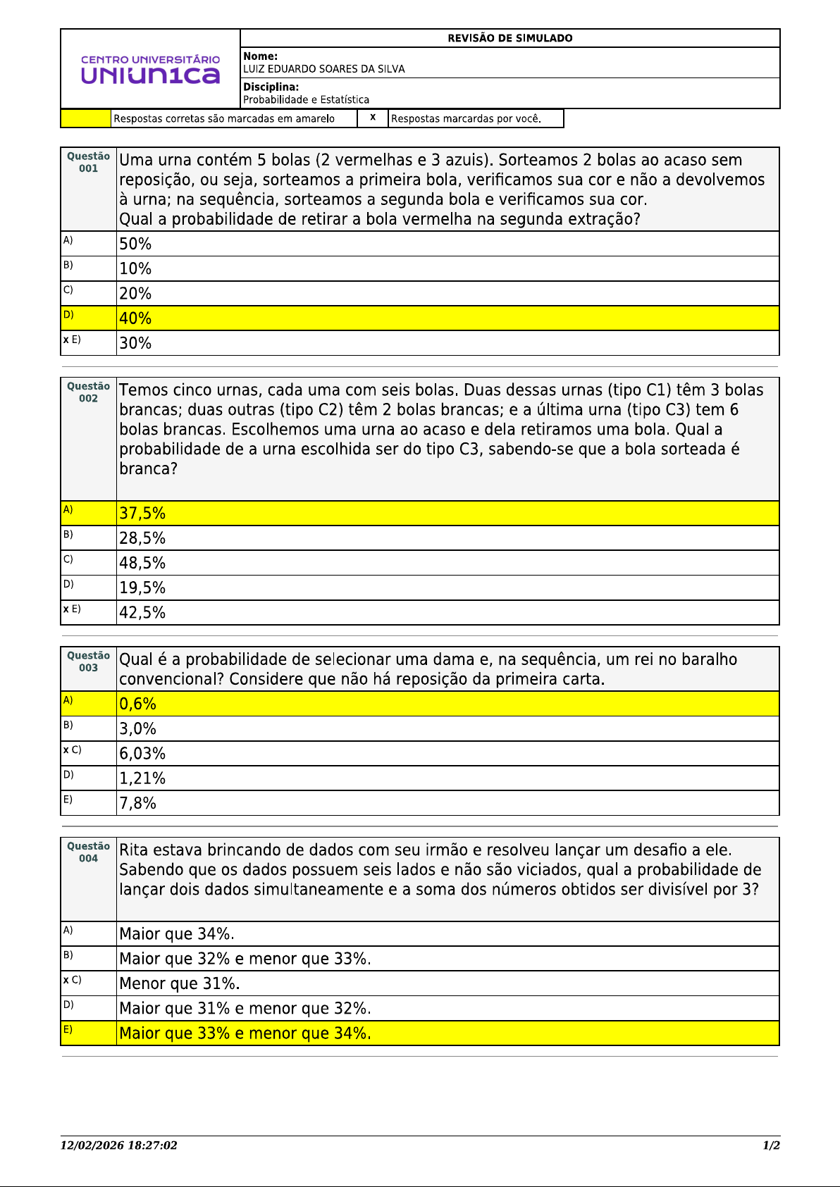 REVISÃO DE SIMULADO CENTRO UNIVERSITÁRIO Nome: LUIZ EDUARDO SOARES DA SILVA Disciplina: Probabilidade e Estatística Respostas corretas são marcadas em amarelo X Respostas marcardas por você. Questão Uma urna contém 5 bolas (2 vermelhas e 3 azuis). Sorteamos 2 bolas ao acaso sem 001 reposição, ou seja, sorteamos a primeira bola, verificamos sua cor e não a devolvemos à urna; na sequência, sorteamos a segunda bola e verificamos sua cor. Qual a probabilidade de retirar a bola vermelha na segunda extração? A) 50% B) 10% C) 20% D) 40% X E) 30% Questão Temos cinco urnas, cada uma com seis bolas. Duas dessas urnas (tipo C1) têm 3 bolas 002 brancas; duas outras (tipo C2) têm 2 bolas brancas; e a última urna (tipo C3) tem 6 bolas brancas. Escolhemos uma urna ao acaso e dela retiramos uma bola. Qual a probabilidade de a urna escolhida ser do tipo C3, sabendo-se que a bola sorteada é branca? A) 37,5% B) 28,5% C) 48,5% D) 19,5% X E) 42,5% Questão Qual é a probabilidade de selecionar uma dama e, na sequência, um rei no baralho 003 convencional? Considere que não há reposição da primeira carta. A) 0,6% B) 3,0% X C) 6,03% D) 1,21% E) 7,8% Questão Rita estava brincando de dados com seu irmão e resolveu lançar um desafio a ele. 004 Sabendo que os dados possuem seis lados e não são viciados, qual a probabilidade de lançar dois dados simultaneamente e a soma dos números obtidos ser divisível por 3? A) Maior que 34%. B) Maior que 32% e menor que 33%. X C) Menor que 31%. D) Maior que 31% e menor que 32%. E) Maior que 33% e menor que 34%. 12/02/2026 18:27:02 1/2Questão Na maternidade de um hospital, durante uma semana, nasceram 300 bebês: 160 005 meninos e 140 meninas. Se um bebê for escolhido aleatoriamente, qual a probabilidade de que não seja menino? X A) 40% B) 57,33% C) 60% D) 46,67% E) 53,33% Questão Ao retirar uma carta de um baralho comum de 52 cartas, qual é a probabilidade de sair 006 uma figura (valete, dama ou rei)? A) 56% X B) 40% C) 67% D) 81% E) 23% Questão (IVIN) No nascimento de três filhos de um casal, qual a probabilidade de que todos 007 sejam do mesmo sexo? A) 25% B) 2% X C) 35% D) 10% E) 20% Questão Uma urna contém 5 bolas (2 vermelhas e 3 azuis). Sorteamos 2 bolas ao acaso sem 008 reposição, ou seja, sorteamos a primeira bola, verificamos sua cor e não a devolvemos à urna; na sequência, sorteamos a segunda bola e verificamos sua cor. Qual a probabilidade de retirar a bola azul, dado que a primeira foi vermelha? A) 40% B) 75% C) 25% D) 65% E) 50% 12/02/2026 18:27:02 2/2