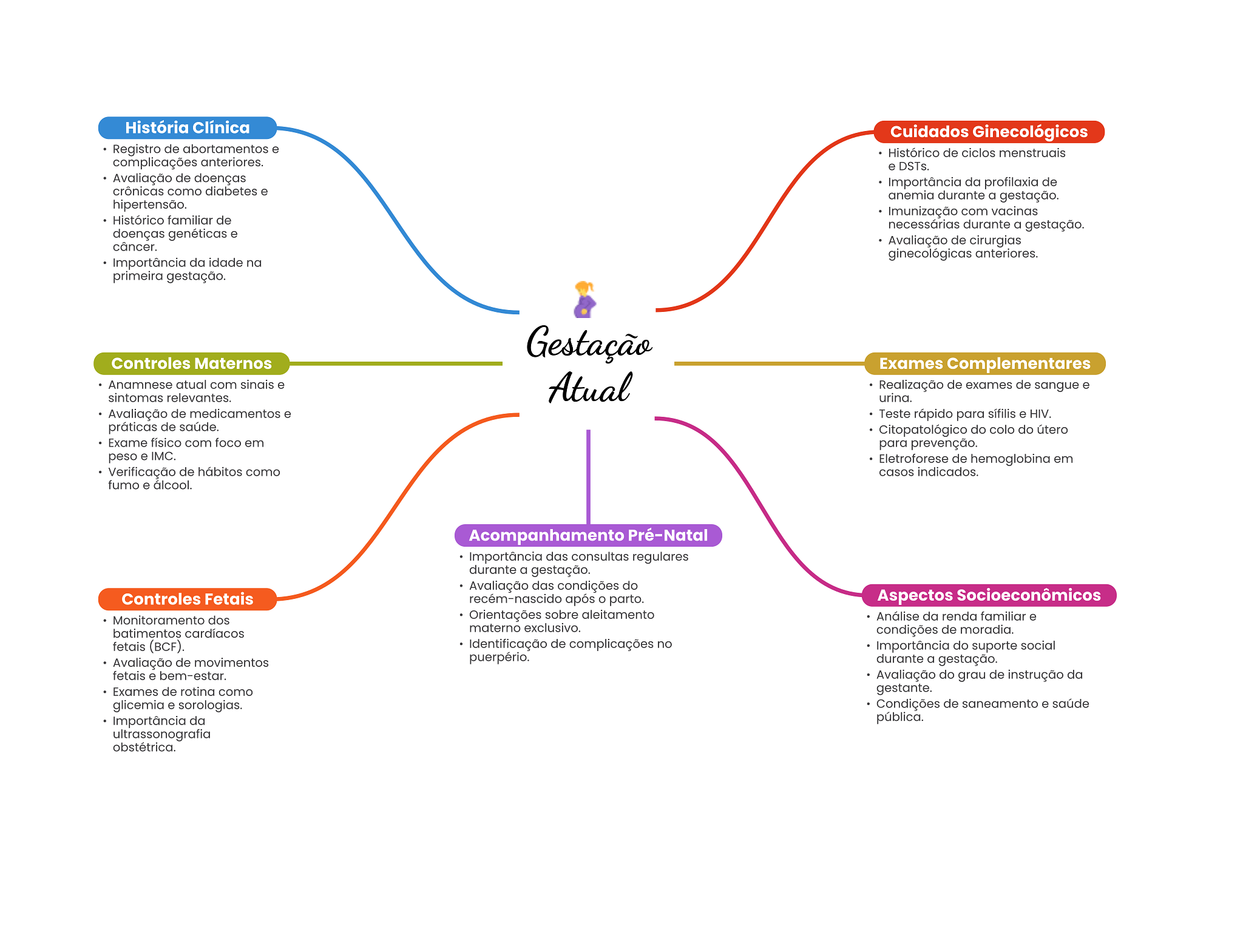 História Clínica Cuidados Ginecológicos Registro de abortamentos e Histórico de ciclos menstruais complicações anteriores. e DSTs. Avaliação de doenças Importância da profilaxia de crônicas como diabetes e anemia durante a gestação. hipertensão. Imunização com vacinas Histórico familiar de necessárias durante a gestação. doenças genéticas e câncer. Avaliação de cirurgias ginecológicas anteriores. Importância da idade na primeira gestação. Gestação Controles Maternos Exames Complementares Anamnese atual com sinais e sintomas relevantes. Atual Realização de exames de sangue e urina. Avaliação de medicamentos e Teste rápido para sífilis e HIV. práticas de saúde. Citopatológico do colo do útero Exame físico com foco em para prevenção. peso e IMC. Eletroforese de hemoglobina em Verificação de hábitos como casos indicados. fumo e álcool. Acompanhamento Pré-Natal Importância das consultas regulares durante a gestação. Avaliação das condições do Controles Fetais recém-nascido após parto. Aspectos Socioeconômicos Monitoramento dos Orientações sobre aleitamento Análise da renda familiar e batimentos cardíacos materno exclusivo. condições de moradia. fetais (BCF). Identificação de complicações no Importância do suporte social Avaliação de movimentos puerpério. durante a gestação. fetais e bem-estar. Avaliação do grau de instrução da Exames de rotina como gestante. glicemia e sorologias. Condições de saneamento e saúde Importância da pública. ultrassonografia obstétrica.