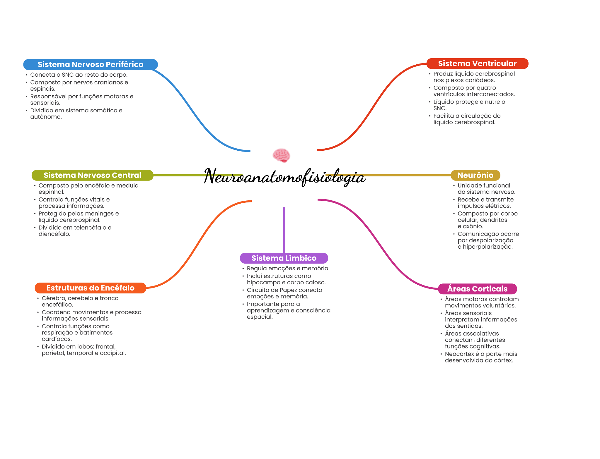 Sistema Nervoso Periférico Sistema Ventricular Conecta SNC ao resto do corpo. Produz líquido cerebrospinal Composto por nervos cranianos e nos plexos coriódeos. espinais. Composto por quatro Responsável por funções motoras e ventrículos interconectados. sensoriais. Líquido protege e nutre Dividido em sistema somático e SNC. autônomo. Facilita a circulação do líquido cerebrospinal. Sistema Nervoso Central Neuroanatomofisiologia Neurônio Composto pelo encéfalo e medula Unidade funcional espinhal. do sistema nervoso. Controla funções vitais e Recebe e transmite processa informações. impulsos elétricos. Protegido pelas meninges e Composto por corpo líquido cerebrospinal. celular, dendritos Dividido em telencéfalo e e axônio. diencéfalo. Comunicação ocorre por despolarização e hiperpolarização. Sistema Límbico Regula emoções e memória. Inclui estruturas como hipocampo e corpo caloso. Estruturas do Encéfalo Circuito de Papez conecta Áreas Corticais Cérebro, cerebelo e tronco emoções e memória. Áreas motoras controlam encefálico. Importante para a movimentos voluntários. Coordena movimentos e processa aprendizagem e consciência Áreas sensoriais informações sensoriais. espacial. interpretam informações Controla funções como dos sentidos. respiração e batimentos Áreas associativas cardíacos. conectam diferentes Dividido em lobos: frontal, funções cognitivas. parietal, temporal e occipital. Neocórtex é a parte mais desenvolvida do córtex.