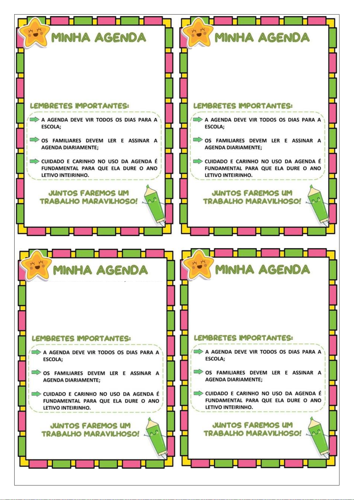 - ‘’’’’ Olá família! Esta agenda começa a partir de hoje a cumprir uma missão importantíssima. A mesma, será o meio de comunicação entre família e escola. Esta, levará bilhetes, mensagens, convites e muitas informações. As crianças devem cuidar e trazê-la diariamente para escola. Os pais, devem assinar todos os recados. _____________________________________________ (Assinatura do responsável) _____________________________________________ (Assinatura do responsável) _____________________________________________ (Assinatura do responsável) _____________________________________________ (Assinatura do responsável) Olá família! Esta agenda começa a partir de hoje a cumprir uma missão importantíssima. A mesma, será o meio de comunicação entre família e escola. Esta, levará bilhetes, mensagens, convites e muitas informações. As crianças devem cuidar e trazê-la diariamente para escola. Os pais, devem assinar todos os recados. Olá família! Esta agenda começa a partir de hoje a cumprir uma missão importantíssima. A mesma, será o meio de comunicação entre família e escola. Esta, levará bilhetes, mensagens, convites e muitas informações. As crianças devem cuidar e trazê-la diariamente para escola. Os pais, devem assinar todos os recados. Olá família! Esta agenda começa a partir de hoje a cumprir uma missão importantíssima. A mesma, será o meio de comunicação entre família e escola. Esta, levará bilhetes, mensagens, convites e muitas informações. As crianças devem cuidar e trazê-la diariamente para escola. Os pais, devem assinar todos os recados.