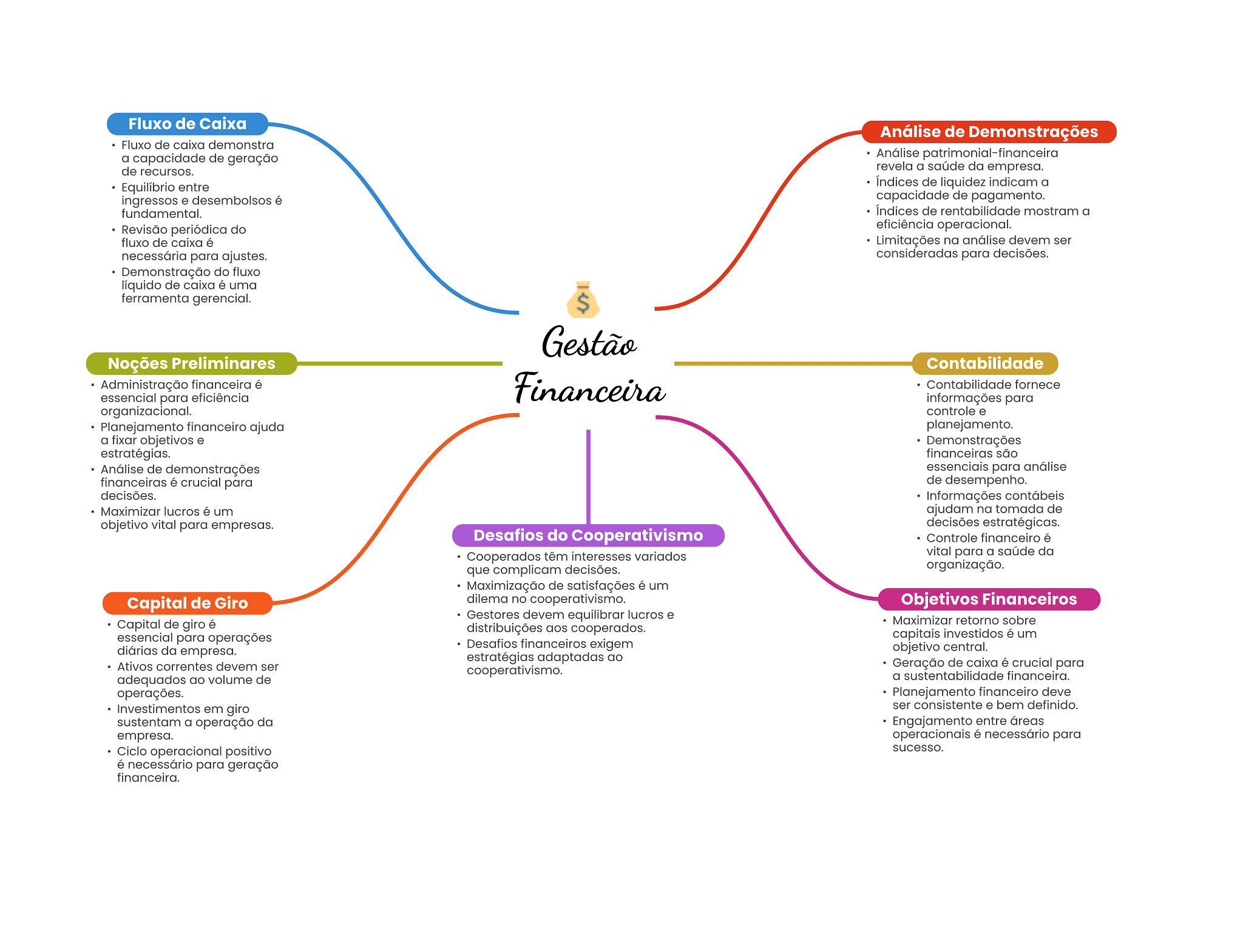 Fluxo de Caixa Análise de Demonstrações Fluxo de caixa demonstra a capacidade de geração Análise patrimonial-financeiro de recursos. revela a saúde da empresa. Equilíbrio entre de liquidez indicam a ingressos e desembolsos é capacidade de pagamento. fundamental. Indices de rentabilidade mostram a Revisão periódica do eficiência operacional. fluxo de caixa é Limitações na análise devem ser necessária para ajustes. consideradas para decisões. Demonstração do fluxo líquido de caixa é uma ferramenta gerencial. $ Gestão Noções Preliminares Contabilidade Administração financeira é Financeira Contabilidade fornece essencial para eficiência informações para organizacional. controle e Planejamento financeiro ajuda planejamento. a fixar objetivos e Demonstrações estratégias. financeiras são Análise de demonstrações essenciais para análise financeiras é crucial para de desempenho. decisões. Informações contábeis Maximizar lucros é um ajudam na tomada de objetivo vital para empresas. decisões estratégicas. Desafios do Cooperativismo Controle financeiro é Cooperados têm interesses variados vital para a saúde da que complicam decisões. organização. Maximização de satisfações é um Capital de Giro dilema no cooperativismo. Objetivos Financeiros Gestores devem equilibrar lucros e Capital de giro é Maximizar retorno sobre distribuições aos cooperados. essencial para operações capitais investidos é um diárias da empresa. Desafios financeiros exigem objetivo central. estratégias adaptadas ao Ativos correntes devem ser Geração de caixa é crucial para cooperativismo. adequados ao volume de a sustentabilidade financeira. operações. Planejamento financeiro deve Investimentos em giro ser consistente e bem definido. sustentam a operação da Engajamento entre áreas empresa. operacionais é necessário para Ciclo operacional positivo sucesso. é necessário para geração financeira.