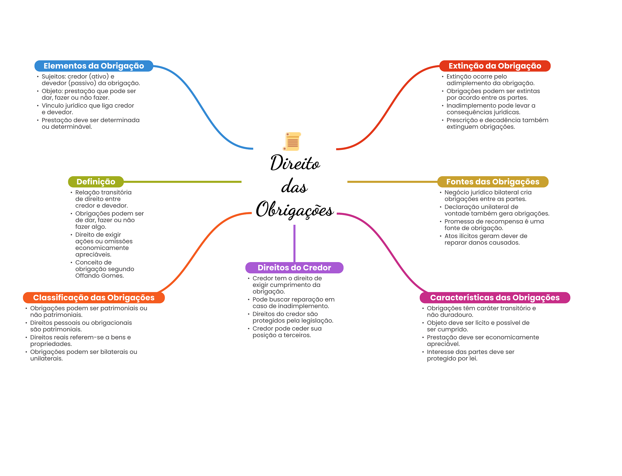 Elementos da Obrigação Extinção da Obrigação Sujeitos: credor (ativo) e Extinção ocorre pelo devedor (passivo) da obrigação. adimplemento da obrigação. Objeto: prestação que pode ser Obrigações podem ser extintas dar, fazer ou não fazer. por acordo entre as partes. Vínculo jurídico que liga credor Inadimplemento pode levar a e devedor. consequências jurídicas. Prestação deve ser determinada Prescrição e decadência também ou determinável. extinguem obrigações. Direito Definição das Fontes das Obrigações Relação transitória Negócio jurídico bilateral cria de direito entre obrigações entre as partes. credor e devedor. Obrigações Declaração unilateral de Obrigações podem ser vontade também gera obrigações. de dar, fazer ou não Promessa de recompensa é uma fazer algo. fonte de obrigação. Direito de exigir Atos ilícitos geram dever de ações ou omissões reparar danos causados. apreciáveis. Conceito de obrigação segundo Direitos do Credor Offando Gomes. Credor tem direito de exigir cumprimento da obrigação. Classificação das Obrigações Pode buscar reparação em Características das Obrigações Obrigações podem ser patrimoniais ou caso de inadimplemento. Obrigações têm caráter transitório e não patrimoniais. Direitos do credor são não duradouro. Direitos pessoais ou obrigacionais protegidos pela legislação. Objeto deve ser lícito e possível de são patrimoniais. Credor pode ceder sua ser cumprido. Direitos reais referem-se a bens e posição a terceiros. Prestação deve ser economicamente propriedades. apreciável. Obrigações podem ser bilaterais ou Interesse das partes deve ser unilaterais. protegido por lei.