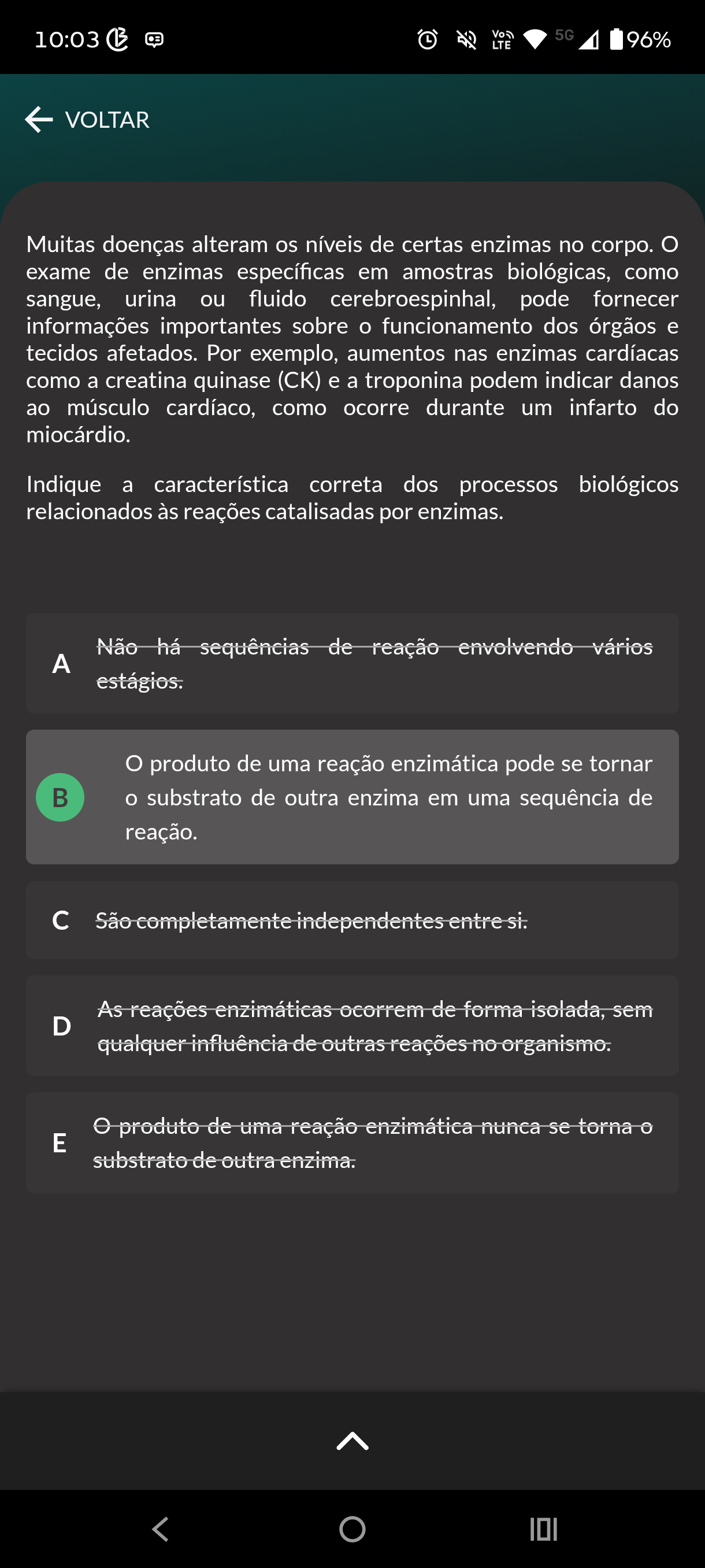 10:03 - 5G LTE 96% VOLTAR Muitas doenças alteram os níveis de certas enzimas no corpo. exame de enzimas específicas em amostras biológicas, como sangue, urina ou fluido cerebroespinhal, pode fornecer informações importantes sobre funcionamento dos órgãos e tecidos afetados. Por exemplo, aumentos nas enzimas cardíacas como a creatina quinase (CK) e a troponina podem indicar danos ao músculo cardíaco, como ocorre durante um infarto do miocárdio. Indique a característica correta dos processos biológicos relacionados às reações catalisadas por enzimas. Não há sequências de reação envolvendo vários A estágios. produto de uma reação enzimática pode se tornar substrato de outra enzima em uma sequência de reação. c São completamente independentes entre si. As reações enzimáticas ocorrem de forma isolada, sem D qualquer influência de outras reações no organismo. produto de uma reação enzimática nunca se torna E substrato de outra enzima.