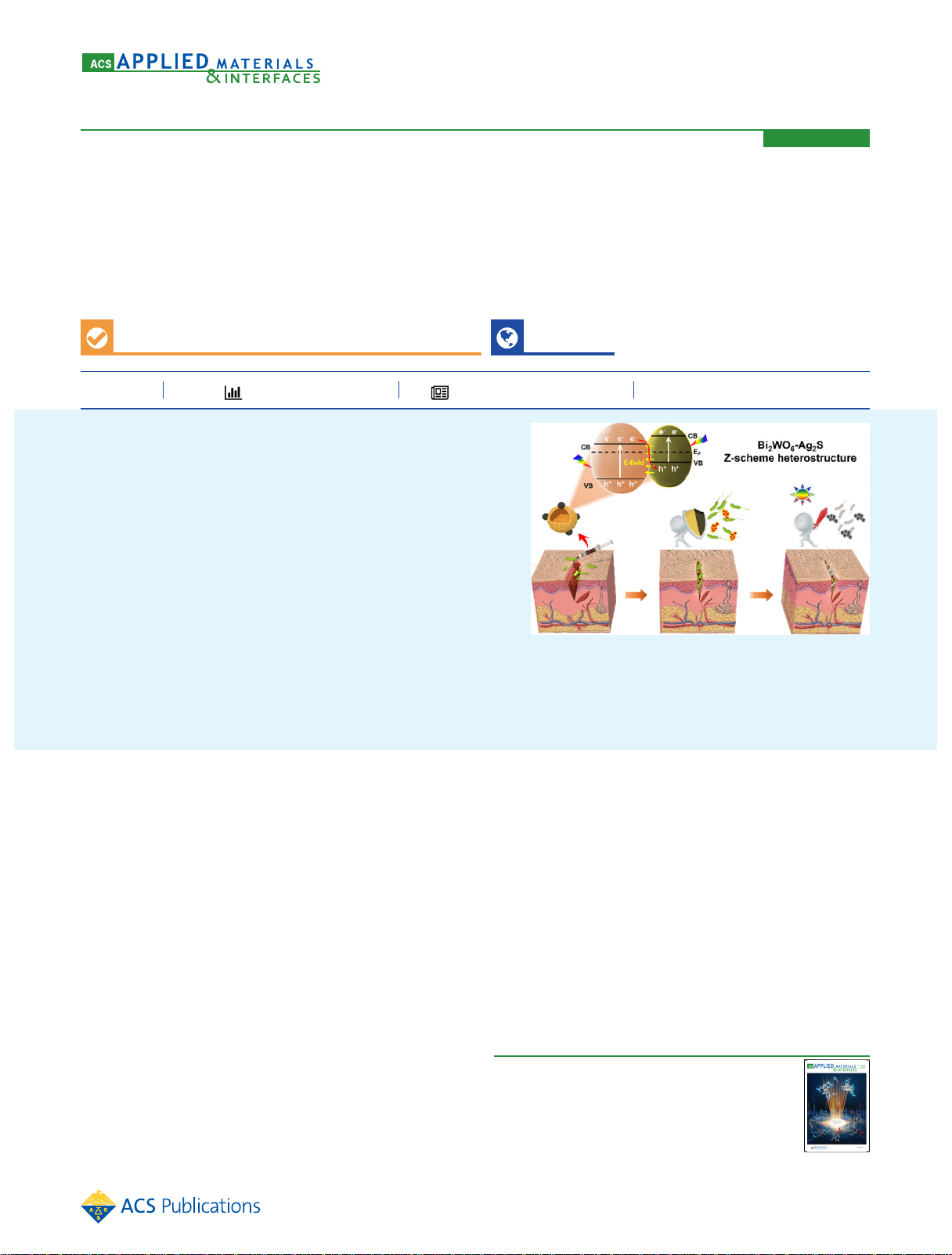 Bismuth Tungstate−Silver Sulfide Z‑Scheme Heterostructure Nanoglue Promotes Wound Healing through Wound Sealing and Bacterial Inactivation Liqi Wei, Yining Chen, Xinru Yu, Yan Yan, Hongxiang Liu, Xingyu Cui, Xin Liu, Xiaodong Yang, Jiaqi Meng, Shuo Yang, Lili Wang, Xizhen Yang, Rui Chen,* and Yan Cheng* Cite This: ACS Appl. Mater. Interfaces 2022, 14, 53491−53500 Read Online ACCESS Metrics & More Article Recommendations *sı Supporting Information ABSTRACT: Rapid wound closure and bacterial inactivation are effective strategies to promote wound healing. Herein, a versatile nanoglue, bismuth tungstate (Bi2WO6)−silver sulfide (Ag2S) direct Z- scheme heterostructure nanoparticles (BWOA NPs), was designed to accelerate wound healing. BWOA NPs’ hollow structure and rough surface could effectively close wound tissues acting as a barrier between external bacteria and the wound. More importantly, the unique Z-scheme heterostructure endows BWOA NPs with an effective electron and hole separating ability with potent redox potential, where electrons and holes could effectively react with water and oxygen to produce reactive oxygen species, leading to a higher antibacterial activity against both endogenous and external bacteria at the wound site. A series of in vitro and in vivo biological assessments demonstrated that BWOA NPs could rapidly close wounds and promote wound healing. With sunlight irradiation, the inhibiting rates of BWOA NPs against Escherichia coli and Staphylococcus aureus are 61.62 ± 2.85 and 73.40 ± 3.28%, respectively. Also, the wound healing rate in BWOA NP-treated mice is 25.90 ± 5.85% higher than PBS. This design provides a new effective strategy to promote bacterial inactivation and accelerate wound healing. KEYWORDS: wound healing, Z-scheme, antibacterial, adhesion, reactive oxygen species ■ INTRODUCTION The skin is an effective barrier protecting the human body from noxious outside environmental threats.1 Once the skin is severely damaged and long exposed to harmful bacteria and viruses, it will lead to diseases such as ulceration, infection, sepsis, or even death.2−5 Thus, cutaneous wound healing is very important for the repair and recovery of tissue function after injury.6 Recently, certain nanomaterials with particular physical and chemical properties have been used for treating cutaneous wounds and accelerate their healing.7−10 Photo- catalytic antibacterial agents, such as titania,11 graphene quantum dots,12 copper metal−organic framework hydro- gels,13,14 and black phosphorus,15,16 have been widely investigated for their potential to accelerate the wound healing process due to their excellent photocatalytic antibacterial activity. However, the ideal nanomaterials should promote wound healing through various activities. Since bleeding and bacterial infection are characteristics in the early stage of wound formation, nanomaterials exhibiting hemostatic (stop bleeding) and antibacterial properties could be beneficial for speeding up wound healing. Rapid wound closure is an effective wound healing strategy because not only can it stop bleeding but also reduce the risk of bacterial infection due to decreased wound exposure. Some adhesives, such as bioinspired medical adhesives,17,18 self- assembling peptides,19 multifunctional films,20 or polymer- based hydrogels,21,22 have been designed to this effect. Recently, a few inorganic nanomaterials, such as iron oxide and ceria, have been used for wound closure as well due to their nanobridging effects;23,24 because of the excellent adhesive performance of biological tissues by silica nano- particles (NPs), which was reported by Rose et al.,25 our recent work has shown that a hollow and rough surface can effectively increase the adhesive performance of ceria NPs.26 Thus, we speculate that other inorganic NPs with similar morphology could be used for rapid wound closure. Received: August 25, 2022 Accepted: November 10, 2022 Published: November 23, 2022 Research Articlewww.acsami.org © 2022 American Chemical Society 53491 https://doi.org/10.1021/acsami.2c15299 ACS Appl. Mater. Interfaces 2022, 14, 53491−53500 D ow nl oa de d vi a U N IV R E G I D O C A R IR I on J an ua ry 2 7, 2 02 6 at 2 0: 29 :4 2 (U T C ). Se e ht tp s: //p ub s. ac s. or g/ sh ar in gg ui de lin es f or o pt io ns o n ho w to le gi tim at el y sh ar e pu bl is he d ar tic le s. https://pubs.acs.org/action/doSearch?field1=Contrib&text1="Liqi+Wei"&field2=AllField&text2=&publication=&accessType=allContent&Earliest=&ref=pdf https://pubs.acs.org/action/doSearch?field1=Contrib&text1="Yining+Chen"&field2=AllField&text2=&publication=&accessType=allContent&Earliest=&ref=pdf https://pubs.acs.org/action/doSearch?field1=Contrib&text1="Xinru+Yu"&field2=AllField&text2=&publication=&accessType=allContent&Earliest=&ref=pdf https://pubs.acs.org/action/doSearch?field1=Contrib&text1="Yan+Yan"&field2=AllField&text2=&publication=&accessType=allContent&Earliest=&ref=pdf https://pubs.acs.org/action/doSearch?field1=Contrib&text1="Hongxiang+Liu"&field2=AllField&text2=&publication=&accessType=allContent&Earliest=&ref=pdf https://pubs.acs.org/action/doSearch?field1=Contrib&text1="Xingyu+Cui"&field2=AllField&text2=&publication=&accessType=allContent&Earliest=&ref=pdf https://pubs.acs.org/action/doSearch?field1=Contrib&text1="Xin+Liu"&field2=AllField&text2=&publication=&accessType=allContent&Earliest=&ref=pdf https://pubs.acs.org/action/doSearch?field1=Contrib&text1="Xiaodong+Yang"&field2=AllField&text2=&publication=&accessType=allContent&Earliest=&ref=pdf https://pubs.acs.org/action/doSearch?field1=Contrib&text1="Jiaqi+Meng"&field2=AllField&text2=&publication=&accessType=allContent&Earliest=&ref=pdf https://pubs.acs.org/action/doSearch?field1=Contrib&text1="Jiaqi+Meng"&field2=AllField&text2=&publication=&accessType=allContent&Earliest=&ref=pdf https://pubs.acs.org/action/doSearch?field1=Contrib&text1="Shuo+Yang"&field2=AllField&text2=&publication=&accessType=allC