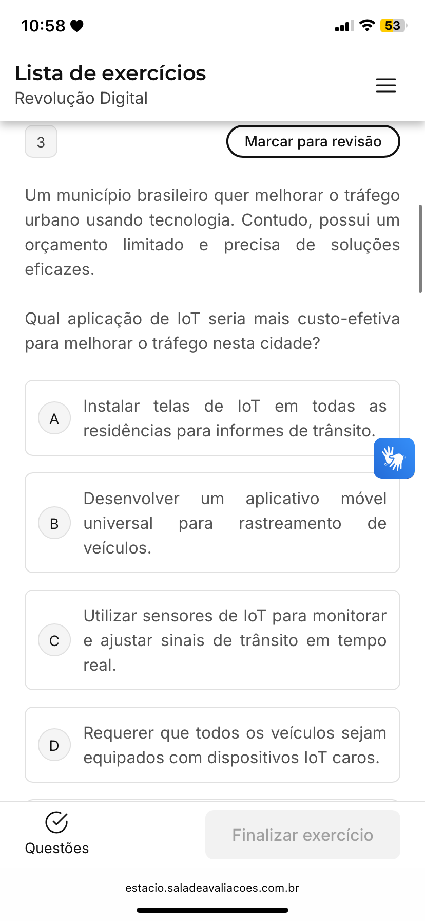 10:58 53 Lista de exercícios Revolução Digital 3 Marcar para revisão Um município brasileiro quer melhorar o tráfego urbano usando tecnologia. Contudo, possui um orçamento limitado e precisa de soluções eficazes. Qual aplicação de loT seria mais custo-efetiva para melhorar o tráfego nesta cidade? Instalar telas de loT em todas as A residências para informes de trânsito. Desenvolver um aplicativo móvel B universal para rastreamento de veículos. Utilizar sensores de loT para monitorar c e ajustar sinais de trânsito em tempo real. Requerer que todos os veículos sejam D equipados com dispositivos loT caros. Finalizar exercício Questões estacio.saladeavaliacoes.com.br