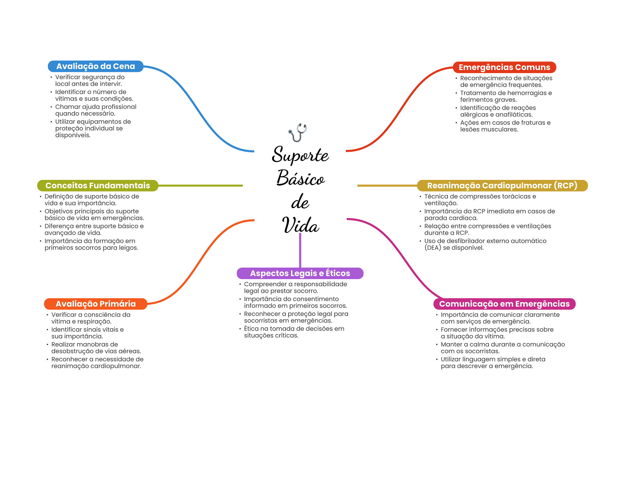 Avaliação da Cena Emergências Comuns Verificar segurança do Reconhecimento de situações local antes de intervir. de emergência frequentes. Identificar número de Tratamento de hemorragias e vítimas e suas condições. ferimentos graves. Chamar ajuda profissional Identificação de reações quando necessário. alérgicas e anafiláticas. Utilizar equipamentos de Ações em casos de fraturas e proteção individual se lesões musculares. disponíveis. Suporte Básico Conceitos Fundamentais Reanimação Cardiopulmonar (RCP) Definição de suporte básico de de Técnica de compressões torácicas e vida e sua importância. ventilação. Objetivos principais do suporte Importância da RCP imediata em casos de básico de vida em emergências. Diferença entre suporte básico e Vida parada cardíaca. Relação entre compressões e ventilações avançado de vida. durante a RCP. Importância da formação em Uso de desfibrilador externo automático primeiros socorros para leigos. (DEA) se disponível. Aspectos Legais e Éticos Compreender a responsabilidade legal ao prestar socorro. Importância do consentimento Avaliação Primária informado em primeiros socorros. Comunicação em Emergências Verificar a consciência da Reconhecer a proteção legal para Importância de comunicar claramente vítima e respiração. socorristas em emergências. com serviços de emergência. Identificar sinais vitais e Ética na tomada de decisões em Fornecer informações precisas sobre sua importância. situações críticas. a situação da vítima. Realizar manobras de Manter a calma durante a comunicação desobstrução de vias aéreas. com socorristas. Reconhecer a necessidade de Utilizar linguagem simples e direta reanimação cardiopulmonar. para descrever a emergência.