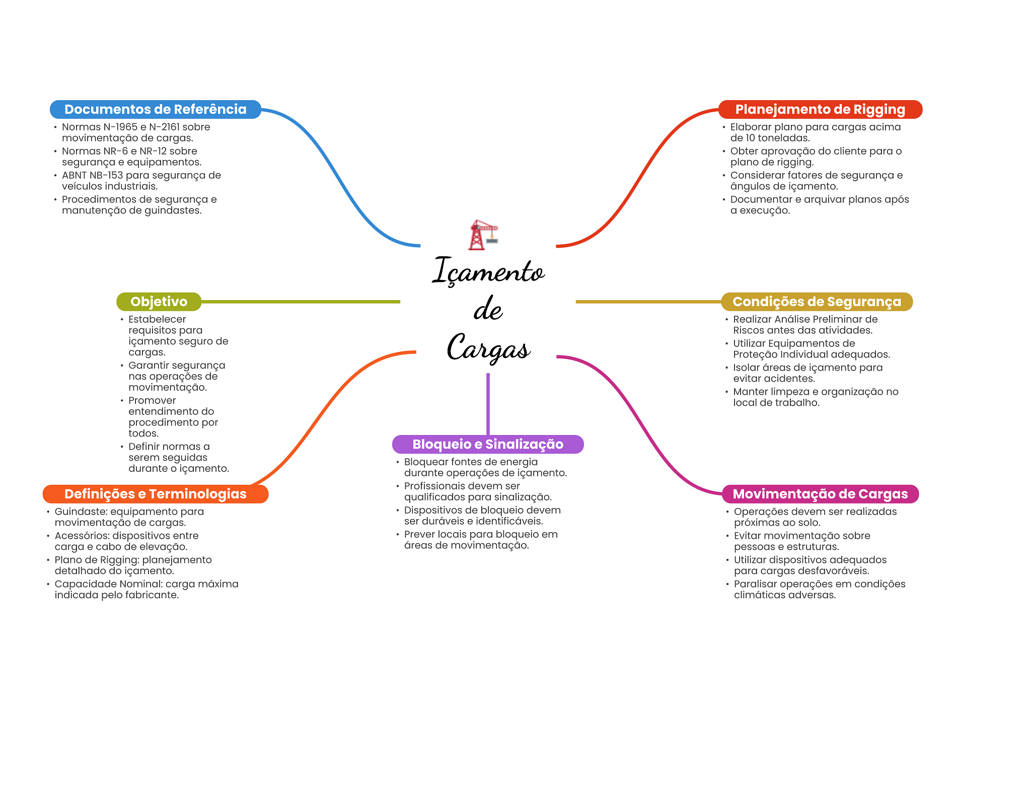 Documentos de Referência Planejamento de Rigging Normas N-1965 e N-2161 sobre Elaborar plano para cargas acima movimentação de cargas. de 10 toneladas. Normas NR-6 e NR-12 sobre Obter aprovação do cliente para segurança e equipamentos. plano de rigging. ABNT NB-153 para segurança de Considerar fatores de segurança e veículos industriais. ângulos de içamento. Procedimentos de segurança e Documentar e arquivar planos após manutenção de guindastes. a execução. Içamento Objetivo de Condições de Segurança Estabelecer Realizar Análise Preliminar de requisitos para Riscos antes das atividades. içamento seguro de Cargas Utilizar Equipamentos de cargas. Proteção Individual adequados. Garantir segurança Isolar áreas de içamento para nas operações de evitar acidentes. movimentação. Manter limpeza e organização no Promover local de trabalho. entendimento do procedimento por todos. Definir normas a Bloqueio e Sinalização serem seguidas Bloquear fontes de energia durante O içamento. durante operações de içamento. Profissionais devem ser Definições e Terminologias qualificados para sinalização. Movimentação de Cargas Guindaste: equipamento para Dispositivos de bloqueio devem Operações devem ser realizadas movimentação de cargas. ser duráveis e identificáveis. próximas ao solo. Acessórios: dispositivos entre Prever locais para bloqueio em Evitar movimentação sobre carga e cabo de elevação. áreas de movimentação. pessoas e estruturas. Plano de Rigging: planejamento Utilizar dispositivos adequados detalhado do içamento. para cargas desfavoráveis. Capacidade Nominal: carga máxima Paralisar operações em condições indicada pelo fabricante. climáticas adversas.