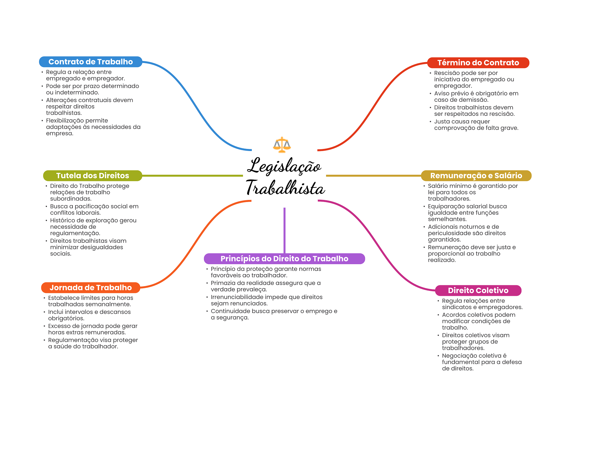 Contrato de Trabalho Término do Contrato Regula a relação entre Rescisão pode ser por empregado e empregador. iniciativa do empregado ou Pode ser por prazo determinado empregador. ou indeterminado. Aviso prévio é obrigatório em Alterações contratuais devem caso de demissão. respeitar direitos Direitos trabalhistas devem trabalhistas. ser respeitados na rescisão. Flexibilização permite Justa causa requer adaptações às necessidades da comprovação de falta grave. empresa. Legislação Tutela dos Direitos Remuneração e Salário Direito do Trabalho protege relações de trabalho Trabalhista Salário mínimo é garantido por lei para todos subordinadas. trabalhadores. Busca a pacificação social em Equiparação salarial busca conflitos laborais. igualdade entre funções Histórico de exploração gerou semelhantes. necessidade de Adicionais noturnos e de regulamentação. periculosidade são direitos Direitos trabalhistas visam garantidos. minimizar desigualdades Remuneração deve ser justa e sociais. proporcional ao trabalho Princípios do Direito do Trabalho realizado. Princípio da proteção garante normas favoráveis ao trabalhador. Primazia da realidade assegura que a Jornada de Trabalho verdade prevaleça. Direito Coletivo Estabelece limites para horas Irrenunciabilidade impede que direitos trabalhadas semanalmente. sejam renunciados. Regula relações entre sindicatos e empregadores. Inclui intervalos e descansos Continuidade busca preservar emprego e obrigatórios. a segurança. Acordos coletivos podem modificar condições de Excesso de jornada pode gerar trabalho. horas extras remuneradas. Direitos coletivos visam Regulamentação visa proteger proteger grupos de a saúde do trabalhador. trabalhadores. Negociação coletiva é fundamental para a defesa de direitos.