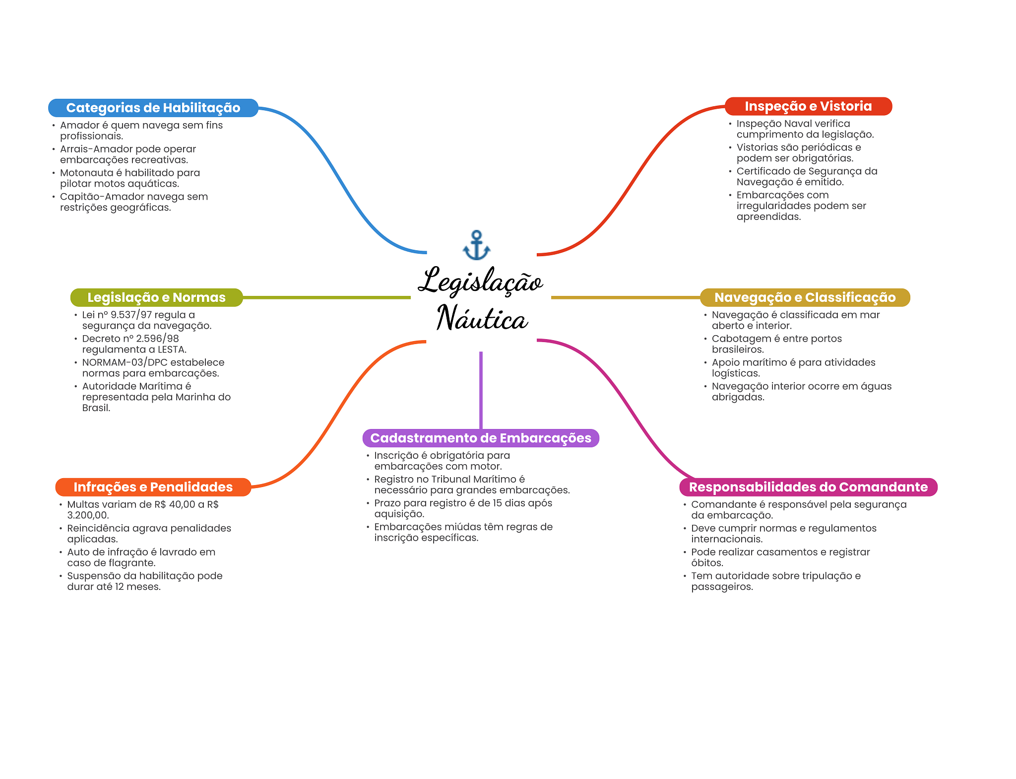 Categorias de Habilitação Inspeção e Vistoria Amador é quem navega sem fins Inspeção Naval verifica profissionais. cumprimento da legislação. Arrais-Amador pode operar Vistorias são periódicas e embarcações recreativas. podem ser obrigatórias. Motonauta é habilitado para Certificado de Segurança da pilotar motos aquáticas. Navegação é emitido. Capitão-Amador navega sem Embarcações com restrições geográficas. irregularidades podem ser apreendidas. Legislação Legislação e Normas Navegação e Classificação Lei n° 9.537/97 regula a Náutica Navegação é classificada em mar segurança da navegação. aberto e interior. Decreto n° 2.596/98 Cabotagem é entre portos regulamenta a LESTA. brasileiros. NORMAM-03/DPC estabelece Apoio marítimo é para atividades normas para embarcações. logísticas. Autoridade Marítima é Navegação interior ocorre em águas representada pela Marinha do abrigadas. Brasil. Cadastramento de Embarcações Inscrição é obrigatória para embarcações com motor. Registro no Tribunal Marítimo é Infrações e Penalidades necessário para grandes embarcações. Responsabilidades do Comandante Multas variam de R$ 40,00 a R$ Prazo para registro é de 15 dias após Comandante é responsável pela segurança 3.200,00. aquisição. da embarcação. Reincidência agrava penalidades Embarcações miúdas têm regras de Deve cumprir normas e regulamentos aplicadas. inscrição específicas. internacionais. Auto de infração é lavrado em Pode realizar casamentos e registrar caso de flagrante. óbitos. Suspensão da habilitação pode Tem autoridade sobre tripulação e durar até 12 meses. passageiros.