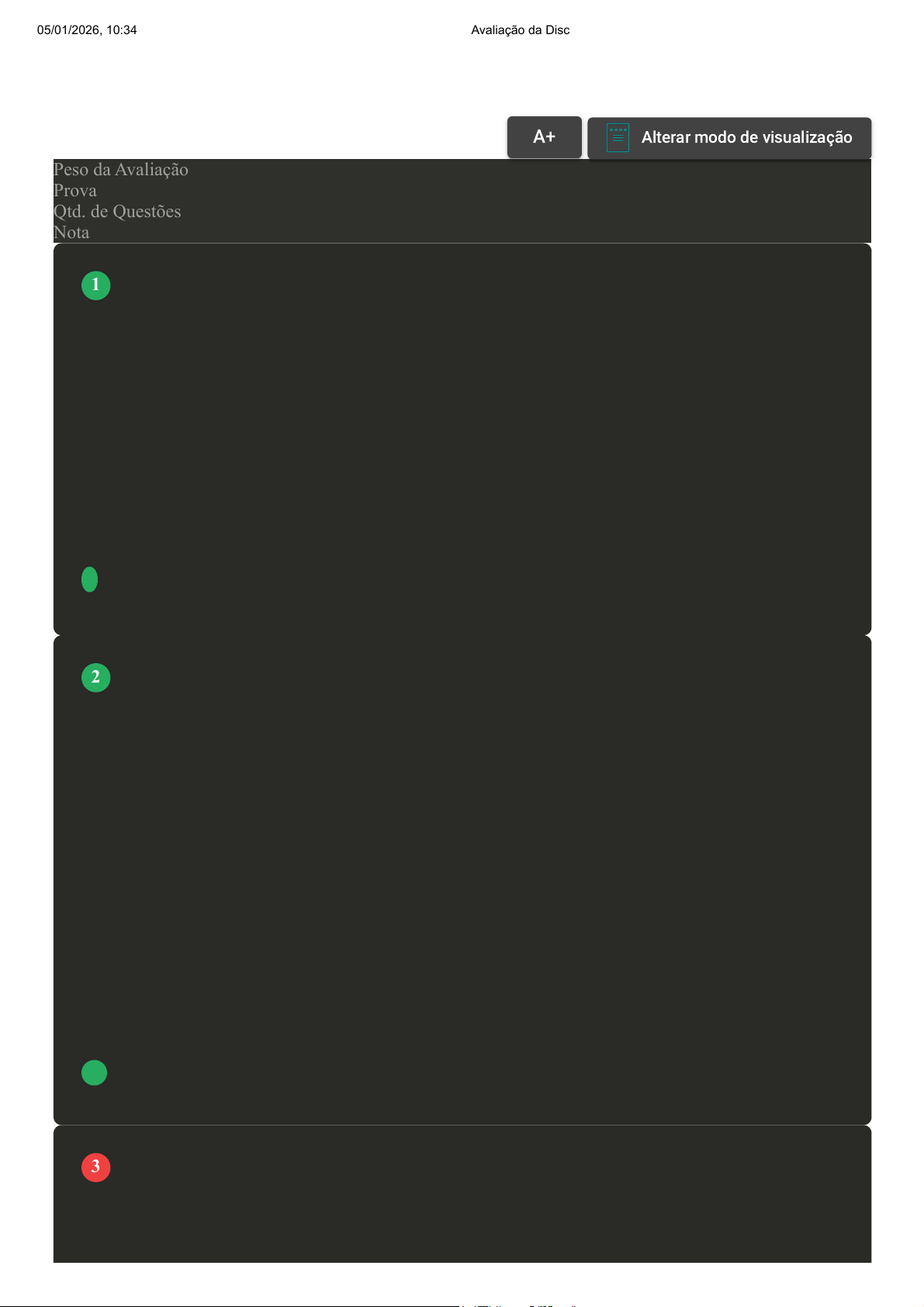 Prova Impressa GABARITO | Avaliação da Disciplina (Cod.:1519455) Peso da Avaliação 10,00 Prova 110656509 Qtd. de Questões 20 Nota 9,00 Diversos fatores podem interferir no desenvolvimento infantil. Um ambiente acolhedor, boas relações familiares, estímulos adequados, herança genética etc. No entanto, a nutrição também desempenha um papel importante no desenvolvimento neuromotor da criança. Diante do exposto, como a nutrição equilibrada e impacta o desenvolvimento motor? A Por meio da oferta de micronutrientes que influenciam diretamente o comportamento emocional, impactando indiretamente o desenvolvimento motor. B Ao atuar exclusivamente como fator preventivo de desnutrição severa, sem influência significativa sobre o sistema nervoso central ou a musculatura. C Ao não apresentar qualquer papel no desenvolvimento motor, uma vez que este é determinado por fatores genéticos e estímulos ambientais. D Ao fornecer substratos essenciais para a síntese de mielina e o funcionamento sináptico adequado, além de apoiar o desenvolvimento muscular e ósseo. A neurociência da aprendizagem considera as diferenças individuais no processo de aquisição de conhecimentos. Abrange uma área multidisciplinar que analisa os processos biológicos e neurais envolvidos na aquisição, retenção e aplicação de novos conhecimentos e habilidades. Dentre esses processos, observa-se a neuroplasticidade. Sobre a neuroplasticidade, classifique V para as sentenças verdadeiras e F para as falsas: ( ) O cérebro bloqueia a formação de novas conexões, de acordo com a experiência. ( ) O cérebro não muda com a experiências boas, só com as ruins. ( ) O cérebro se reorganiza em resposta a novas experiência. ( ) O cérebro altera suas conexões com base em experiências vividas. Assinale a alternativa CORRETA: A V – F – V – V. B F – V – F – V. C V – F – V – F. D F – F – V – V. O formato tradicional de ensino como o conhecemos trabalha uma abordagem de ensino uniforme e padronizada, isto é, não considera a individualidade inerente a cada aluno. No entanto novas abordagens vêm sendo trabalhadas em sala de aula, como a aprendizagem baseada em competências. VOLTAR A+ Alterar modo de visualização 1 2 3 05/01/2026, 10:34 Avaliação da Disciplina about:blank 1/8 Considerando as características do ensino tradicional, classifique V para as sentenças verdadeiras e F para as falsas: ( ) Avaliação por meio de provas dissertativas, desenvolvendo a competência escritora. ( ) Ênfase na memorização de conteúdo e na avaliação padronizada. ( ) Foco nas habilidades práticas e conhecimentos aplicáveis. ( ) Prioridade apenas no desenvolvimento de competências técnicas escolhidas individualmente por cada aluno. Assinale a alternativa que apresenta a sequência correta: A V – F – V – V. B V – V – V – F. C F – V – V – F. D F – V – F – V. O desenvolvimento da linguagem também está relacionado ao desenvolvimento cognitivo e motor. Atividades que integram o desenvolvimento motor e a linguagem são altamente eficazes para crianças de diferentes idades, pois unem habilidades físicas e comunicativas em um único contexto. Considerando atividades que integram o desenvolvimento motor e o desenvolvimento da linguagem de forma simultânea, classifique V para as sentenças verdadeiras e F para as falsas: ( ) Assistir vídeos. ( ) Cantar e bater palmas ao mesmo tempo. ( ) Conversar ao telefone ou em videochamada. ( ) Jogos de sequência. ( ) Brincadeiras com objetos manipulativos. ( ) Escutar música. Assinale a alternativa que apresenta a sequência correta. A F – F – V – F – V – F B F – V – F – V – V – F C V – V – F – F – V – V D V – V – F – V – F – V A aprendizagem ativa requer um engajamento ativo do cérebro em processos cognitivos complexos. A atenção possibilita focar seletivamente em informações julgadas pelo cérebro como relevantes enquanto se ignora o que é considerado irrelevante. Qual processo cognitivo está diretamente relacionado ao engajamento no aprendizado ativo? A Atenção focada. B Metacognição. 4 5 05/01/2026, 10:34 Avaliação da Disciplina about:blank 2/8 C Processamento inconsciente. D Inibição cognitiva. Pesquisas recentes mostram que o desenvolvimento infantil pode ser definido como a aquisição de conhecimento pela criança sobre o ambiente e suas origens, o que pode sofrer influência de fatores internos e externos. GOLDONI, M. E. M.; SANTOS, M. R. C. dos; ALVES, T. A. Fatores que influenciam no desenvolvimento neuropsicomotor de crianças de 4 anos, matriculadas em escolas públicas e privadas: uma revisão bibliográfica. Revista Ciências da FAP, [s. l.], n. 5, 2022. Disponível em: https://revistas.fadap.br/ciencias/article/view/30. Acesso em: 28 nov. 2024. Qual dos fatores a seguir é considerado um dos mais determinantes para o progresso motor infantil? A A faixa etária da criança que determina o seu desenvolvimento neunoral. B A quantidade de sono durante a noite. C A maturação do sistema nervoso central. D O número de neurônios disponíveis no momento da mielinização. A neurociência busca entender as estruturas cerebrais e suas funções específicas no comportamento e na cognição. Combinando diferentes disciplinas como biologia, psicologia, medicina e educação. As bases anatômicas da neurologia são primordiais para a compreensão de como ocorrer o processo de ensino e aprendizagem. ARIANA, A. Neurological diseases. New York: Thieme Medical Publishers, 2019. Qual área do cérebro está mais associada ao processamento auditivo? A Lobo frontal. B Lobo occipital. C Lobo parietal. D Lobo temporal. Um ambiente enriquecido contribui para o desenvolvimento neuromotor infantil. Quanto mais recursos diversos o ambiente tiver, mais a criança terá oportunidades para desenvolver suas percepções visuais, táteis e auditivas. Avalie as afirmações a seguir