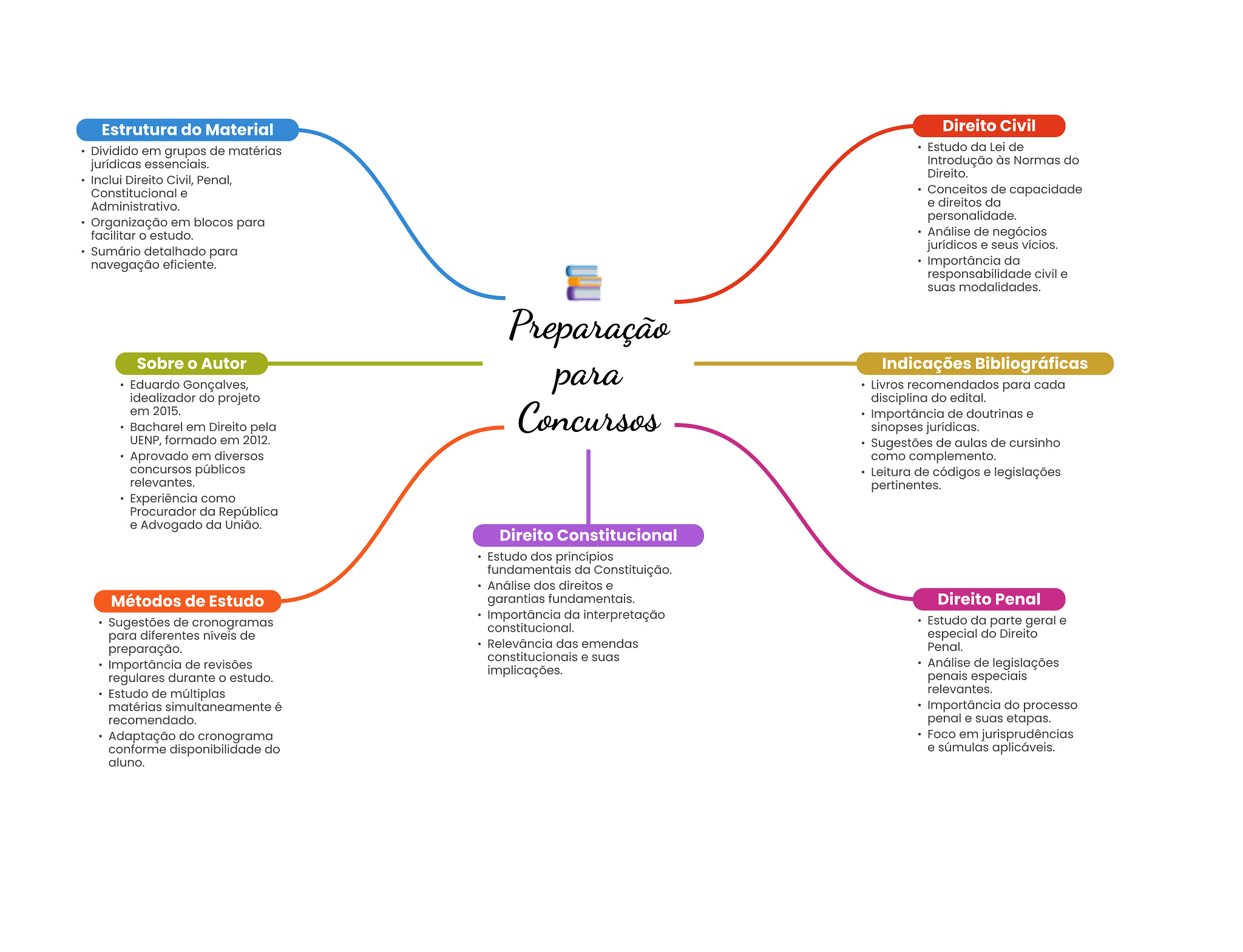 Estrutura do Material Direito Civil Dividido em grupos de matérias Estudo da Lei de jurídicas essenciais. Introdução às Normas do Direito. Inclui Direito Civil, Penal, Constitucional e Conceitos de capacidade Administrativo. e direitos da Organização em blocos para personalidade. facilitar estudo. Análise de negócios Sumário detalhado para jurídicos e seus vícios. navegação eficiente. Importância da responsabilidade civil e suas modalidades. Preparação Sobre Autor Indicações Bibliográficas Eduardo Gonçalves, para Livros recomendados para cada idealizador do projeto disciplina do edital. em 2015. Concursos Importância de doutrinas e Bacharel em Direito pela sinopses jurídicas. UENP, formado em 2012. Sugestões de aulas de cursinho Aprovado em diversos como complemento. concursos públicos Leitura de códigos e legislações relevantes. pertinentes. Experiência como Procurador da República e Advogado da União. Direito Constitucional Estudo dos princípios fundamentais da Constituição. Análise dos direitos e Métodos de Estudo garantias fundamentais. Direito Penal Importância da interpretação Sugestões de cronogramas Estudo da parte geral e constitucional. para diferentes níveis de especial do Direito Relevância das emendas preparação. Penal. constitucionais e suas Importância de revisões Análise de legislações implicações. regulares durante estudo. penais especiais Estudo de múltiplas relevantes. matérias é Importância do processo recomendado. penal e suas etapas. Adaptação do cronograma Foco em jurisprudências conforme disponibilidade do e súmulas aplicáveis. aluno.