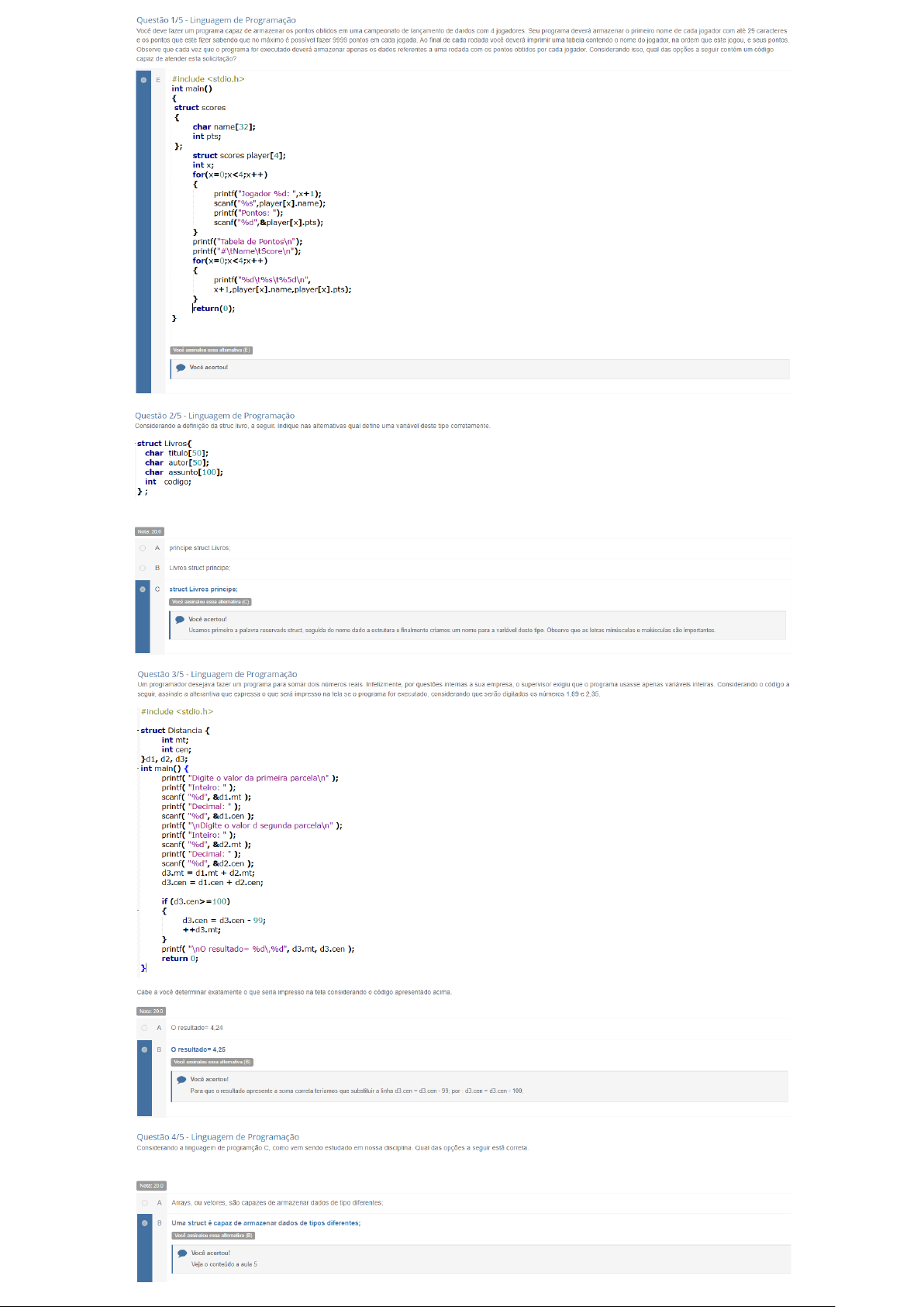 Questão 1/5 Linguagem de Programação Você deve fazer um programa capaz de armazenar pontos obtidos em uma campeonato de lançamento de dardos com 4 jogadores. Seu programa deverá armazenar primeiro nome de cada jogador com até 29 caracteres e pontos que este fizer sabendo que no máximo é possível fazer 9999 pontos em cada jogada Ao final de cada rodada você deverá imprimir uma tabela contendo nome do jogador, na ordem que este jogou, e seus pontos Observe que cada vez que 0 programa for executado deverá armazenar apenas dados referentes uma rodada com pontos obtidos por cada jogador. Considerando isso, qual das opções a seguir contém um código capaz de atender esta solicitação? E #include int main() { struct scores { char name[32]; int pts; }; struct scores player[4]; int for(x=0;x struct Distancia { int mt; int cen; d2, d3; int main() { printf( "Digite valor da primeira ); printf( "Inteiro: ); scanf( "%d", &d1.mt ); printf( "Decimal: ); scanf( "%d", &d1.cen ); printf( "\nDigite valor segunda ); printf( "Inteiro: ); scanf( "%d", &d2.mt ); printf( "Decimal: ); scanf( "%d", &d2.cen ); d3.mt = d1.mt + d2.mt; d3.cen = d1.cen + d2.cen; if (d3.cen>=100) { d3.cen = d3.cen 99; ++d3.mt; } printf( resultado= %d\,%d", d3.mt, d3.cen ); return 0; } Cabe a você determinar exatamente que seria impresso na tela considerando 0 código apresentado acima Nota: 20.0 A resultado= B resultado= 4,25 assinalou essa Você acertou! Para que resultado apresente soma correta teríamos que substituir linha d3 cen cen 99; por d3 cen d3 cen - 100; Questão 4/5 Linguagem de Programação Considerando a linguagem de programção C. como vem sendo estudado em nossa Qual das opções a seguir está 20.0 A Arrays, ou vetores, são capazes de armazenar dados de tipo diferentes: B Uma struct é capaz de armazenar dados de tipos Você assinalou essa alternativa Você acertou! Veja conteúdo aula 5Questão 5/5 Linguagem de Programação Seu professor solicitou sua ajuda para criar um programa para imprimir 0 relatório final de aproveitamento dos seus alunos. Para tal ele solicitou que você enviasse para ela a definição de uma struct capaz de armazenar 0 nome do aluno com até 20 caracteres e as notas de matemática, programação e física com até duas casa decimais. Qual das opções a seguir representa a struc capaz de atender a solicitação do seu professor? Nota: 20.0 A struct Aluno{ char name float programacao; float matematica; float fisica; }; B struct Aluno{ char name[21]; float programacao; float matematica; float fisica; }; Você assinalou essa alternativa (B) Você acertou!