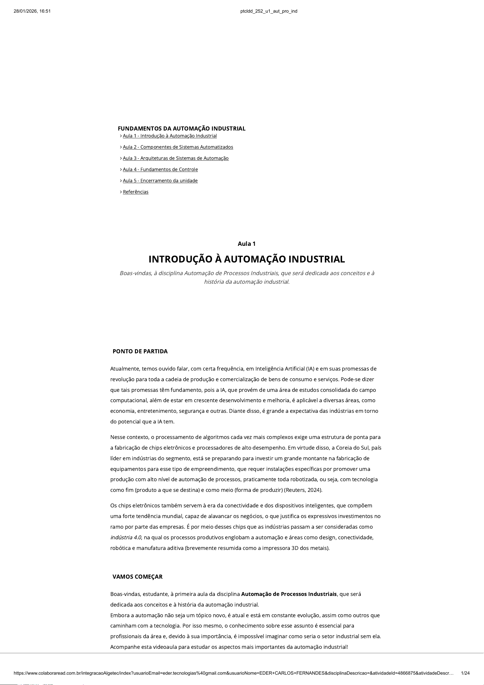 PONTO DE PARTIDA Atualmente, temos ouvido falar, com certa frequência, em Inteligência Artificial (IA) e em suas promessas de revolução para toda a cadeia de produção e comercialização de bens de consumo e serviços. Pode-se dizer que tais promessas têm fundamento, pois a IA, que provém de uma área de estudos consolidada do campo computacional, além de estar em crescente desenvolvimento e melhoria, é aplicável a diversas áreas, como economia, entretenimento, segurança e outras. Diante disso, é grande a expectativa das indústrias em torno do potencial que a IA tem. Nesse contexto, o processamento de algoritmos cada vez mais complexos exige uma estrutura de ponta para a fabricação de chips eletrônicos e processadores de alto desempenho. Em virtude disso, a Coreia do Sul, país líder em indústrias do segmento, está se preparando para investir um grande montante na fabricação de equipamentos para esse tipo de empreendimento, que requer instalações específicas por promover uma produção com alto nível de automação de processos, praticamente toda robotizada, ou seja, com tecnologia como fim (produto a que se destina) e como meio (forma de produzir) (Reuters, 2024). Os chips eletrônicos também servem à era da conectividade e dos dispositivos inteligentes, que compõem uma forte tendência mundial, capaz de alavancar os negócios, o que justifica os expressivos investimentos no ramo por parte das empresas. É por meio desses chips que as indústrias passam a ser consideradas como indústria 4.0, na qual os processos produtivos englobam a automação e áreas como design, conectividade, robótica e manufatura aditiva (brevemente resumida como a impressora 3D dos metais). VAMOS COMEÇAR Boas-vindas, estudante, à primeira aula da disciplina Automação de Processos Industriais, que será dedicada aos conceitos e à história da automação industrial. Embora a automação não seja um tópico novo, é atual e está em constante evolução, assim como outros que caminham com a tecnologia. Por isso mesmo, o conhecimento sobre esse assunto é essencial para profissionais da área e, devido à sua importância, é impossível imaginar como seria o setor industrial sem ela. Acompanhe esta videoaula para estudar os aspectos mais importantes da automação industrial! Aula 1 INTRODUÇÃO À AUTOMAÇÃO INDUSTRIAL Boas-vindas, à disciplina Automação de Processos Industriais, que será dedicada aos conceitos e à história da automação industrial. FUNDAMENTOS DA AUTOMAÇÃO INDUSTRIAL Aula 1 - Introdução à Automação Industrial Aula 2 - Componentes de Sistemas Automatizados Aula 3 - Arquiteturas de Sistemas de Automação Aula 4 - Fundamentos de Controle Aula 5 - Encerramento da unidade Referências 28/01/2026, 16:51 ptcldd_252_u1_aut_pro_ind https://www.colaboraread.com.br/integracaoAlgetec/index?usuarioEmail=eder.tecnologias%40gmail.com&usuarioNome=EDER+CARLOS+FERNANDES&disciplinaDescricao=&atividadeId=4866875&atividadeDescr… 1/24 Introdução à automação industrial Ao se analisar o cenário nacional, pode-se dizer que nem todas as indústrias estão preparadas para aproveitar a tecnologia plenamente e que faltam profissionais capacitados para promover maior automação nas indústrias. Diante desse contexto, infelizmente, a automatização nas indústrias acaba não sendo tão imediata, uma vez que é necessário adaptações e um caminho de boas decisões acerca de sua gestão e infraestrutura. Por outro lado, felizmente, se há melhorias a serem realizadas, há também oportunidades para profissionais preparados e aptos a realizarem essas atividades, dentre os quais esperamos que você esteja após o estudo desta disciplina! Ao longo da evolução da humanidade, a confecção de produtos para nossa subsistência mudou muito e impactou, inclusive, a forma como a sociedade se organiza. No início, toda produção tinha um caráter artesanal, mas, com o tempo, foi se especializando e acabou sendo mecanizada, até chegar ao nível de modernização que conhecemos atualmente, no qual essa produção está conectada com computadores e com o mínimo de intervenção humana. O primeiro passo desse processo foi a maximização da força humana por meio do uso de máquinas a vapor (Primeira Revolução Industrial), e o segundo foi a utilização de motores de combustão interna (Segunda Revolução Industrial). A inserção de dispositivos eletrônicos no processo produtivo tem destaque na Terceira Revolução Industrial, enquanto a tecnologia da informação deu início à Quarta Revolução Industrial, que chamamos popularmente de indústria 4.0 e que ainda não foi plenamente substituída pela Quinta Revolução, já em andamento. A descrição das Revoluções Industriais está apresentada na Figura 1, confira: Figura 1 - Revolução Industrial e Indústria 4.0 Fonte: adaptada de Nahavandi (2019). Uma observação importante é que mesmo máquinas puramente mecânicas podem proporcionar a automação da produção. Isso, que já ocorria nos anos 1960, recebeu o nome de automação de tipo rígido, que é quando uma máquina é construída para atender à uma atividade específica (Prudente, 2011). Sua principal desvantagem é o baixíssimo nível de ajustes ou adaptações, pois qualquer alteração torna necessário praticamente reconstruir a máquina, o que torna pouco viável esse tipo de automação. PRIMEIRA REVOLUÇÃO INDUSTRIAL (SÉCULO XVIII) Mecanização com máquinas a vapor e a carvão. SEGUNDA REVOLUÇÃO INDUSTRIAL (SÉCULO XIX) Linha de montagem para produção em massa, com máquinas elétricas e motores a combustão. TERCEIRA REVOLUÇÃO INDUSTRIAL (SÉCULO XX) Produção automatizada, presença de computadores e demais dispositivos eletrônicos. QUARTA REVOLUÇÃO INDUSTRIAL (INÍCIO DO SÉCULO XXI) Utilização de IA, Big Data, Internet das Coisas e sistemas cyber-físicos para uma produção inteligente. QUINTA REVOLUÇÃO INDUSTRIAL (S
