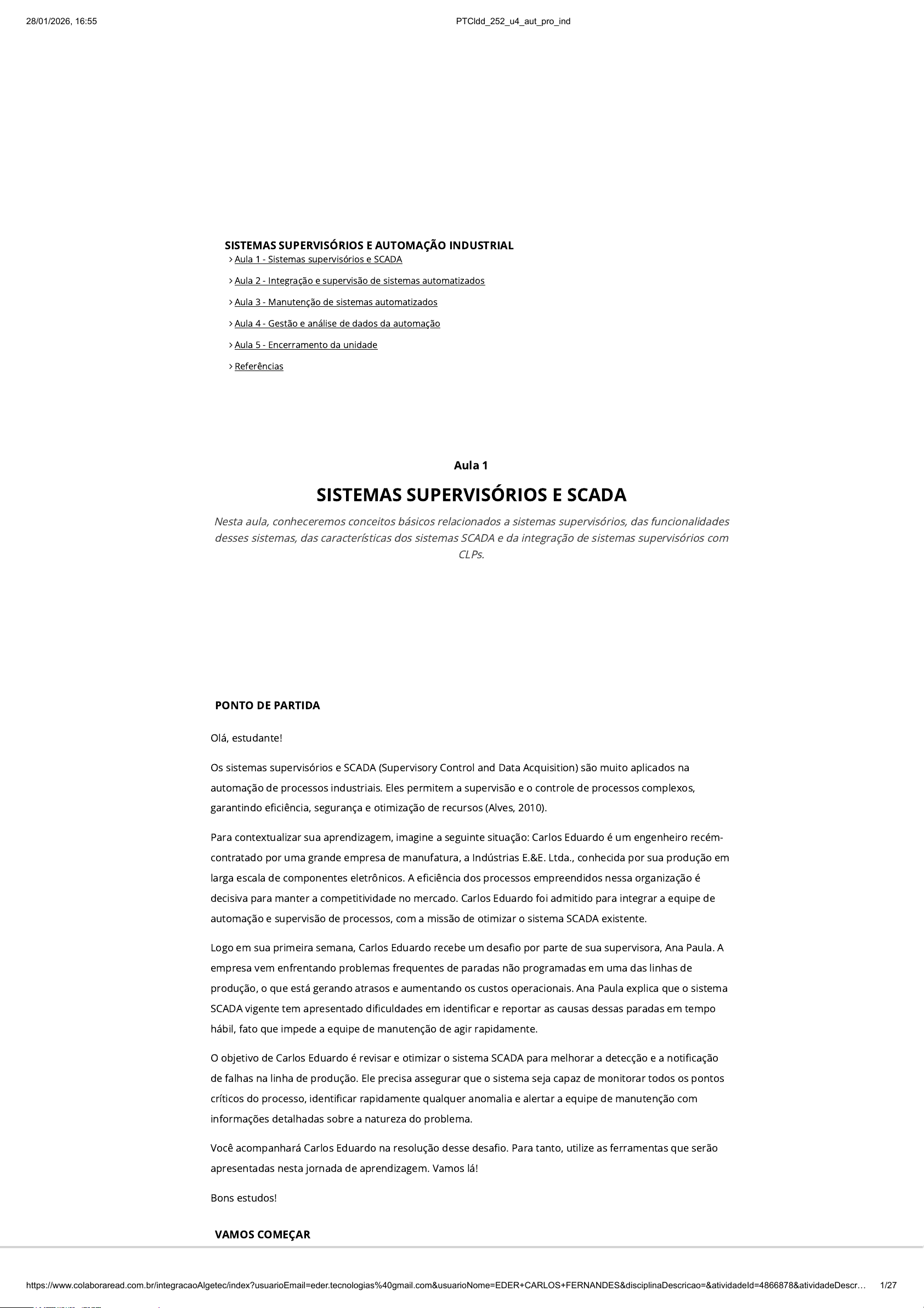 PONTO DE PARTIDA Olá, estudante! Os sistemas supervisórios e SCADA (Supervisory Control and Data Acquisition) são muito aplicados na automação de processos industriais. Eles permitem a supervisão e o controle de processos complexos, garantindo eficiência, segurança e otimização de recursos (Alves, 2010). Para contextualizar sua aprendizagem, imagine a seguinte situação: Carlos Eduardo é um engenheiro recém- contratado por uma grande empresa de manufatura, a Indústrias E.&E. Ltda., conhecida por sua produção em larga escala de componentes eletrônicos. A eficiência dos processos empreendidos nessa organização é decisiva para manter a competitividade no mercado. Carlos Eduardo foi admitido para integrar a equipe de automação e supervisão de processos, com a missão de otimizar o sistema SCADA existente. Logo em sua primeira semana, Carlos Eduardo recebe um desafio por parte de sua supervisora, Ana Paula. A empresa vem enfrentando problemas frequentes de paradas não programadas em uma das linhas de produção, o que está gerando atrasos e aumentando os custos operacionais. Ana Paula explica que o sistema SCADA vigente tem apresentado dificuldades em identificar e reportar as causas dessas paradas em tempo hábil, fato que impede a equipe de manutenção de agir rapidamente. O objetivo de Carlos Eduardo é revisar e otimizar o sistema SCADA para melhorar a detecção e a notificação de falhas na linha de produção. Ele precisa assegurar que o sistema seja capaz de monitorar todos os pontos críticos do processo, identificar rapidamente qualquer anomalia e alertar a equipe de manutenção com informações detalhadas sobre a natureza do problema. Você acompanhará Carlos Eduardo na resolução desse desafio. Para tanto, utilize as ferramentas que serão apresentadas nesta jornada de aprendizagem. Vamos lá! Bons estudos! VAMOS COMEÇAR Aula 1 SISTEMAS SUPERVISÓRIOS E SCADA Nesta aula, conheceremos conceitos básicos relacionados a sistemas supervisórios, das funcionalidades desses sistemas, das características dos sistemas SCADA e da integração de sistemas supervisórios com CLPs. SISTEMAS SUPERVISÓRIOS E AUTOMAÇÃO INDUSTRIAL Aula 1 - Sistemas supervisórios e SCADA Aula 2 - Integração e supervisão de sistemas automatizados Aula 3 - Manutenção de sistemas automatizados Aula 4 - Gestão e análise de dados da automação Aula 5 - Encerramento da unidade Referências 28/01/2026, 16:55 PTCldd_252_u4_aut_pro_ind https://www.colaboraread.com.br/integracaoAlgetec/index?usuarioEmail=eder.tecnologias%40gmail.com&usuarioNome=EDER+CARLOS+FERNANDES&disciplinaDescricao=&atividadeId=4866878&atividadeDescr… 1/27 Olá, estudante! Nesta videoaula, conheceremos conceitos básicos relacionados a sistemas supervisórios, das funcionalidades desses sistemas, das características dos sistemas SCADA e da integração de sistemas supervisórios com CLPs. Esses conteúdos são de grande importância para sua prática profissional, pois tratam de sistemas muito utilizados na indústria atual. Convidamos você a assistir a este material para consolidar seu entendimento sobre a teoria apresentada. Desejamos um bom momento de estudos! Vamos lá! Sistemas supervisórios e SCADA Olá, estudante! Os conceitos básicos relacionados aos sistemas supervisórios, às funcionalidades e características dos sistemas SCADA, e à integração desses sistemas com Controladores Lógicos Programáveis (CLPs) são fundamentais para aplicações em indústrias dos mais variados segmentos e portes (Filippo Filho, 2014). Os sistemas supervisórios são plataformas de software projetadas para monitorar e controlar processos industriais. Eles coletam dados em tempo real de dispositivos de campo, como sensores e atuadores, além de apresentarem essas informações de maneira compreensível para os operadores. Permitem, ainda, a intervenção manual ou automática para ajustar os parâmetros do processo. De acordo com Alves (2010, [s. p.]), “os sistemas supervisórios têm como principal objetivo fornecer uma interface amigável entre o operador e o processo, facilitando a tomada de decisões e a intervenção em tempo real”. Tais sistemas são essenciais para assegurar a eficiência operacional e a segurança dos processos industriais. A Figura 1, a seguir, mostra o esquema de um SCADA para uma estação de bombeamento. Figura 1 | Esquema de SCADA para uma estação de bombeamento Fonte: Wikimedia Commons. Os principais componentes de um sistema supervisório são: a interface homem-máquina (IHM), que viabiliza a interação entre o operador e o sistema; os servidores de dados, que coletam e armazenam dados de campo; as redes de comunicação, que facilitam a transferência de dados entre dispositivos de campo e servidores; e o software de supervisão, que processa e apresenta os dados coletados. Lamb (2015, [s. p.]) destaca que “os sistemas supervisórios oferecem diversas vantagens, como a redução de custos operacionais, aumento da produtividade, melhoria na qualidade do produto e maior segurança operacional”. Além disso, permitem a análise de dados históricos para uma otimização contínua dos processos. Os sistemas SCADA são uma evolução dos sistemas supervisórios, fornecendo funcionalidades avançadas para controle e aquisição de dados em larga escala. São amplamente utilizados em setores como energia, água, petróleo e gás, e manufatura. A arquitetura de um sistema SCADA é composta por quatro níveis principais, elencados na Figura 2. Figura 2 | Arquitetura do sistema SCADA Nível de gerenciamento Abrange sistemas de gestão e análise de dados. Nível de supervisão Compreende servidores SCADA e IHMs. Nível de comunicação Envolve redes e protocolos de comunicação. 28/01/2026, 16:55 PTCldd_252_u4_aut_pro_ind https://www.colaboraread.com.br/integracaoAlgetec/index?usuarioEmail=eder.tecnologias%40gmail.com&usuarioNome=EDER+CARLOS+FERNANDES&disciplinaDescricao=&a