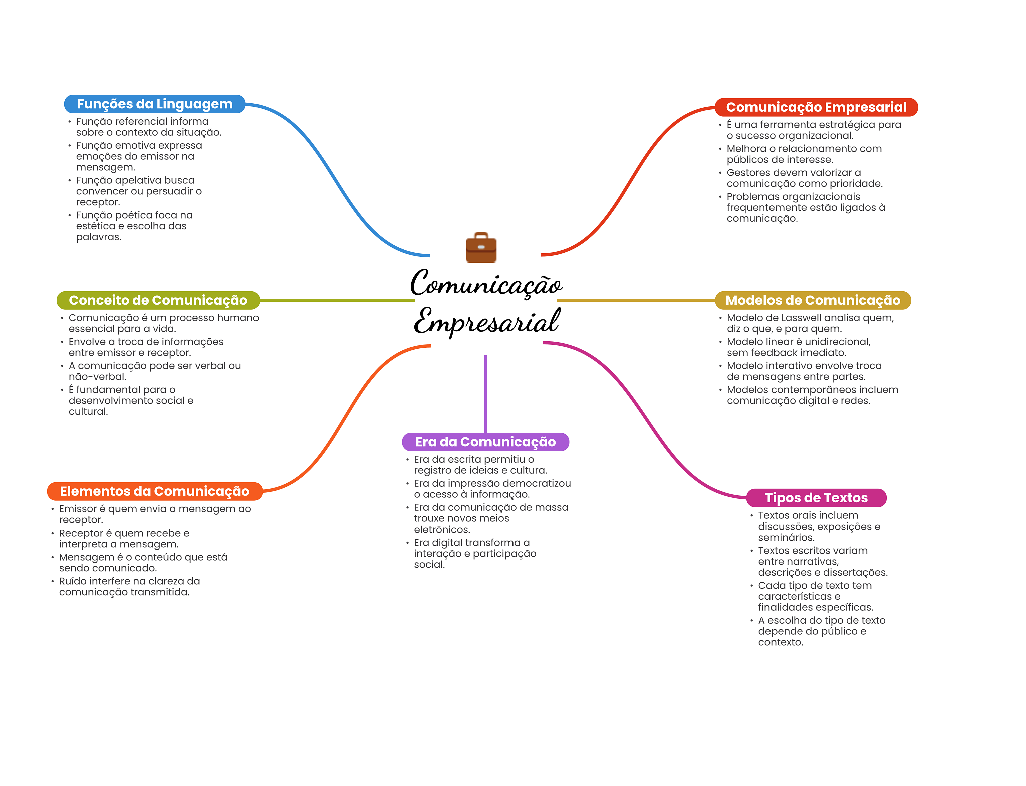 Funções da Linguagem Comunicação Empresarial Função referencial informa É uma ferramenta estratégica para sobre contexto da situação. sucesso organizacional. Função emotiva expressa Melhora relacionamento com emoções do emissor na públicos de interesse. mensagem. Gestores devem valorizar a Função apelativa busca comunicação como prioridade. convencer ou persuadir receptor. Problemas organizacionais frequentemente estão ligados à Função poética foca na comunicação. estética e escolha das palavras. Comunicação Conceito de Comunicação Modelos de Comunicação Comunicação é um processo humano essencial para a vida. Empresarial Modelo de Lasswell analisa quem, diz O que, e para quem. Envolve a troca de informações Modelo linear é unidirecional, entre emissor e receptor. sem feedback imediato. A comunicação pode ser verbal ou Modelo interativo envolve troca não-verbal. de mensagens entre partes. É fundamental para Modelos contemporâneos incluem desenvolvimento social e comunicação digital e redes. cultural. Era da Comunicação Era da escrita permitiu registro de ideias e cultura. Era da impressão democratizou Elementos da Comunicação acesso à informação. Tipos de Textos Emissor é quem envia a mensagem ao Era da comunicação de massa receptor. trouxe novos meios Textos orais incluem Receptor é quem recebe e eletrônicos. discussões, exposições e seminários. interpreta a mensagem. Era digital transforma a interação e participação Textos escritos variam Mensagem é conteúdo que está social. entre narrativas, sendo comunicado. descrições e dissertações. Ruído interfere na clareza da Cada tipo de texto tem comunicação transmitida. características e finalidades específicas. A escolha do tipo de texto depende do público e contexto.
