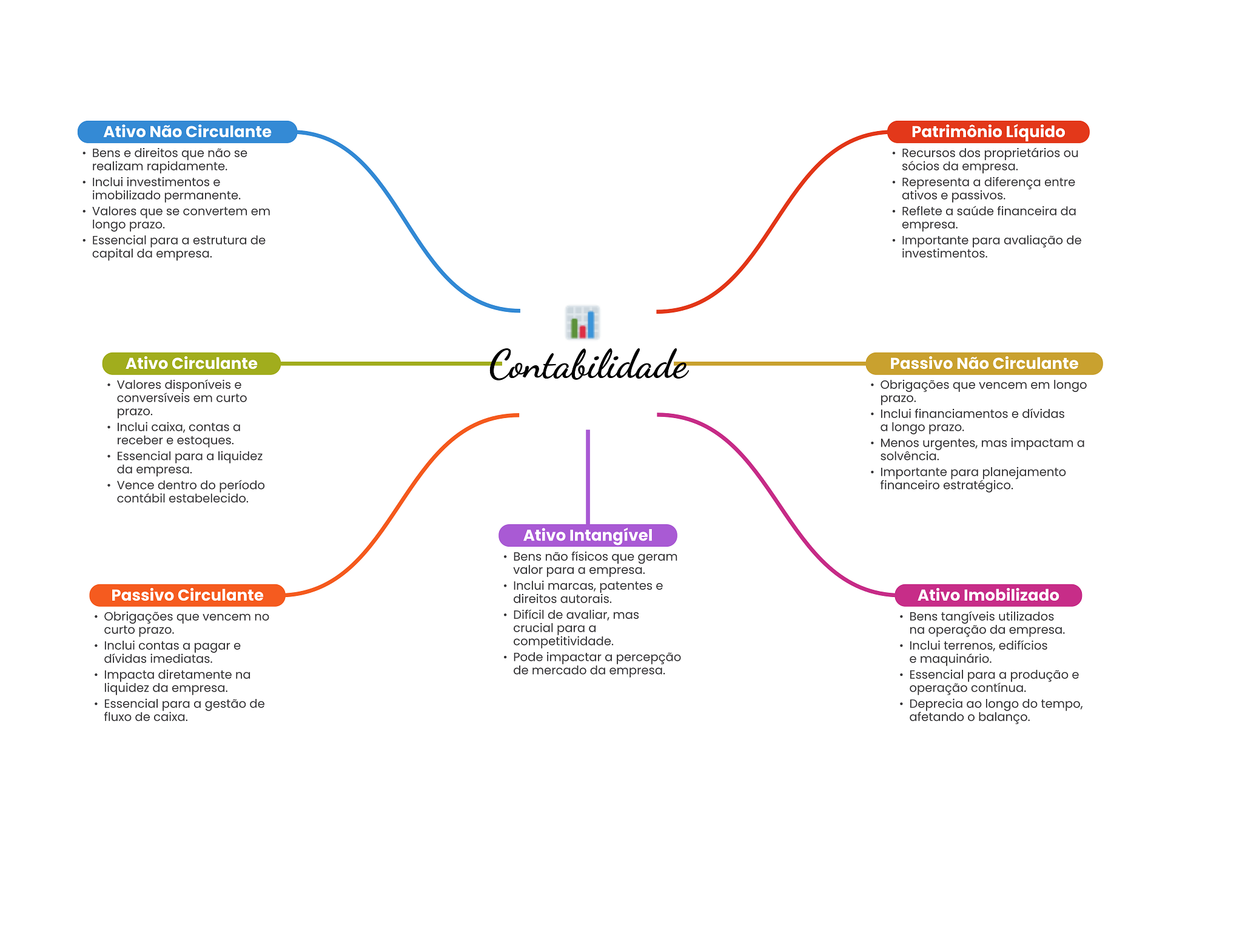 Ativo Não Circulante Patrimônio Líquido Bens e direitos que não se Recursos dos proprietários ou realizam rapidamente. sócios da empresa. Inclui investimentos e Representa a diferença entre imobilizado permanente. ativos e passivos. Valores que se convertem em Reflete a saúde financeira da longo prazo. empresa. Essencial para a estrutura de Importante para avaliação de capital da empresa. investimentos. Ativo Circulante Contabilidade Passivo Não Circulante Valores disponíveis e Obrigações que vencem em longo conversíveis em curto prazo. prazo. Inclui financiamentos e dívidas Inclui caixa, contas a a longo prazo. receber e estoques. Menos urgentes, mas impactam a Essencial para a liquidez solvência. da empresa. Importante para planejamento Vence dentro do período financeiro estratégico. contábil estabelecido. Ativo Intangível Bens não físicos que geram valor para a empresa. Inclui marcas, patentes e Passivo Circulante direitos autorais. Ativo Imobilizado Obrigações que vencem no Difícil de avaliar, mas Bens tangíveis utilizados curto prazo. crucial para a na operação da empresa. Inclui contas a pagar e competitividade. Inclui terrenos, edifícios dívidas imediatas. Pode impactar a percepção e maquinário. Impacta diretamente na de mercado da empresa. Essencial para a produção e liquidez da empresa. operação contínua. Essencial para a gestão de Deprecia ao longo do tempo, fluxo de caixa. afetando balanço.