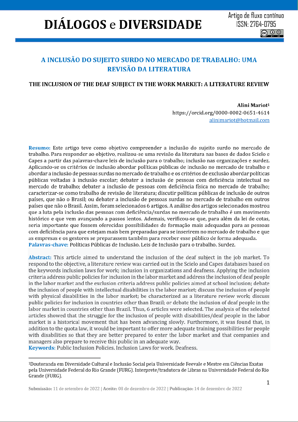Artigo de fluxo contínuo DIÁLOGOS e DIVERSIDADE ISSN: 2764-0795 A INCLUSÃO DO SUJEITO SURDO NO MERCADO DE TRABALHO: UMA REVISÃO DA LITERATURA THE INCLUSION OF THE DEAF SUBJECT IN THE WORK MARKET: A LITERATURE REVIEW Alini Mariot1 https://orcid.org/0000-0002-0651-4614 alinimariot@hotmail.com Resumo: Este artigo teve como objetivo compreender a inclusão do sujeito surdo no mercado de trabalho. Para responder ao objetivo, realizou-se uma revisão da literatura nas bases de dados Scielo e Capes a partir das palavras-chave leis de inclusão para o trabalho; inclusão nas organizações e surdez. Aplicando-se os critérios de inclusão abordar políticas públicas de inclusão no mercado de trabalho e abordar a inclusão de pessoas surdas no mercado de trabalho e os critérios de exclusão abordar políticas públicas voltadas à inclusão escolar; debater a inclusão de pessoas com deficiência intelectual no mercado de trabalho; debater a inclusão de pessoas com deficiência física no mercado de trabalho; caracterizar-se como trabalho de revisão de literatura; discutir políticas públicas de inclusão de outros países, que não o Brasil; ou debater a inclusão de pessoas surdas no mercado de trabalho em outros países que não o Brasil. Assim, foram selecionados 6 artigos. A análise dos artigos selecionados mostrou que a luta pela inclusão das pessoas com deficiência/surdas no mercado de trabalho é um movimento histórico e que vem avançando a passos lentos. Ademais, verificou-se que, para além da lei de cotas, seria importante que fossem oferecidas possibilidades de formação mais adequadas para as pessoas com deficiência para que estejam mais bem preparadas para se inserirem no mercado de trabalho e que as empresas e os gestores se preparassem também para receber esse público de forma adequada. Palavras-chave: Políticas Públicas de Inclusão. Leis de Inclusão para trabalho. Surdez. Abstract: This article aimed to understand the inclusion of the deaf subject in the job market. To respond to the objective, a literature review was carried out in the Scielo and Capes databases based on the keywords inclusion laws for work; inclusion in organizations and deafness. Applying the inclusion criteria address public policies for inclusion in the labor market and address the inclusion of deaf people in the labor market and the exclusion criteria address public policies aimed at school inclusion; debate the inclusion of people with intellectual disabilities in the labor market; discuss the inclusion of people with physical disabilities in the labor market; be characterized as a literature review work; discuss public policies for inclusion in countries other than Brazil; or debate the inclusion of deaf people in the labor market in countries other than Brazil. Thus, 6 articles were selected. The analysis of the selected articles showed that the struggle for the inclusion of people with disabilities/deaf people in the labor market is a historical movement that has been advancing slowly. Furthermore, it was found that, in addition to the quota law, it would be important to offer more adequate training possibilities for people with disabilities that they are better prepared to enter the labor market and that companies and managers also prepare to receive this public in an adequate way. Keywords: Public Inclusion Policies. Inclusion Laws for work. Deafness. em Diversidade Cultural e Inclusão Social pela Universidade Feevale e Mestre em Ciências Exatas pela Universidade Federal do Rio Grande (FURG). Interprete/tradutora de Libras na Universidade Federal do Rio Grande (FURG). 1 Submissão: 11 de setembro de 2022 Aceite: 08 de dezembro de 2022 Publicação: 14 de dezembro de 2022INTRODUÇÃO A inclusão de todos e de todas é permeada pelas políticas públicas e vem crescendo no período contemporâneo. Isso porque estão sendo abertos espaços que visam garantir a inclusão social como um todo e promovidas ações afirmativas que visam diminuir um tratamento de desvantagem social para algumas classes consideradas minorias, como é caso das pessoas com alguma necessidade específica que estão sendo inseridas no mercado de trabalho através das cotas. A reserva de vagas para mercado de trabalho dá-se pela lei de cotas (art. 93 da Lei 8.213/91), a qual estabelece que empresas com cem ou mais empregados devem preencher dois a cinco porcento de seus cargos com pessoas com deficiência. A reserva de vagas depende, assim, do número total de empregados que a empresa possui, ou seja, a empresa que atende esses requisitos é "obrigada" a contratar pessoas com deficiência e, se não fizer, será multada. As deficiências são inúmeras e incluem tanto deficiências físicas quanto intelectuais. que não fica claro na lei é como a inclusão deve ser realizada. No caso das deficiências físicas, temos a Lei 10.098, de 19 de dezembro de 2000, que estabelece normas e critérios de acessibilidade para pessoas com deficiência ou com mobilidade reduzida. Essa mesma acessibilidade, contudo, não está garantida para as pessoas com deficiência ou dificuldade intelectual tampouco para o sujeito surdo, o qual até tem direito a um intérprete na escola e em eventos, mas, no dia a dia, precisa encontrar suas próprias soluções para comunicar-se com os ouvintes. Foi nesse contexto que se desenvolveu este artigo, que teve como objetivo compreender como se dá processo de inclusão do sujeito surdo no mercado de trabalho no Brasil. Para tanto, realizou-se uma revisão da literatura, com vistas a identificar trabalhos já desenvolvidos sobre tema e estabelecer o estado da arte. PROCEDIMENTOS METODOLÓGICOS Para desenvolver este trabalho, que se caracteriza como uma revisão da literatura, realizaram-se os seguintes procedimentos: escolha das bases de dados; definição dos termos de busca; busca dos trabalhos; estabelecimento de critérios de inclusão e exclusão; seleção dos artigos e revisão e 